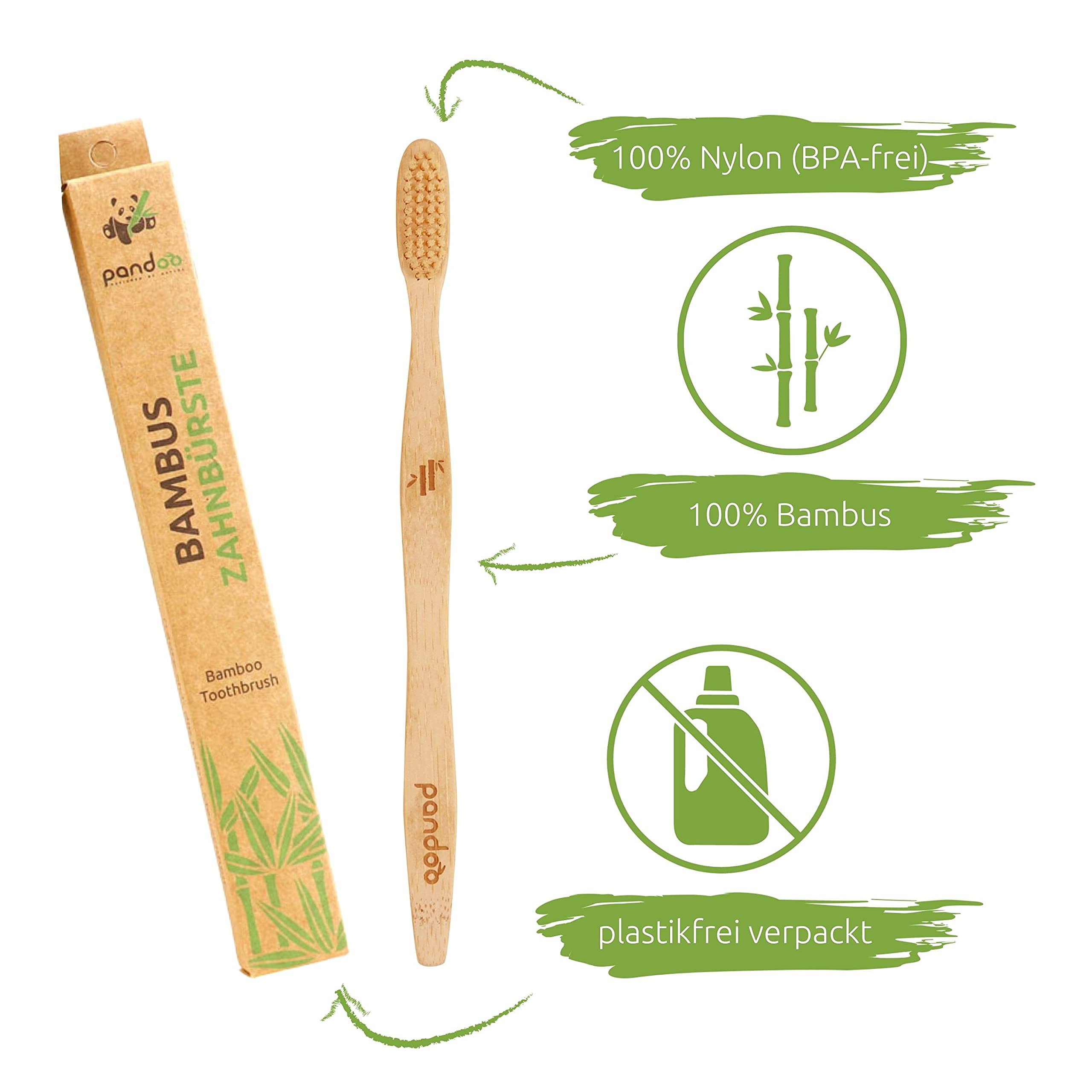 Die pandoo Zahnbürsten sind die nachhaltige Alternative zu herkömmlichen Bürsten aus Plastik & Holz. Sie sind zum aller grössten Teil aus natürlichem Bambus gefertigt. Die Zahnbürste eignet sich perfekt für den täglichen Gebrauch, ist sehr gut verarbeitet und stabil. Ausserdem sind Sie nachhaltig, vegan, angenehm weich und robust.