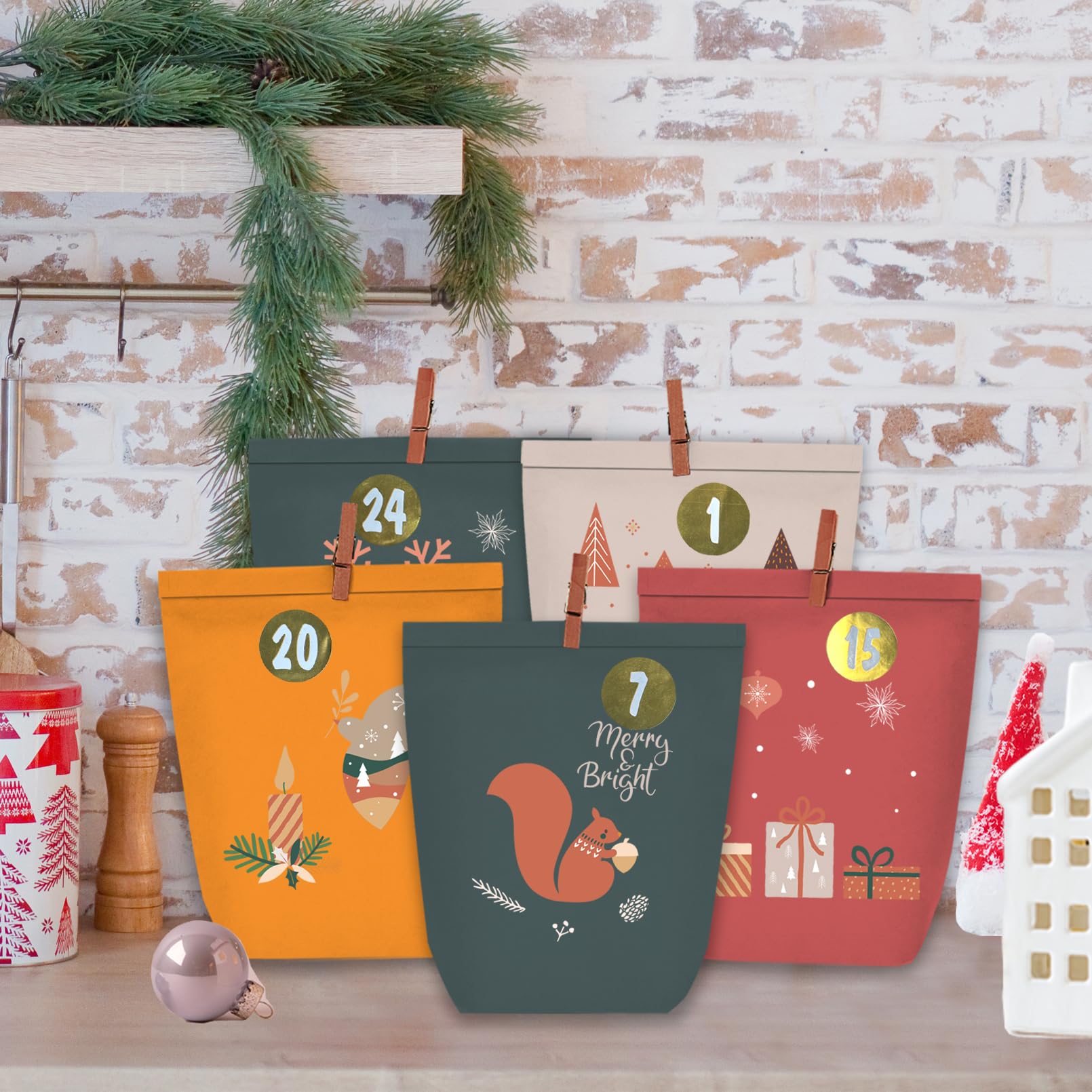 PANSIBY Adventskalender zum Befüllen, 24 Weihnachtskalender Geschenktüten zum Selber Basteln, Papiertüten mit Aufklebern zum Selbst Füllen, Kraftpapiertüten Boho Advents Selbstbefüllen