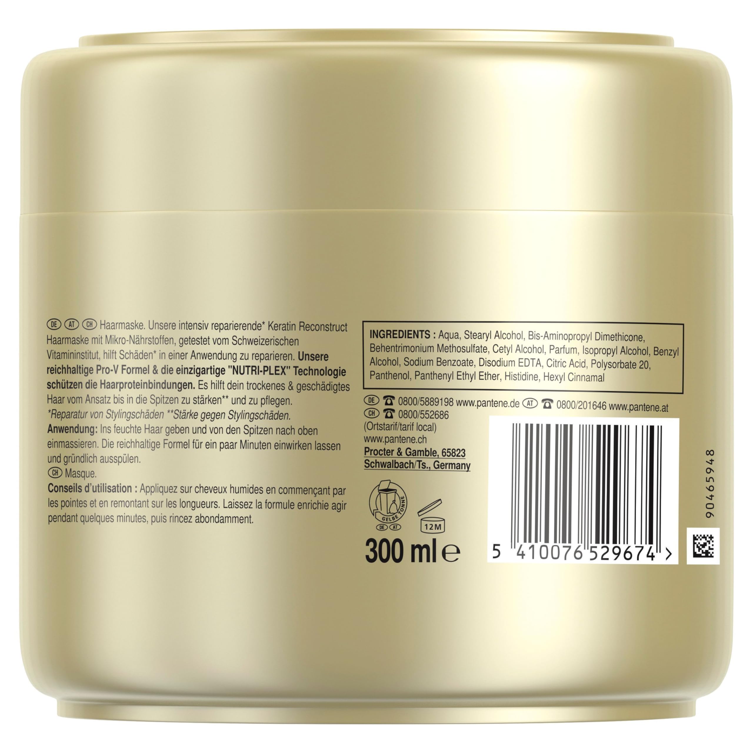 Pantene Pro-V Repair & Care Keratin Reconstruct Haarmaske, Haarkur Trockenes Haar, Haarpflege Trockenes Haar, Haarpflege Für Trockene Haare, Haarpflege Glanz, Für Geschädigtes Haar, Gold, 300ml