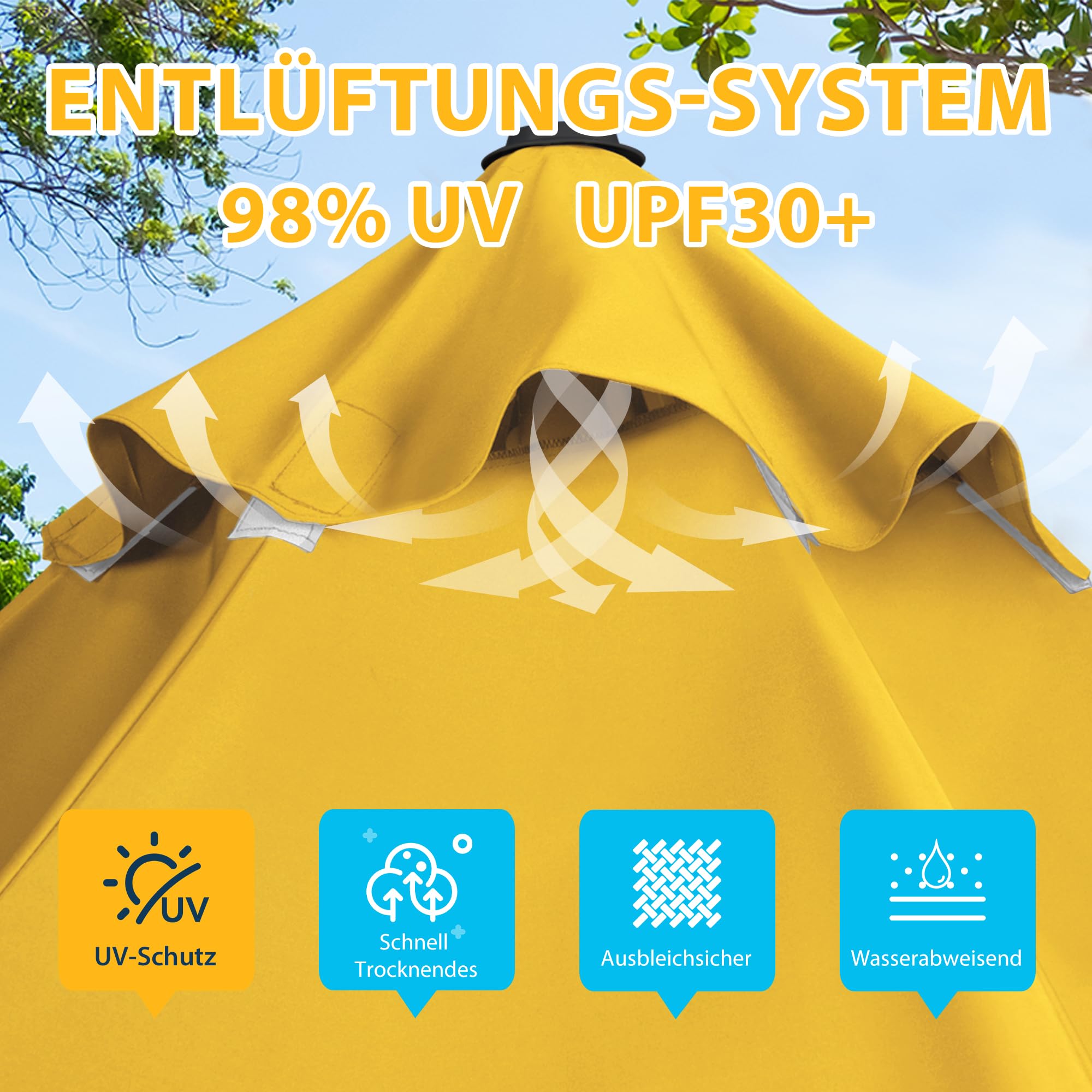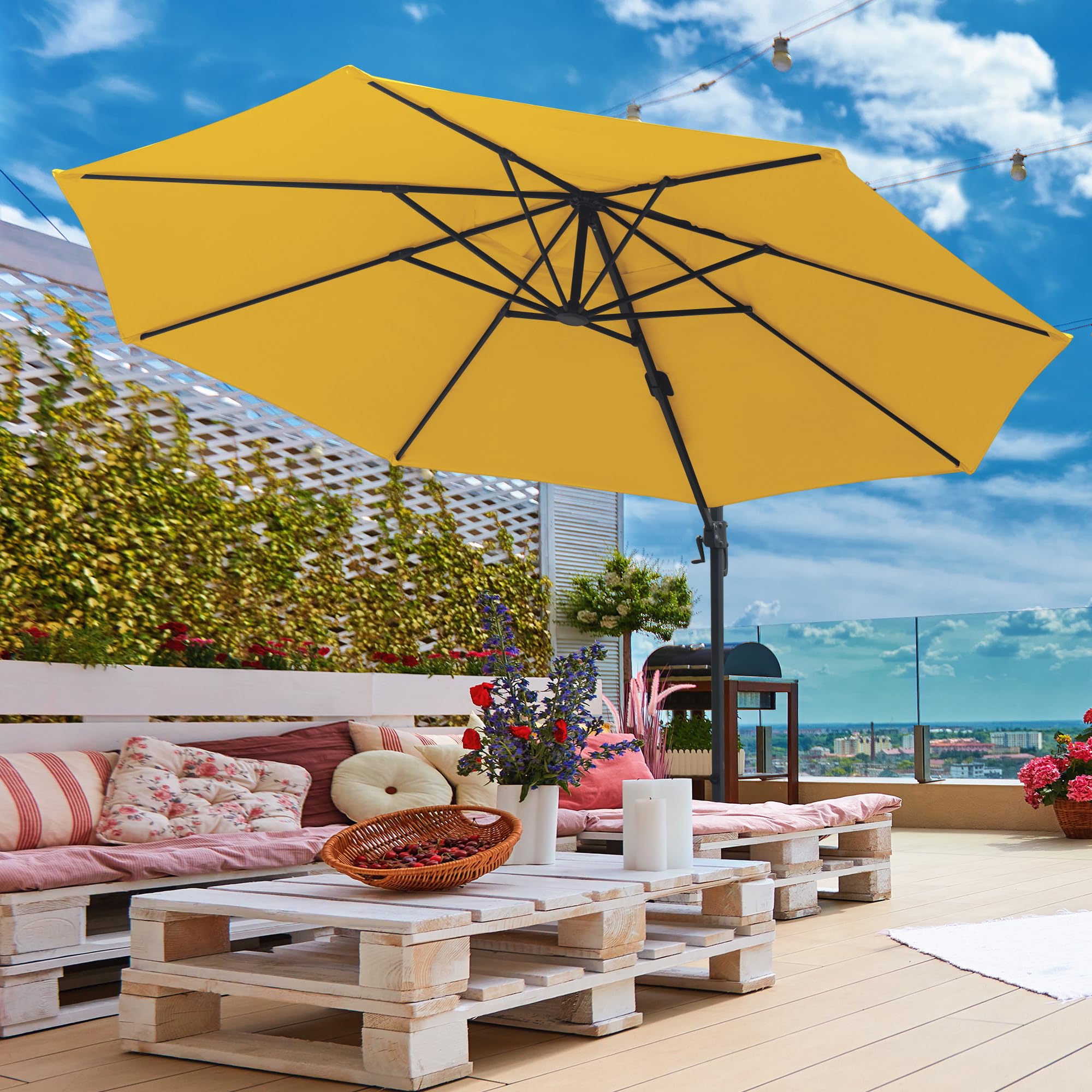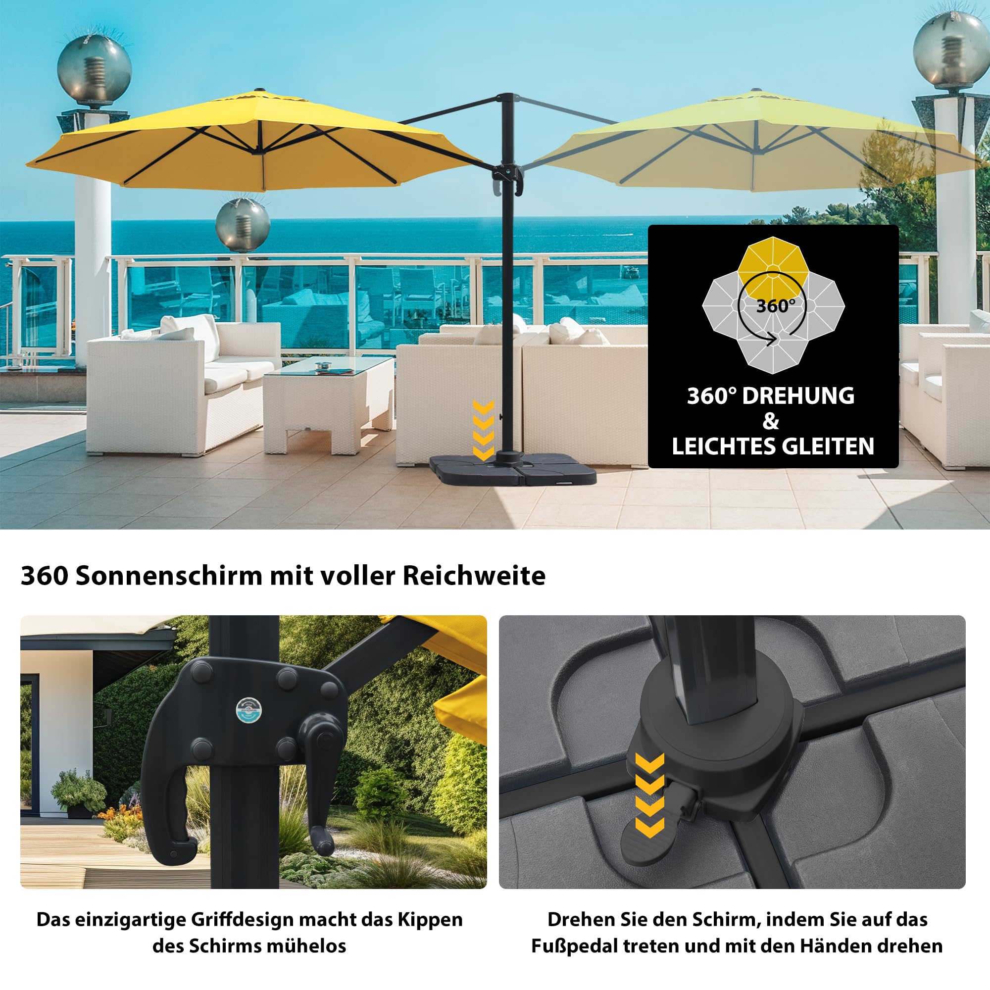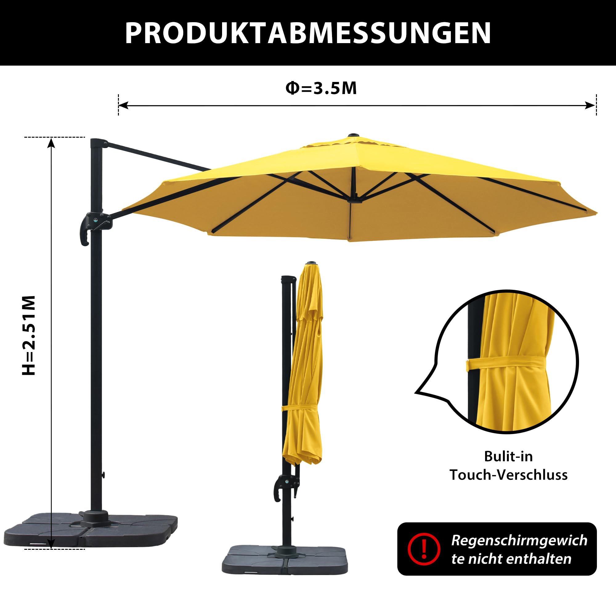 paramondo parapenda Sonnenschirm Ampelschirm aus 230 g/㎡ Polyesterfaser, Rund, Ø 3,5 m, 360° Schwenkbar, Kurbelbedienung, Gelb, Stahl-Standkreuz und Gestell in Anthrazit, 20.6kg