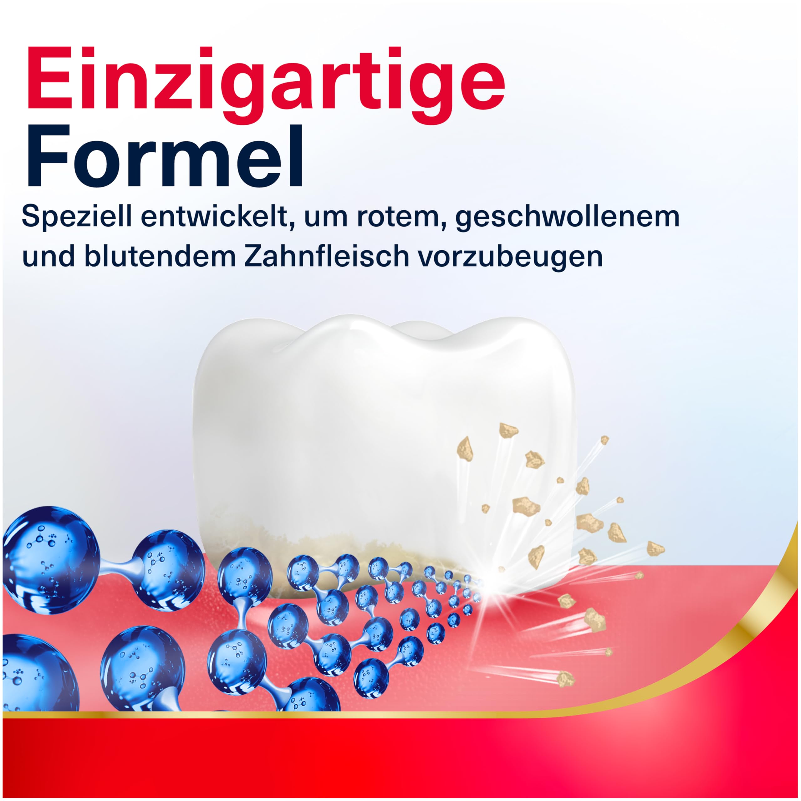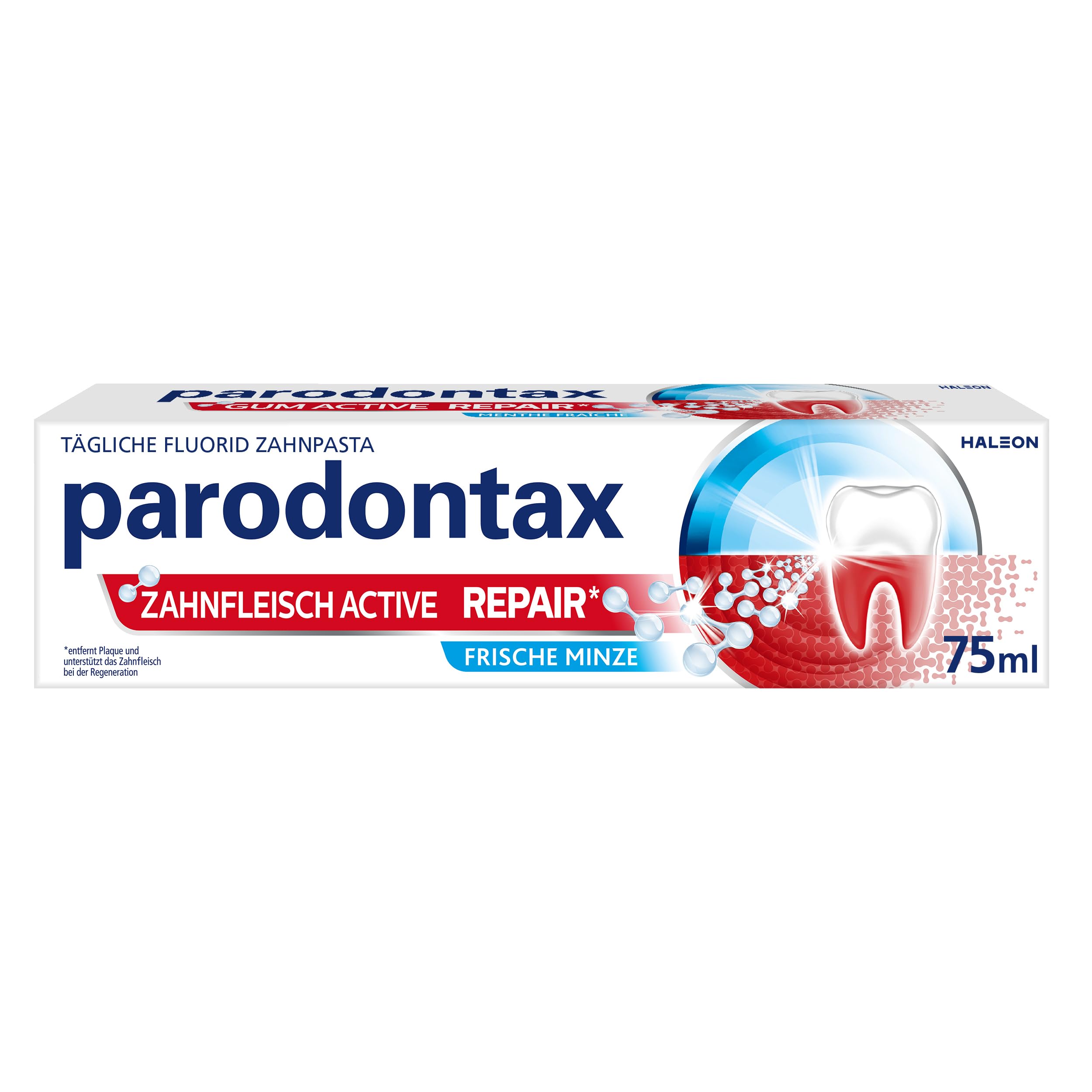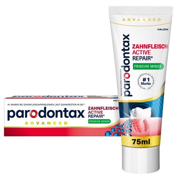 Gesundes Zahnfleisch umschliesst die Zähne eng. Wenn sich Plaque-Bakterien entlang des Zahnfleischrandes ansammeln, kann dies zu Reizungen führen, wodurch das Zahnfleisch nicht mehr so eng am Zahn anliegen kann. Dies kann zu blutendem und geschwollenem Zahnfleisch führen. parodontax Zahnfleisch Active Repair* bekämpft gezielt die Ursache von Zahnfleischproblemen. Sie wurde speziell entwickelt um das Zahnfleischbluten durch die gezielte Entfernung von Plaque zu reduzieren und vorzubeugen. So unterstützt Zahnfleisch Active Repair* das Zahnfleisch bei der Regeneration. Bei zweimal täglichem Zähneputzen hilft die Zahnpasta nachweislich, Zahnfleischbluten zu reduzieren und vorzubeugen. BEFOLGEN SIE STETS DIE ANWENDUNGSHINWEISE: 2x bis max. 3x pro Tag Zähneputzen, dann ausspucken, Schlucken vermeiden. Ausserhalb der Reichweite von Kindern aufbewahren. Nicht für Kinder unter 12 Jahren geeignet. Bei Unverträglichkeit absetzen. Bei beschädigtem Siegel nicht verwenden. *Entfernt Plaque und unterstützt das Zahnfleisch bei der Regeneration. **Nach einer professionellen Zahnreinigung bei 2 x täglichem Zähneputzen im Vergleich zu einer herkömmlichen Zahnpasta (ohne Natriumbicarbonat)