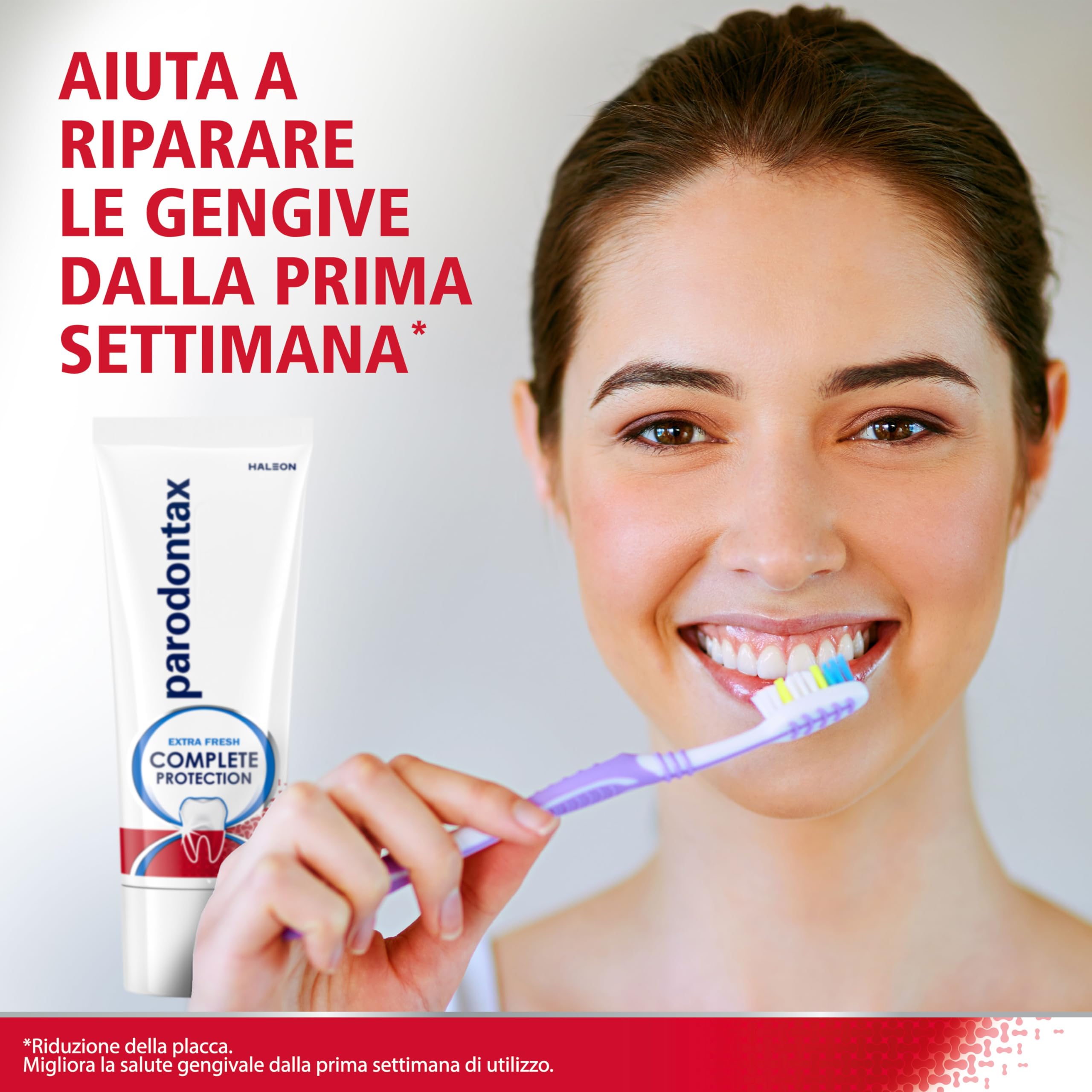 • Die Parodontax Complete Protection Extra-Fresh-Zahnpasta hilft, Zahnfleischblutungen durch die Ansammlung von bakteriellem Plaque zu reduzieren und zu verhindern, 2 mal täglich angewendet