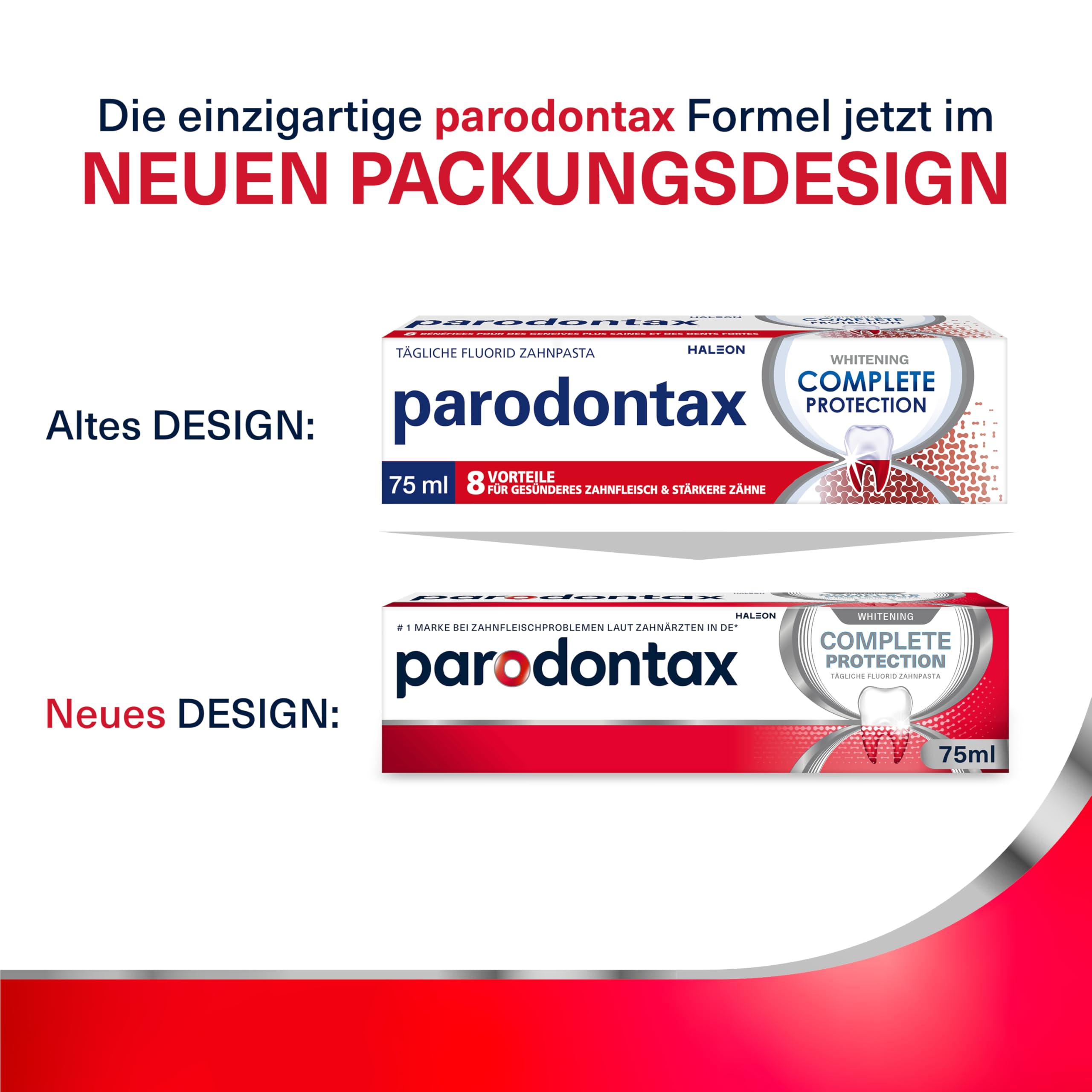 Wenn Sie beim Zähneputzen oder beim Benutzen von Zahnseide Blut sehen, kann dies ein Anzeichen einer Zahnfleischerkrankung sein. parodontax ist die von Zahnärzten meistempfohlene Marke bei Zahnfleischproblemen in Deutschland**. Die parodontax tägliche Zahnpasta wurde speziell entwickelt, um dazu beizutragen, Zahnfleischbluten zu reduzieren und vorzubeugen. parodontax Complete Protection Whitening verfügt über 8 speziell entwickelte Vorteile, die dabei helfen, Ihr Zahnfleisch gesund und Ihre Zähne stark zu halten: Hilft, Zahnfleischbluten zu reduzieren und vorzubeugen. Reduziert gerötetes und geschwollenes Zahnfleisch. 4x effektiver bei der Entfernung von Plaque.* Hilft den Übergang zwischen Zahn und Zahnfleisch straff zu halten. Bekämpft Mundgeruch. Stärkt den Zahnschmelz. Intensive Reinigung. Entfernt Verfärbungen. Gesundes Zahnfleisch blutet nicht. Blutungen bei der Verwendung von Zahnbürste oder Zahnseide könnten auf eine beginnende Zahnfleischerkrankung hindeuten. Wenn das Problem nicht behandelt wird, kann es zu Mundgeruch, Rötungen und Schwellungen des Zahnfleischs, Zahnfleischrückgang und letztlich zu Zahnverlust kommen. Wie parodontax helfen könnte? Indem sie Ansammlungen von Plaquebakterien entlang des Zahnfleischrandes entfernt, hilft die parodontax Zahnpasta, den Zahnfleischrand straff zu halten. Sie ist 4x effektiver* als eine herkömmliche Zahnpasta bei der Bekämpfung der Hauptursache von Zahnfleischbluten. Bei zweimal täglichem Zähneputzen hilft die Zahnpasta nachweislich, Zahnfleischbluten zu reduzieren und vorzubeugen.