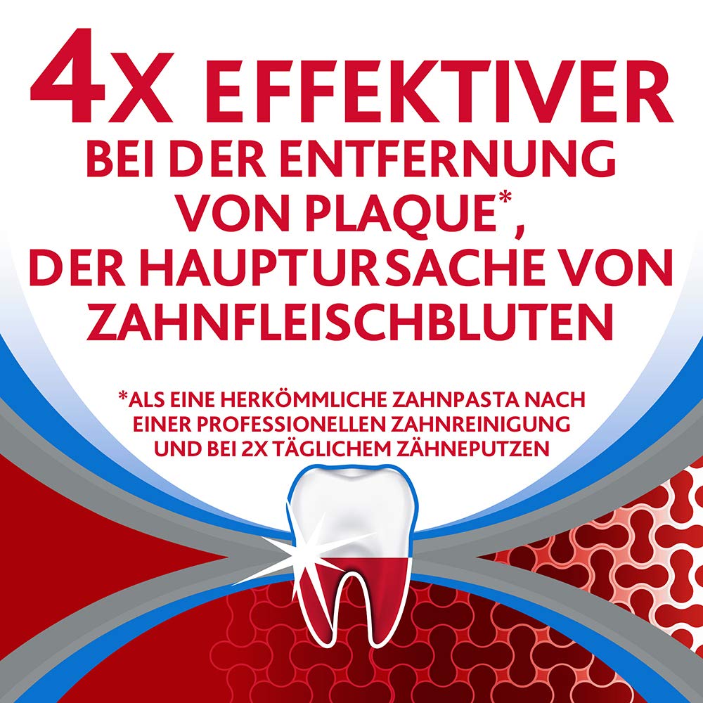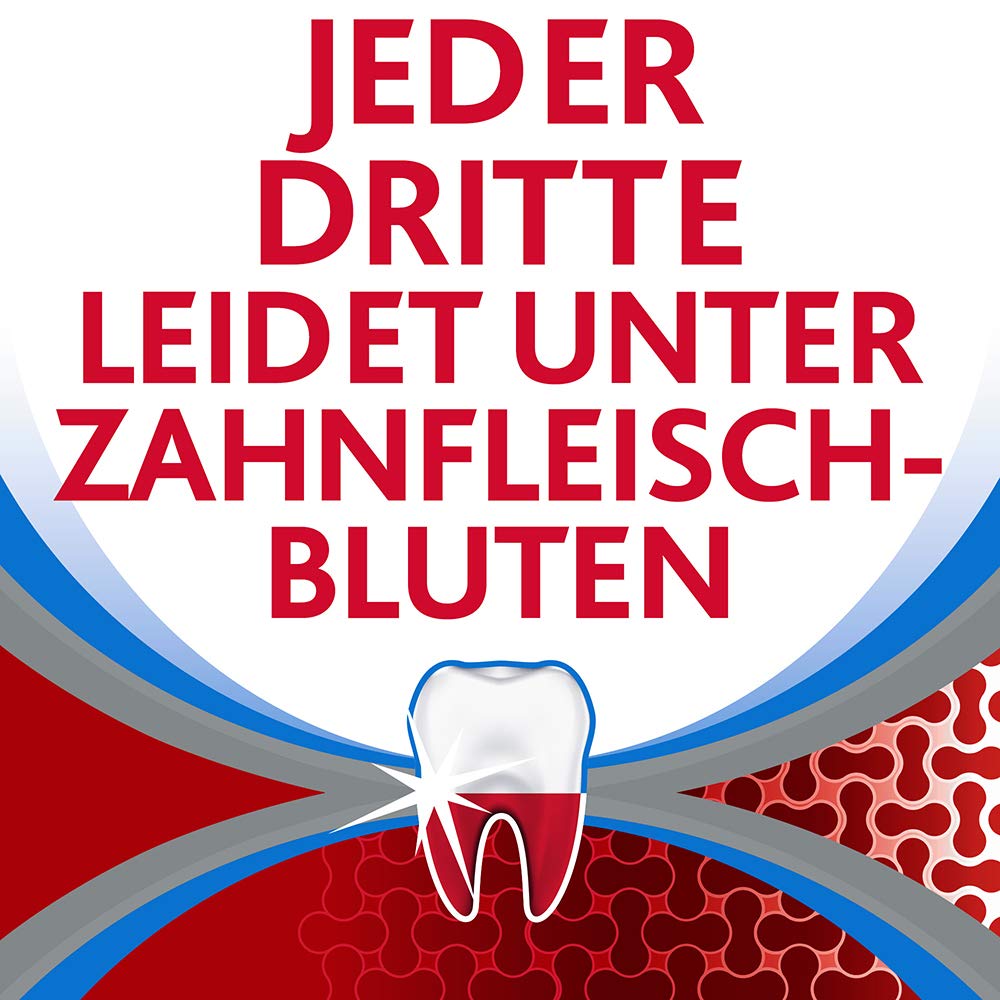 Wenn Sie beim Zähneputzen oder beim Benutzen von Zahnseide Blut sehen, kann dies ein Anzeichen einer Zahnfleischerkrankung sein. Die parodontax tägliche Zahnpasta wurde speziell entwickelt, um dazu beizutragen, Zahnfleischbluten zu reduzieren und vorzubeugen. Parodontax Complete Protection Whitening verfügt über 8 speziell entwickelte Vorteile, die dabei helfen, Ihr Zahnfleisch gesund und Ihre Zähne stark zu halten: Hilft, Zahnfleischbluten zu reduzieren und vorzubeugen. Reduziert gerötetes und geschwollenes Zahnfleisch. 4x effektiver* bei der Entfernung von Plaque, der Hauptursache von Zahnfleischbluten. Hilft den Übergang zwischen Zahn und Zahnfleisch straff zu halten. Bekämpft Mundgeruch. Stärkt den Zahnschmelz. Intensive Reinigung. Whitening Effekt. Gesundes Zahnfleisch blutet nicht. Blutungen bei der Verwendung von Zahnbürste oder Zahnseide könnten auf eine beginnende Zahnfleischerkrankung hindeuten. Wenn das Problem nicht behandelt wird, kann es zu Mundgeruch, Rötungen und Schwellungen des Zahnfleischs, Zahnfleischrückgang und letztlich zu Zahnverlust kommen. Wie parodontax helfen könnte? Indem sie Ansammlungen von Plaquebakterien entlang des Zahnfleischrandes entfernt, hilft die parodontax Zahnpasta, den Zahnfleischrand straff zu halten. Sie ist 4x effektiver* als eine herkömmliche Zahnpasta bei der Bekämpfung der Hauptursache von Zahnfleischbluten. Bei zweimal täglichem Zähneputzen hilft die Zahnpasta nachweislich, Zahnfleischbluten zu reduzieren und vorzubeugen. BEFOLGEN SIE STETS DIE ANWENDUNGSHINWEISE: 2x bis max. 3x pro Tag Zähneputzen, dann ausspucken, Schlucken vermeiden. Ausserhalb der Reichweite von Kindern aufbewahren. Nicht für Kinder unter 12 Jahren geeignet. Bei Unverträglichkeit absetzen. Nicht verwenden, wenn Umverpackung beschädigt ist. *4x effektiver als eine herkömmliche Zahnpasta bei der Entfernung von Plaque, der Hauptursache von Zahnfleischproblemen. Nach einer professionellen Zahnreinigung und bei 2x täglichem Zähneputzen.