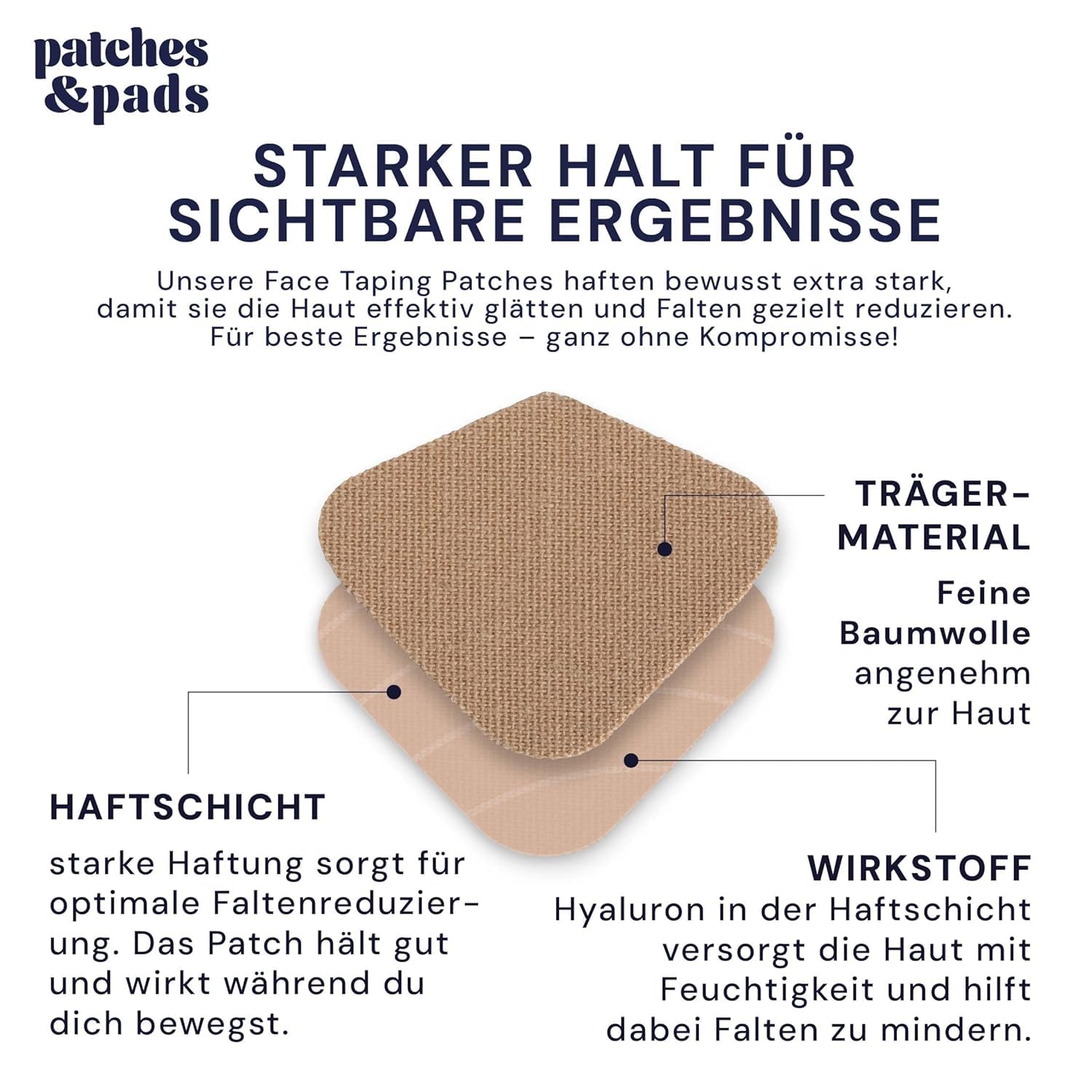 Angereichert mit Hyaluron versorgen die Pflaster die Haut intensiv mit Feuchtigkeit, polstern feine Linien auf und verbessern das Hautbild sichtbar. Das hochwertige Baumwollmaterial ist besonders sanft zur Haut, atmungsaktiv und eignet sich auch fuer empfindliche Hauttypen. Die Pflaster lassen sich angenehm ueber mehrere Stunden oder ueber Nacht tragen.