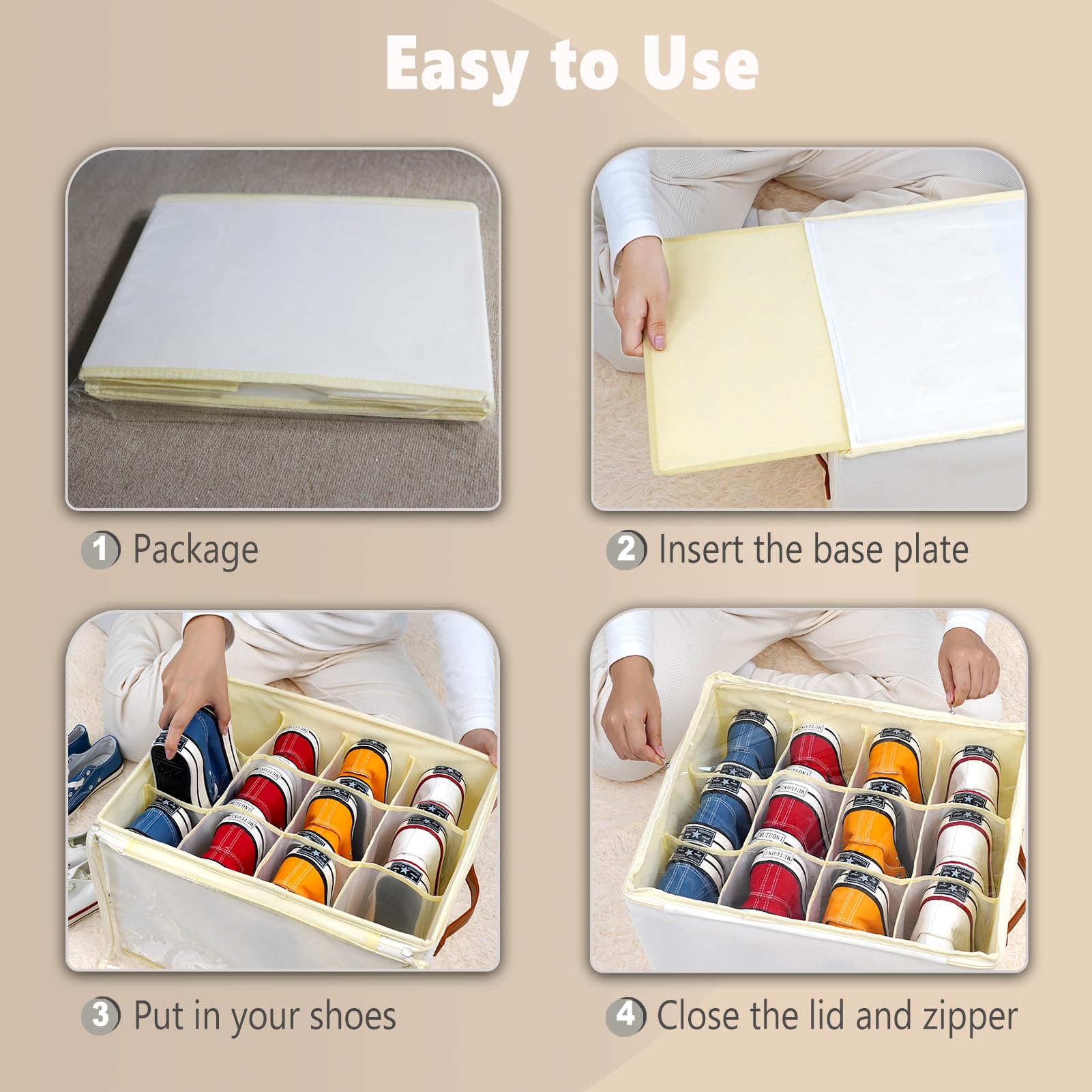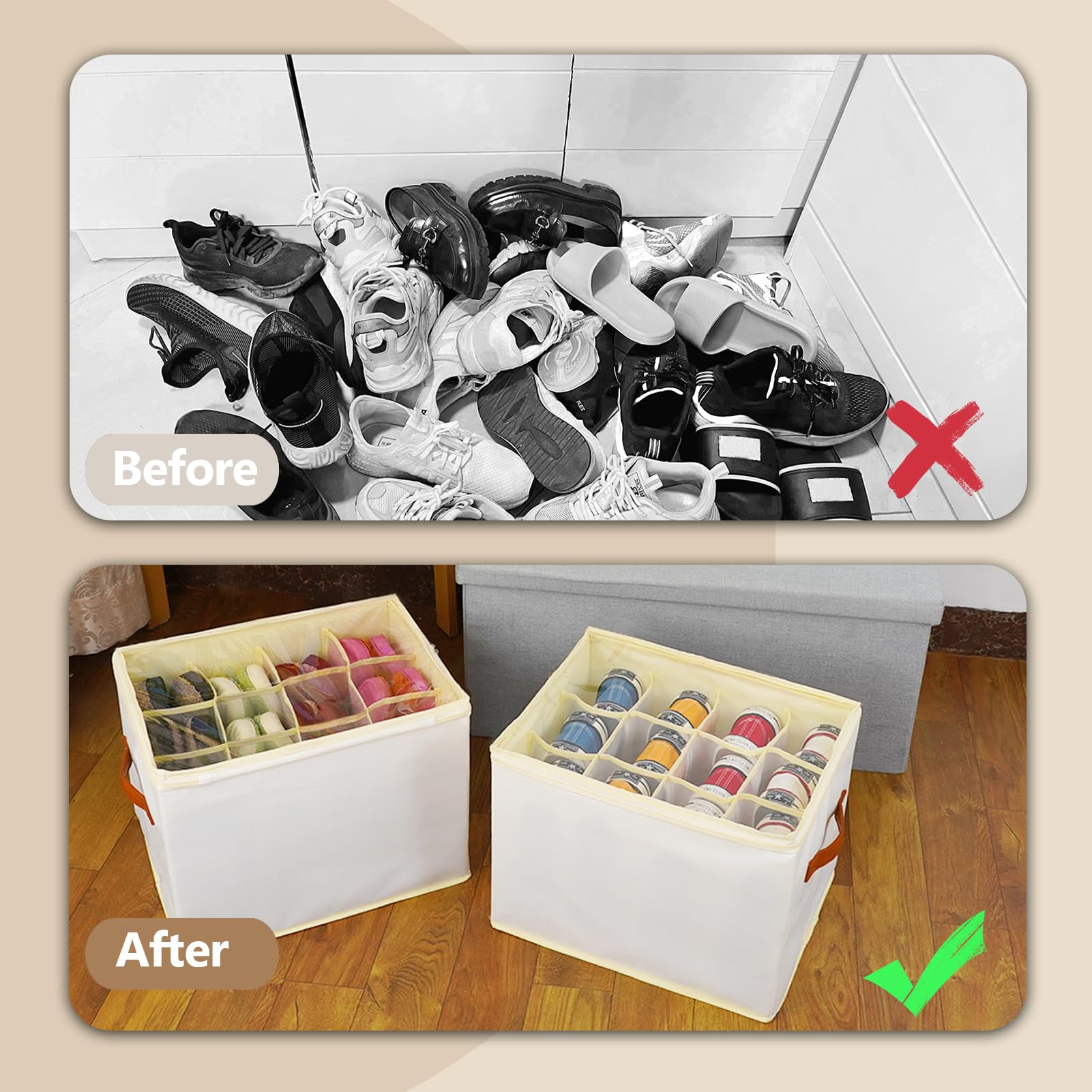 - Bessere Raumausnutzung: Dieser Behälter kann nicht nur Schuhe, Turnschuhe, Segeltuchschuhe, Hausschuhe, Kinderschuhe, sondern auch Hosen, Pullover, T-Shirts und Handtücher aufnehmen. Es kann Ihren Lebensraum organisiert halten und die Raumnutzung verbessern. Diese Aufbewahrungsbox erleichtert Ihnen die Aufbewahrung von Schuhen und Kleidungsstücken, reduziert Ihren Arbeitsaufwand und spart Ihre Zeit