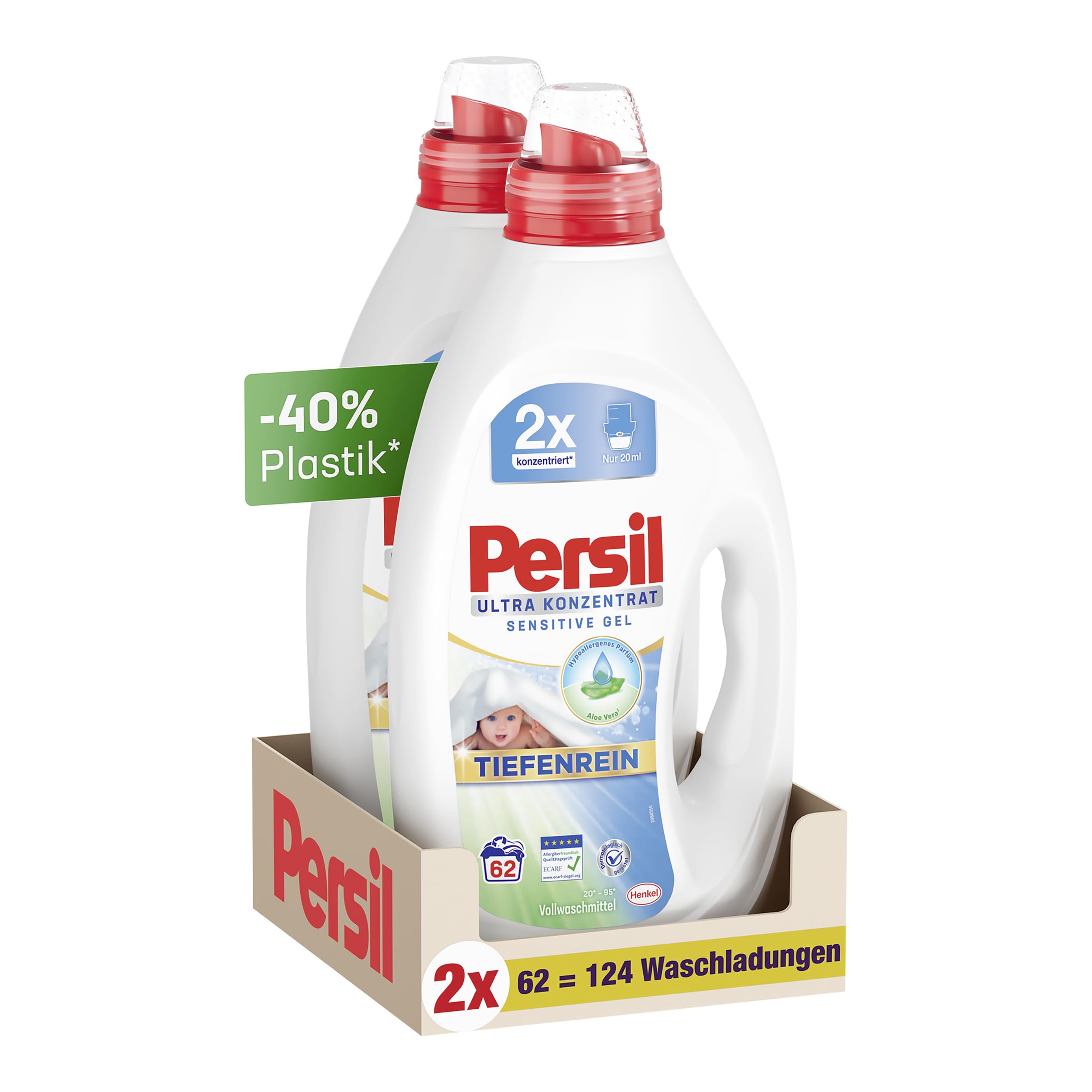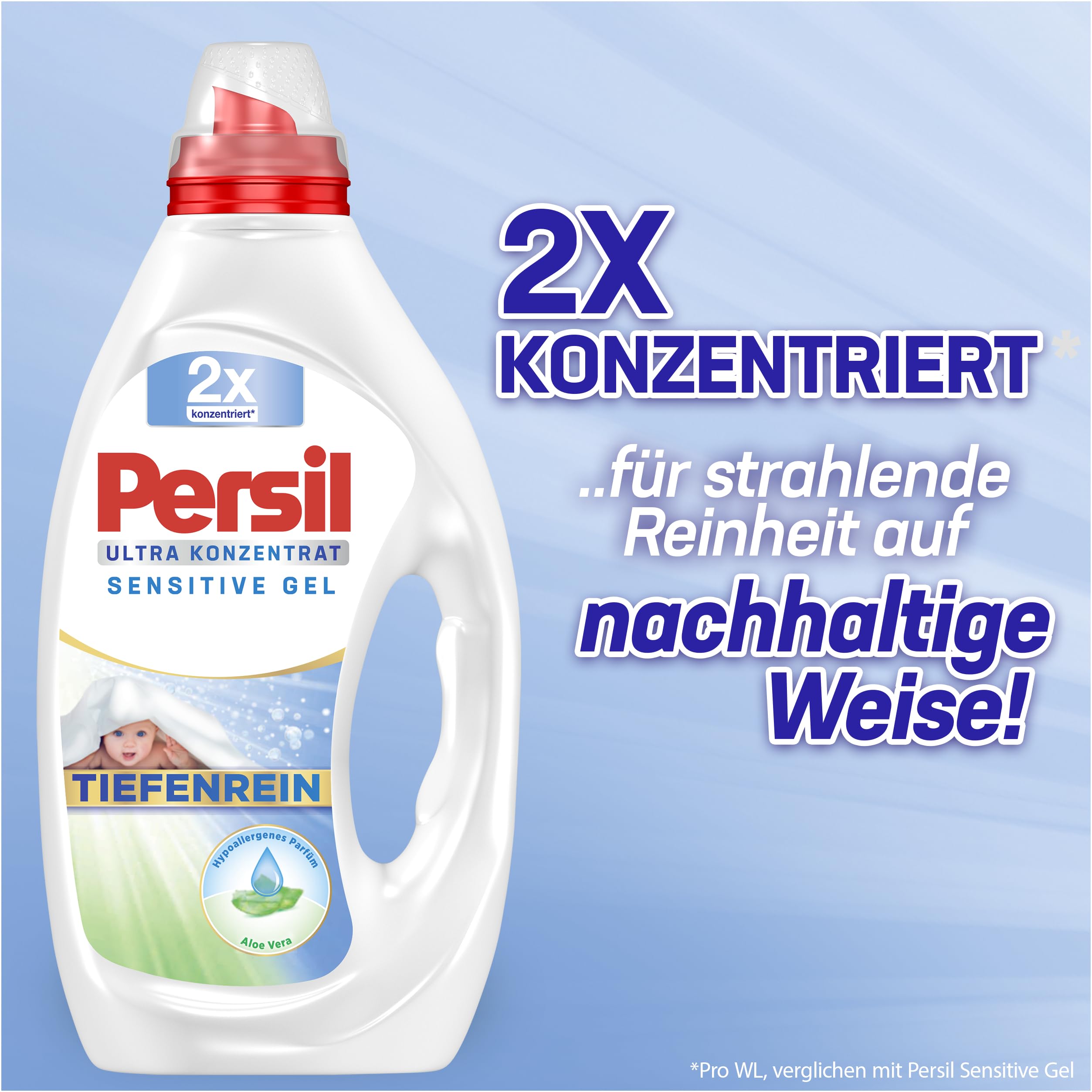PERSIL Ultra Konzentrat Sensitive Gel – die sanfte Tiefenreinigung in konzentrierter FormDas PERSIL Ultra Konzentrat Sensitive Gel garantiert tiefenreine Ergebnisse, bekämpft hartnäckigste Flecken und ist dabei sanft zu Lieblingstextilien, Haut, sowie zum Planeten: Dank hochkonzentrierter Formel ist die Flasche kleiner und besteht aus 40% weniger Plastik*. Somit sorgt das flüssige Waschmittel für hervorragende Waschergebnisse und ein langanhaltendes Frischegefühl bei besserer Ergiebigkeit, was sowohl den Wasserverbrauch als auch den CO2-Fussabdruck verringert. Das Sensitive Waschmittel ist dermatologisch getestet, enthält naturbasierte Inhaltsstoffe und wirkt auch bei niedrigen Temperaturen ab 20° C.Die Produktvorteile im Detail:Sensitive FormelLanganhaltend hygienische FrischeGegen hartnäckigste FleckenEffektiv bei 20° C - 95° C40 % weniger Plastik*Hält 10 Monate (2er-Pack)Anwendungshinweis: Bitte immer die Dosieranweisung auf der Verpackung prüfen. Die Dosieranweisung ist abhängig von der Grösse der Waschmaschine, der Wasserhärte und dem Verschmutzungsgrad der Wäsche. Bei mittlerer Verschmutzung wird eine halbe Verschlusskappe des Flüssigwaschmittels verwendet, bei starker Verschmutzung eine ganze. Von Kindern fernhalten.PERSIL bleibt Persil, weil PERSIL nicht PERSIL bleibt