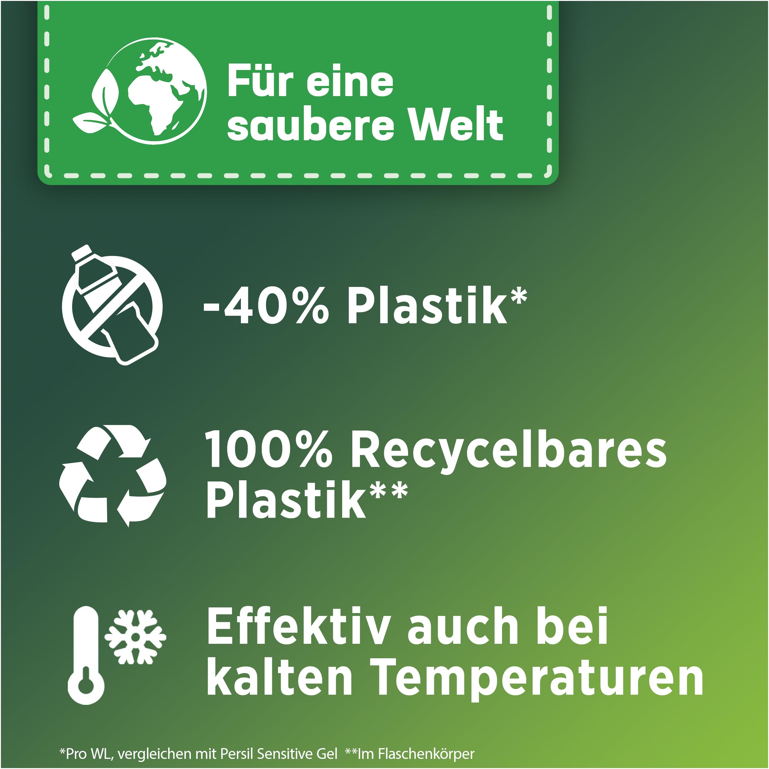 Seit mehr als 110 Jahren erfreut sich PERSIL grösster Beliebtheit und geniesst das Vertrauen von Millionen Verbrauchern. Bereits bei der Einführung im Jahr 1907 als erstes selbsttätiges Waschpulver war PERSIL seiner Zeit voraus und setzt seitdem Meilensteine in der Entwicklung neuer und nachhaltiger Waschmittel. Dabei liefern alle Produkte einen entscheidenden Mehrwert, Sie verbinden erstklassige Leistung mit der Verantwortung für Mensch und Umwelt und ermöglichen einen effizienten Einsatz von Ressourcen wie Energie und Wasser.*Pro Waschladung im Vergleich zum PERSIL Sensitive Gel