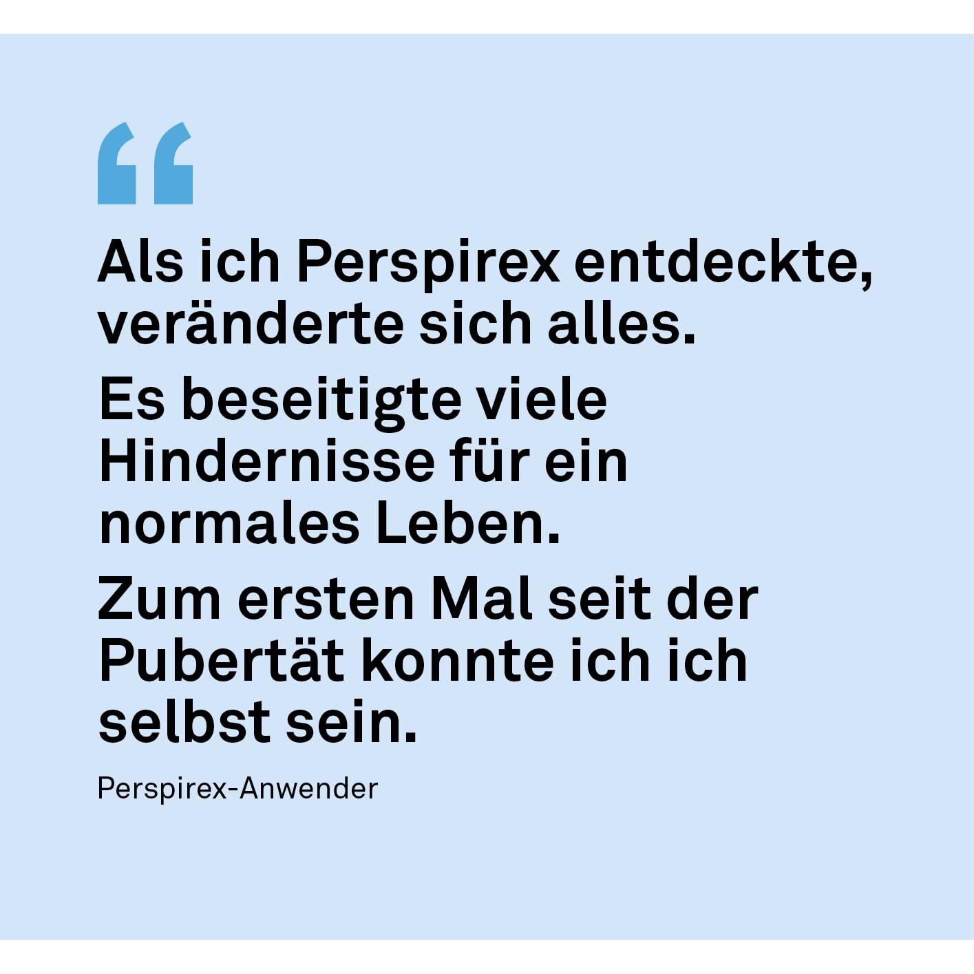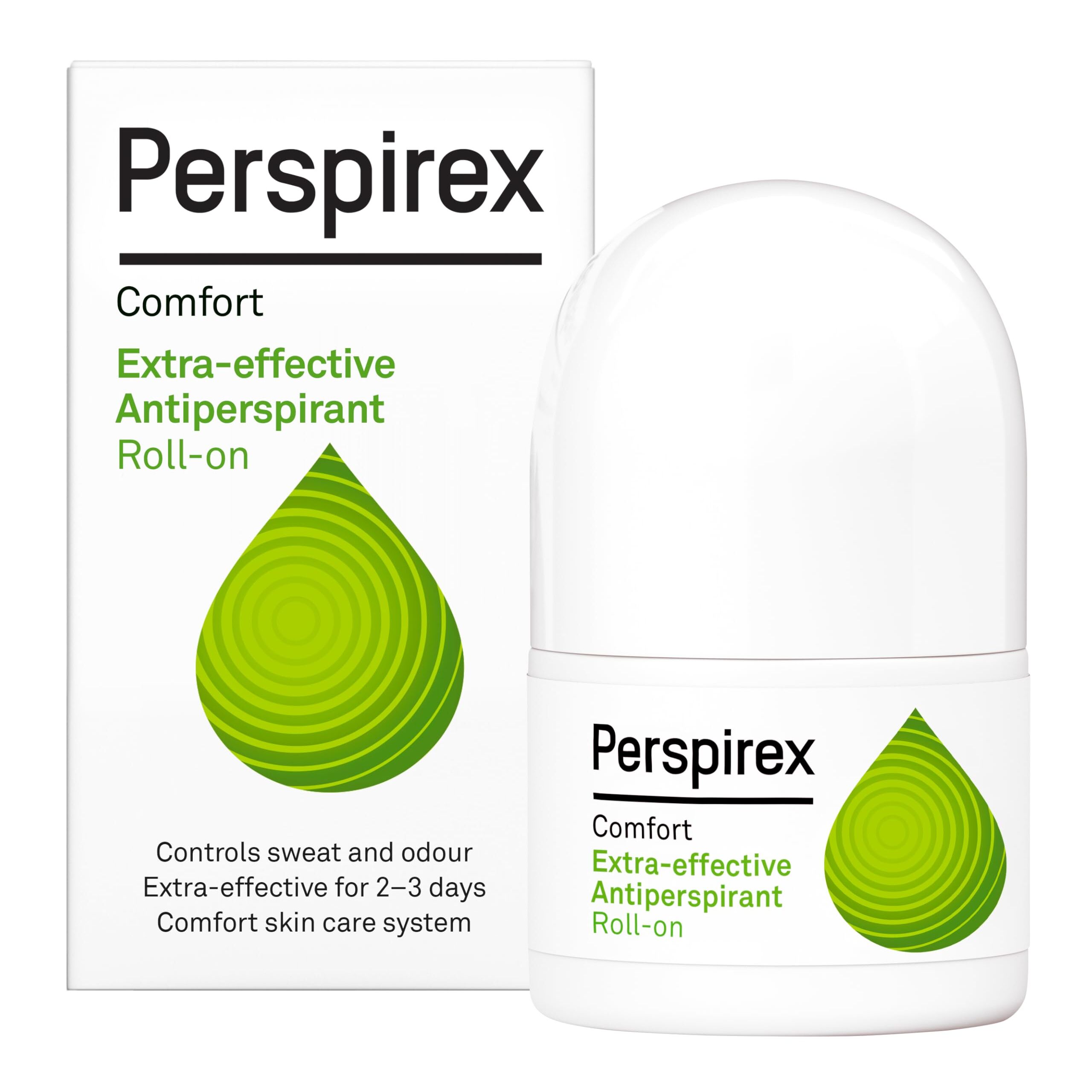 Perspirex Comfort Anti-Transpirant Roll-On ist fuer Menschen mit empfindlicher Haut gemacht, die gelegentlich stark schwitzen. Die wasserbasierte, parfuemfreie Formel bietet langanhaltenden Schutz vor Achselschweiss und Geruchsbildung und wirkt pro Anwendung bis zu 2 bis 3 Tage. Das integrierte Hautpflegesystem unterstuetzt ein angenehmes Hautgefuehl und kann typische Reizungen reduzieren, die bei herkoemmlichen Anti-Transpirants auftreten. Klinisch getestet und fuer Damen und Herren geeignet, ideal fuer Alltag und Reisen dank praezisem Roll-On Auftrag.