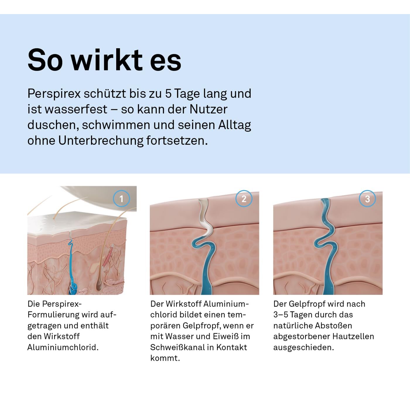 Der Perspirex Strong Antitranspirant Deo Roller wurde speziell fuer Maenner und Frauen mit starkem Schweissaufkommen entwickelt. Die klinisch getestete Formel mit hochwirksamem Aluminiumchlorid reduziert die Schweissproduktion gezielt und sorgt fuer maximale Trockenheit, selbst bei Stress oder koerperlicher Aktivitaet. Bereits eine Anwendung am Abend bietet bis zu 5 Tage Schutz vor Achselschweiss und Koerpergeruch. Ohne Duftstoffe formuliert, um die Hautvertraeglichkeit zu verbessern und eine neutrale Frische zu erhalten.