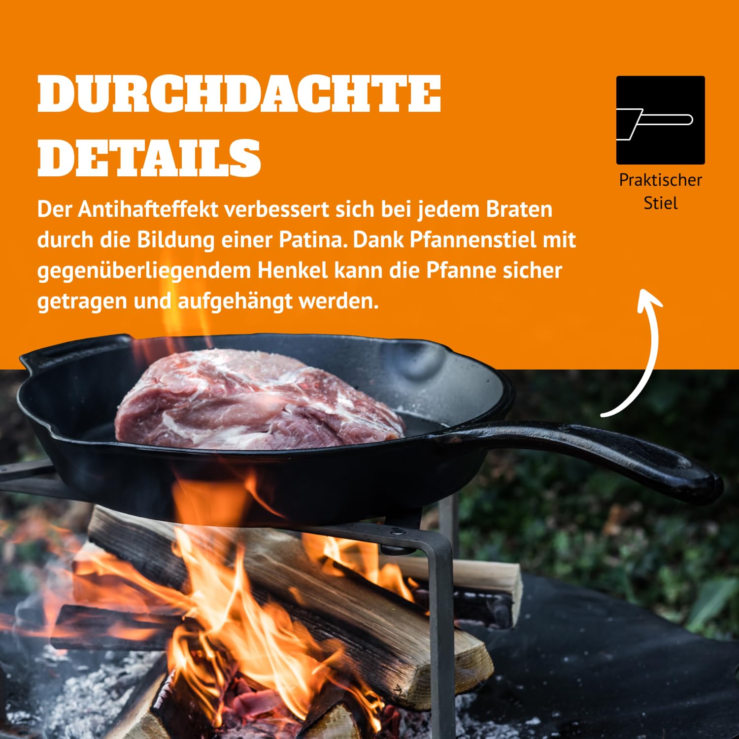 Die gusseiserne Petromax Feuerpfanne gibt es in zwei Ausführungen: Mit klassischem Pfannenstiel oder mit zwei Henkeln. Die Petromax Feuerpfanne funktioniert auf allen Herdarten (Induktion, Gas und Ceran).