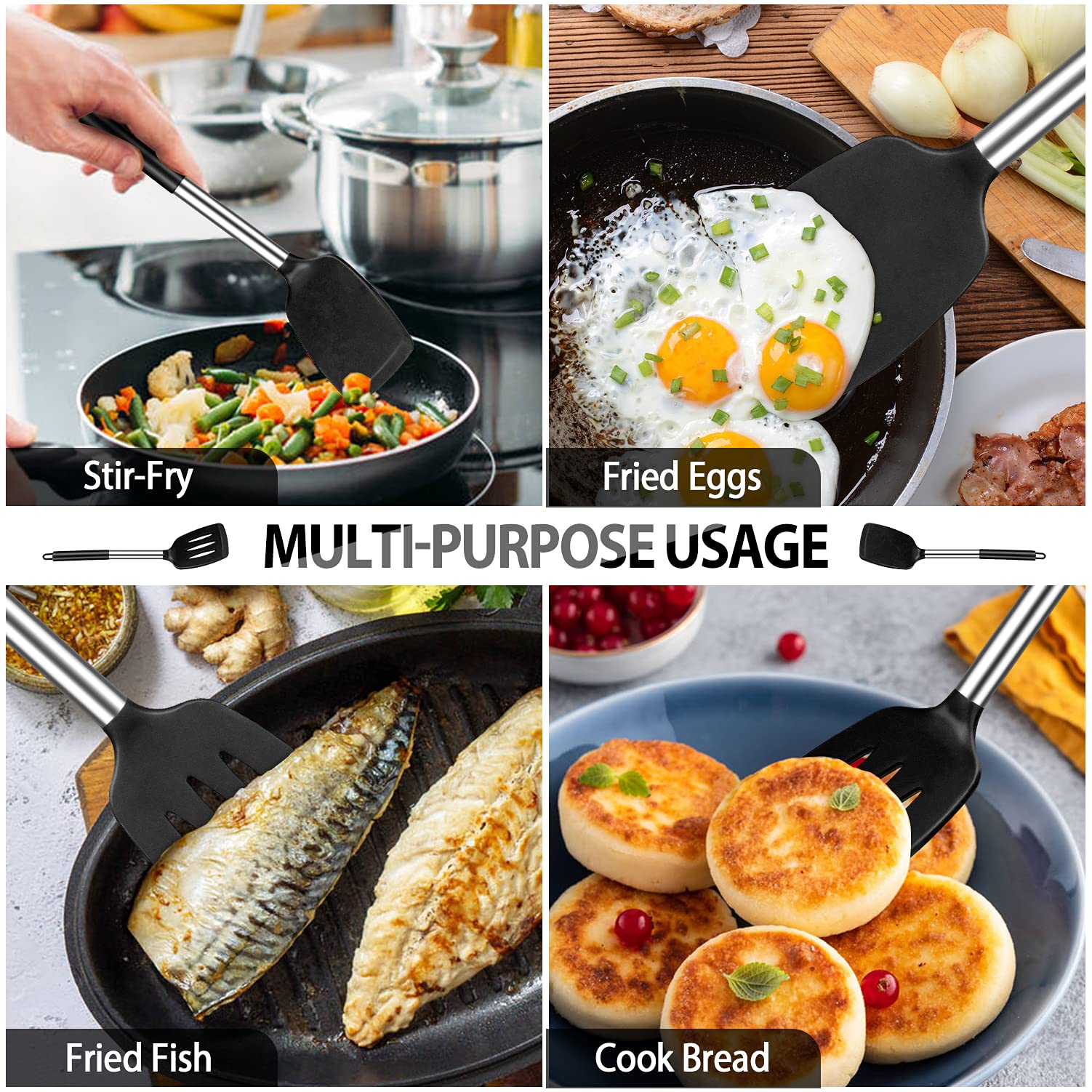 Pfannenwender Silikon, Hitzebeständig Silikon Geschlitzt Spatel Küchenhelfer BPA Frei,Spülmaschinengeeignet Küchenhelfer Kochgeschirr Edelstahl Turner Antihaft Spachtel zum Kochen, Schwarz
