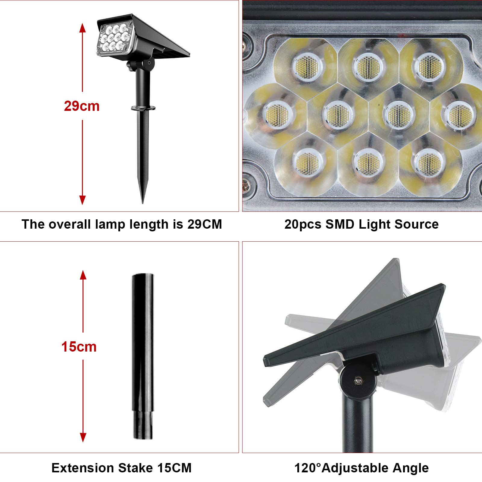 - ☀Verbesserter heller Strahler: Solar-Landschaftslicht mit 20 LED-Highlight-Lampenperlen für viel hellere Beleuchtung. Spotlights LED Linse ist ein Bienenaugen-Design mit starker Fokussierfunktion. Es kann den Lichtwinkel steuern, um den Lichtwinkel zu verwenden, um die Effizienz zu verbessern.