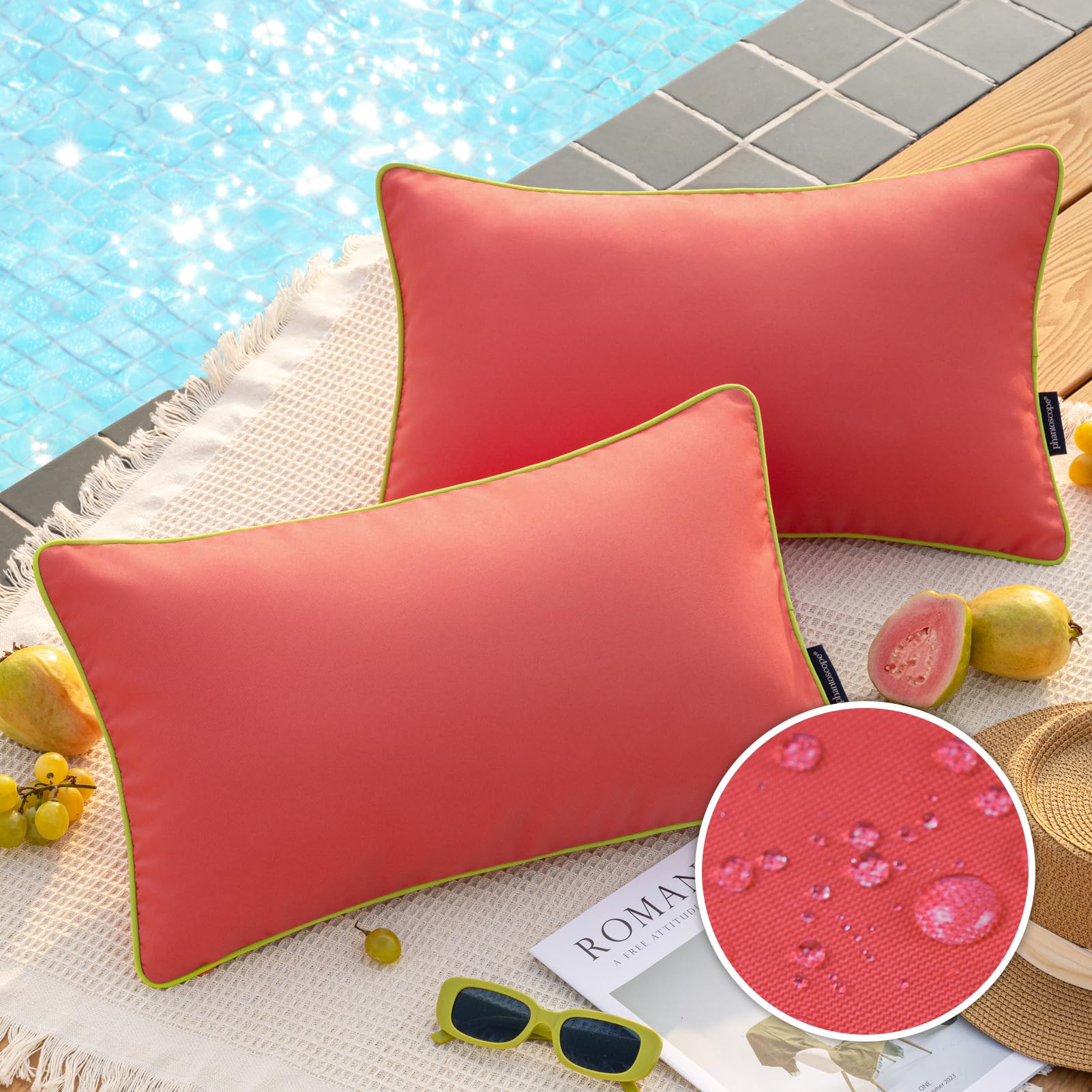 Phantoscope Wasserdichte Outdoor-Kissenbezüge mit Kontrastpaspel, dekorative quadratische Kissenhüllen für Terrasse, Sofa, Zelt, Sunbrella, Rosarot, 30 x 50 cm, 2er-Pack