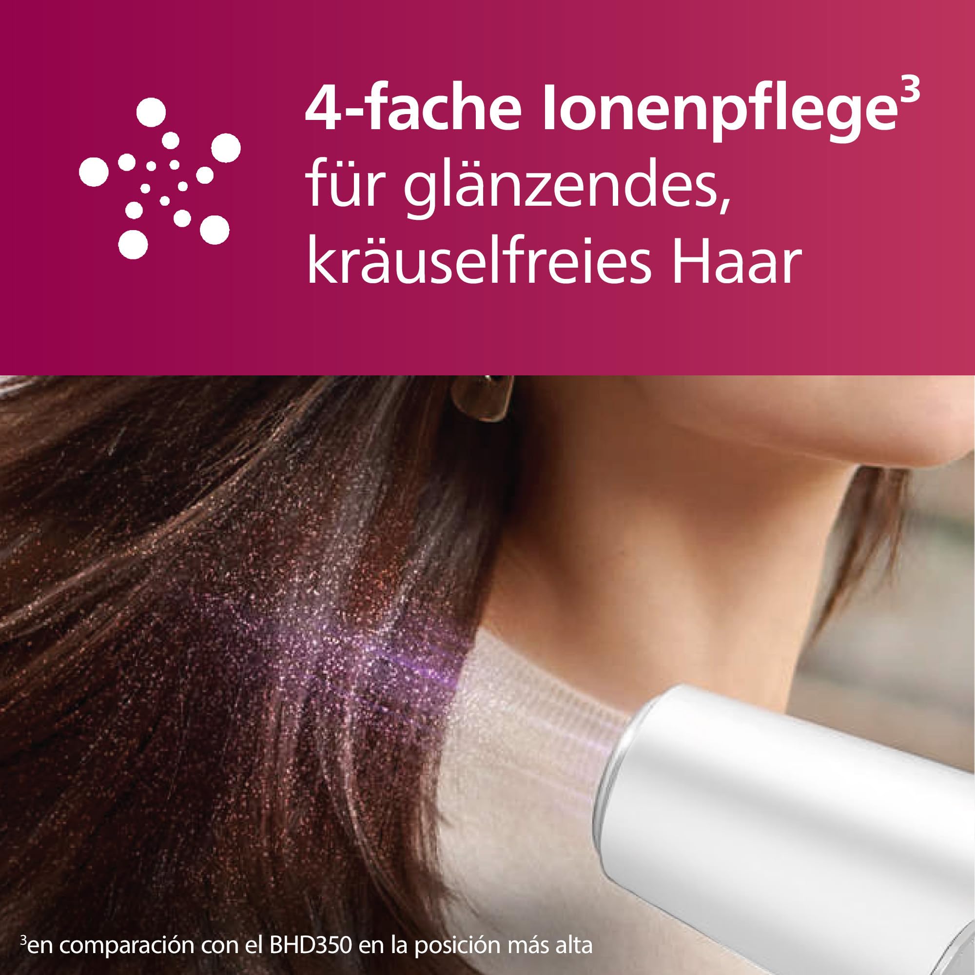 Erleben Sie ultimativen Schutz für die Haare und trocknen und stylen Sie Ihr Haar ganz einfach mit dem Philips Haartrockner Series 5000 – ein Must-have unter den Haarstyling-Geräten.Die ThermoShield Technologie erkennt aktiv die Lufttemperatur des Trockners und passt sie auf eine optimale Stufe an, um Ihr Haar vor Hitzeschäden zu schützen. Die Kaltstufetaste ist eine nützliche Profi-Funktion und bietet intensive Kaltluft zum Fixieren Ihres Stylings.Dieser leistungsstarke Haartrockner mit 4-facher Ionisierungsfunktion² erzeugt bis zu 40 Millionen Ionen pro Trocknung und intensiviert den Glanz Ihrer Haare. So geniessen Sie besonders glänzendes und geschmeidiges Haar. Der leistungsstarke Motor dieses Haartrockners wurde für den professionellen Markt entwickelt. Er erzeugt eine Luftgeschwindigkeit von bis zu 110 km/h³ für eine schnelle Trocknung und ein beeindruckendes Styling.Wählen Sie einfach die Kombination aus Wärme und Geschwindigkeit aus, die ideal für Ihr Haar und Ihren Stil ist. Sechs verschiedene Einstellungen sorgen für ein präzises und personalisiertes Styling.Das Gerät verfügt über einen Volumendiffusor, der den Luftstrom im Haar verteilt, für mehr Volumen und weniger krauses Haar.Sie können den Philips Haartrockner 5000 Series zu Hause oder unterwegs verwenden – er ist kompakt, leicht, benutzerfreundlich und einfach zu verstauen. ¹ In der ThermoShield Einstellung ² Im Vergleich zum BHD350 auf der höchsten Stufe ³ Im Philips Labor mit Düse auf der höchsten Stufe getestet