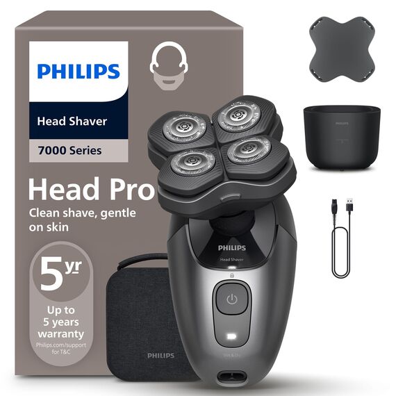 Ein glatt rasierter Kopf ist nicht nur eine persönliche Stilfrage, er ist ein Statement. Auf der Suche nach einem zuverlässigen Glatzenrasierer für Männer und Frauen? Der Philips Head Shaver Pro Series 7000 von der weltweiten Nr. 1 unter den Marken für elektrische Rasierer wurde für eine gründliche, hautfreundliche Rasur entwickelt. Der ideale Glatzenrasierer für alle, die gepflegt aussehen, selbstbewusst auftreten und ihrem Look mehr Persönlichkeit verleihen wollen. Dieser Glatzenrasierer wurde für die einfache, komfortable Kopfrasur entwickelt. Der durchdachte, flexible 360°-Scherkopf passt sich der Kopfform an, während die ComfortCut-Klingen gründlich und gleichmässig in alle Richtungen arbeiten und der PowerAdapt-Sensor die Leistung automatisch passend zur Haardichte reguliert. Das Ergebnis? Eine glatte Rasur mit minimalem Aufwand. Dank seines rutschfesten ergonomischen Griffs lässt sich dieser Glatzenrasierer auch unter der Dusche bequem und sicher handhaben. Der Lithium-Ionen-Akku ermöglicht 90 Minuten kabelloses Rasieren bei einer Stunde Ladezeit – das entspricht etwa 15 Rasuren. In Eile? Schon nach 5 Minuten am Stromnetz reicht die Power für eine volle Rasur. Das Gerät ist wasserdicht nach Schutzklasse IPX7, lässt sich also auch unter der Dusche nutzen und problemlos in der mitgelieferten Reinigungsstation spülen. Das Haarauffangsystem sorgt für eine gründliche und saubere Rasur, während die Reisesicherung und das hochwertige Reiseetui eine sichere und praktische Aufbewahrung sicherstellen. Ob glatt rasiert in den Tag zu starten oder die Rasur abends vor dem Ausgehen noch schnell auffrischen: Dieser Glatzenrasierer ist voll auf Komfort ausgelegt und fügt sich nahtlos in die tägliche Routine ein. Denn wer gut aussieht, fühlt sich auch so. ¹ Quelle: Euromonitor International Limited, Verkaufswert UVP, Definition der Kategorie pro Körperrasierer, Daten für 2024, Studie vom Oktober 2024