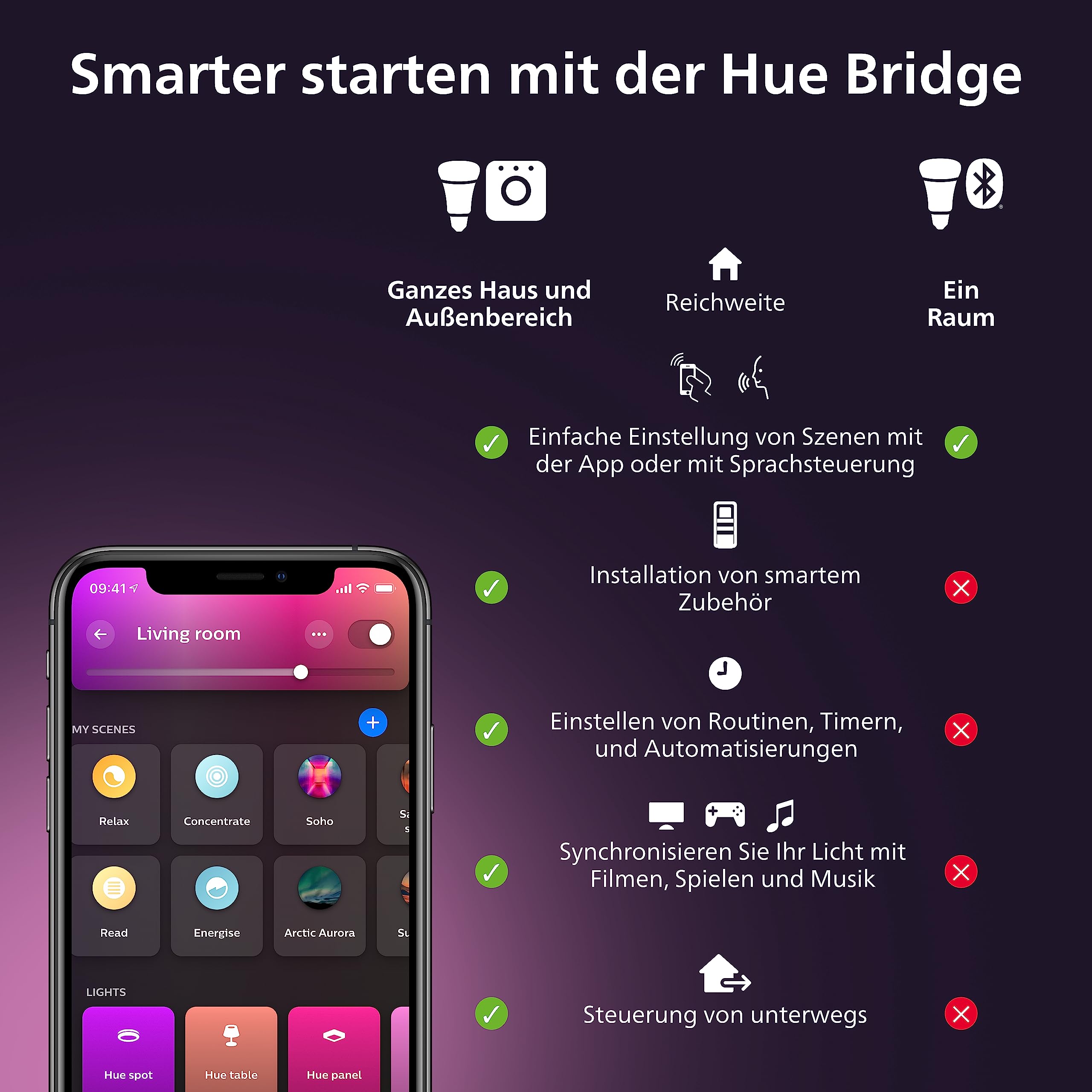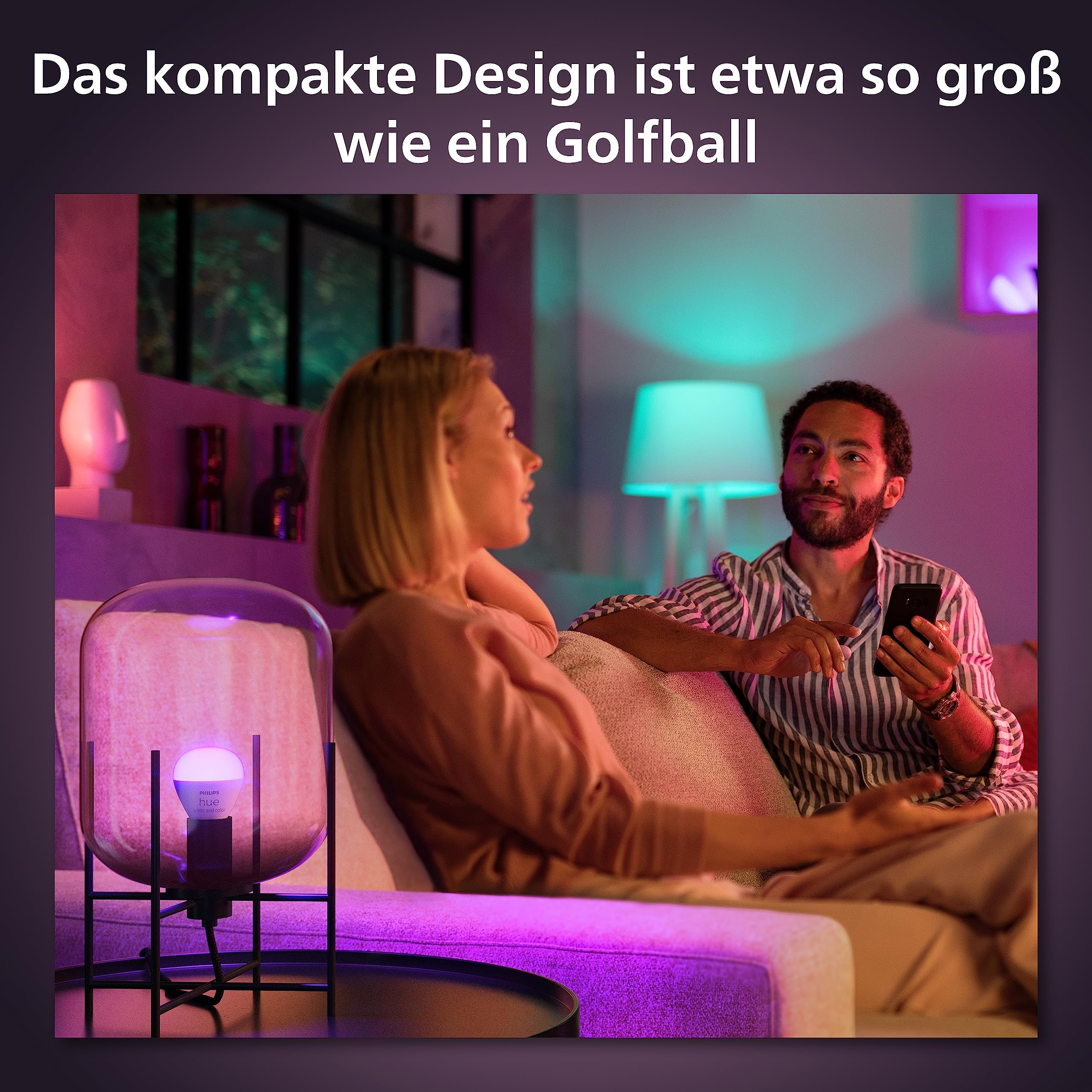 Smart Lighting mit Philips Hue – mehr als nur LichtGestalten Sie Ihr Zuhause neu und kreieren Sie einzigartige Lichteffekte mit der Hue E14 Lampe in Tropfenform von Philips. Ob zum Entspannen nach der Arbeit, für einen Spieleabend oder eine ausgelassene Party – mit 16 Millionen Farben und Weisstönen, vom kühlen bis warmen Licht, schafft die Lampe interessante, farbenfrohe Lichtdekorationen passend für jeden Anlass. Einfach in der Installation kann das LED Leuchtmittel in jede E14 Fassung eingesetzt werden und funktioniert in jedem Zuhause.Es gibt keine umfangreichere Methode, Ihre smarten Philips Hue Lampen und das Zubehör zu organisieren, zu steuern und anzupassen, als mit der offiziellen Philips Hue AppSmarter starten mit der Philips Hue Bridge für einen vollen Funktionsumfang:Mit Bluetooth können viele Funktionen bereits getestet werden. Alle Möglichkeiten stehen aber erst in Verbindung mit der Philips Hue Bridge Steuerungszentrale zur Verfügung:Vergessen das Licht auszuschalten? Mit der Hue Bridge ist die Lichtsteuerung auch von unterwegs möglichDie Beleuchtung soll sich automatisch einschalten, wenn es dunkel wird? Automatisierungen helfen zusätzlich dabei das Licht zu einer bestimmten Zeit ein- und auszuschalten oder die gewünschte Farbeinstellung automatisch vorzunehmenIm Haus fehlt ein Schalter am richtigen Platz? Mit der Hue Bridge und dem passenden Zubehör können Schalter, Bewegungs- oder Kontaktsensoren überall flexibel im Raum zur Steuerung positioniert werdenLangsames WLAN? Die Hue Bridge verwendet Zigbee, um mit den Lampen und Zubehörteilen zu kommunizieren. Alle Lampen reagieren sofort, und können auch dann gesteuert werden, wenn kein WLAN verfügbar istDie Lampen sollen aus einem anderen Raum oder im Garten gesteuert werden? Jede Lampe, die hinzugefügt wird, fungiert als Repeater, sodass die Lampen im ganzen Haus, innen und aussen, verteilt werden können und die Reichweite so unabhängig von der Bluetooth oder WLAN Reichweite maximiert werden kannNeben Ambientebeleuchtung ist auch ein Sicherheitssystem oder die Musik, TV- und Gaming-Synchronisation interessant? Die Hue Bridge bietet ein System, das alle Bedürfnisse erfüllt, von Ambiente, bis hin zu Unterhaltung und SicherheitDas System soll einfach zu bedienen und zukunftssicher sein? Die Hue Bridge sorgt dafür, dass alle Lampen immer auf dem aktuellen Stand und dank Matter weitere smart Home Marken problemlos integriert werden könnenSo smart kann Licht sein: White & Color Ambiance E14 Lampe in TropfenformLicht: Weiss und farbigFarbtemperatur: 2.000 - 6.500 KDimmbar: JaLichtleistung bei 4.000 K: 470 lmWattleistung: 5,1 WMax. Standby-Stromverbrauch: 0,5 WMasse (ø x H): 45 x 77 mmLieferumfang: 1 x E14 LampeIntelligente Sprach- und Appsteuerung via Hue Bridge