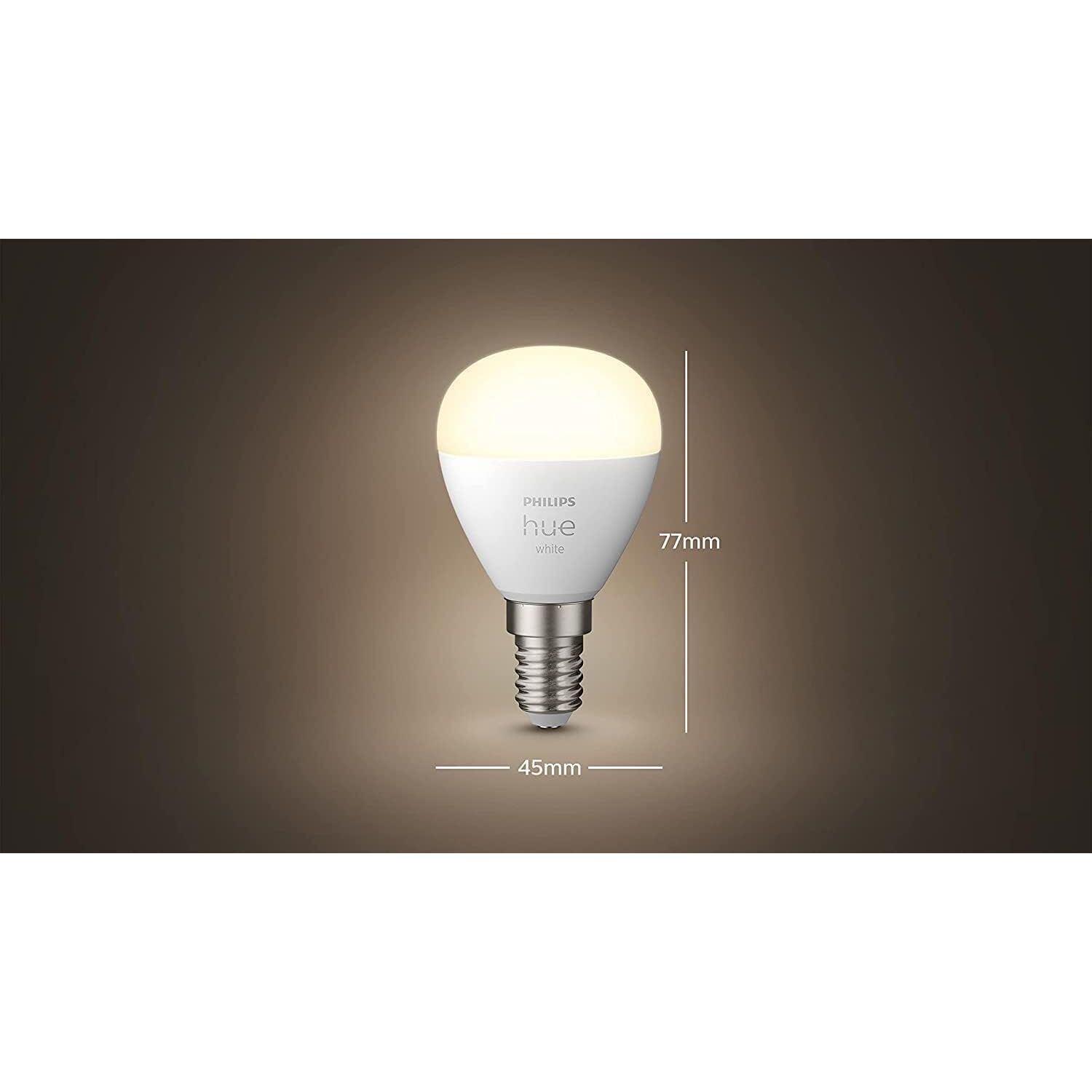Vernetze Deine kleinsten Leuchten – zum Beispiel Wand-, Tisch- oder Schreibtischleuchten – mit der Philips Hue White P45 E14 Lampe in Tropfenform. Diese kleine Lampe erzeugt ein dimmbares, warmweisses Licht und lässt sich mit Bluetooth in einem Raum steuern. Schliesse die Hue Bridge an, um sämtliche Funktionen zu nutzen.