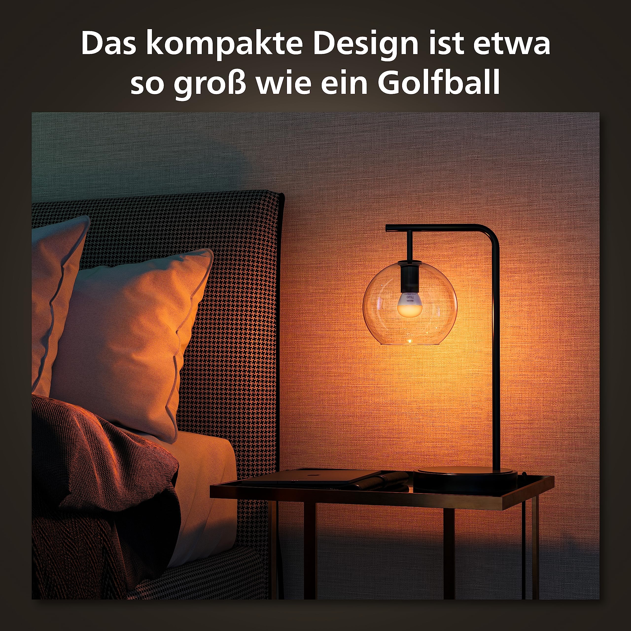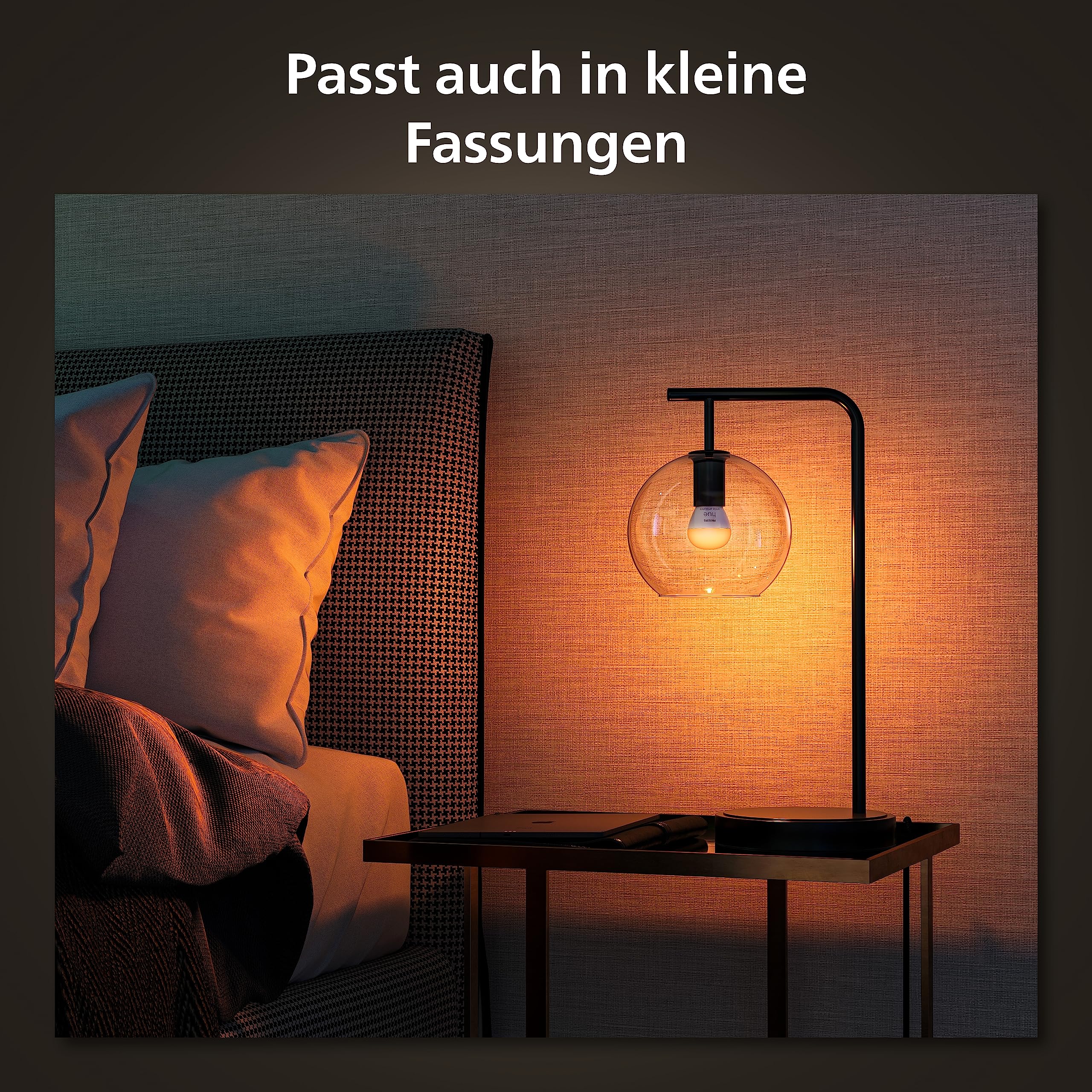 Smart Lighting mit Philips Hue – mehr als nur LichtGestalten Sie Ihr Zuhause neu und kreieren Sie personalisierte Lichtszenen mit der Hue E14 LED Lampe von Philips. Ob für einen frischen Start in den Tag, zum Entspannen nach der Arbeit oder zum Lernen und Lesen – mit 50.000 verschiedenen Weissschattierungen, vom kühlen bis warmen Licht, schafft die Lampe in Tropfenform interessante Lichtdekorationen passend für jeden Anlass. Einfach in der Installation kann das LED Leuchtmittel in jede E14 Fassung eingesetzt werden und funktioniert in jedem Zuhause.Es gibt keine umfangreichere Methode, Ihre smarten Philips Hue Lampen und das Zubehör zu organisieren, zu steuern und anzupassen, als mit der offiziellen Philips Hue AppSmarter starten mit der Philips Hue Bridge für einen vollen Funktionsumfang:Mit Bluetooth können viele Funktionen bereits getestet werden. Alle Möglichkeiten stehen aber erst in Verbindung mit der Philips Hue Bridge Steuerungszentrale zur Verfügung:Vergessen das Licht auszuschalten? Mit der Hue Bridge ist die Lichtsteuerung auch von unterwegs möglichDie Beleuchtung soll sich automatisch einschalten, wenn es dunkel wird? Automatisierungen helfen zusätzlich dabei das Licht zu einer bestimmten Zeit ein- und auszuschalten oder die gewünschte Farbeinstellung automatisch vorzunehmenIm Haus fehlt ein Schalter am richtigen Platz? Mit der Hue Bridge und dem passenden Zubehör können Schalter, Bewegungs- oder Kontaktsensoren überall flexibel im Raum zur Steuerung positioniert werdenLangsames WLAN? Die Hue Bridge verwendet Zigbee, um mit den Lampen und Zubehörteilen zu kommunizieren. Alle Lampen reagieren sofort, und können auch dann gesteuert werden, wenn kein WLAN verfügbar ist.Die Lampen sollen aus einem anderen Raum oder im Garten gesteuert werden? Jede Lampe, die hinzugefügt wird, fungiert als Repeater, sodass die Lampen im ganzen Haus, innen und aussen, verteilt werden können und die Reichweite so unabhängig von der Bluetooth oder WLAN Reichweite maximiert werden kannNeben Ambientebeleuchtung ist auch ein Sicherheitssystem oder die Musik, TV- und Gaming-Synchronisation interessant? Die Hue Bridge bietet ein System, das alle Bedürfnisse erfüllt, von Ambiente, bis hin zu Unterhaltung und SicherheitDas System soll einfach zu bedienen und zukunftssicher sein? Die Hue Bridge sorgt dafür, dass alle Lampen immer auf dem aktuellen Stand und dank Matter weitere smart Home Marken problemlos integriert werden könnenSo smart kann Licht sein: White Ambiance E14 LED LampeLicht: Weiss, kalt bis warmFarbtemperatur: 2.200 - 6.500 KDimmbar: JaLichtleistung bei 4.000 K: 470 lmWattleistung: 5,1 WMax. Standby-Stromverbrauch: 0,5 WMasse (L x B): 45 x 77 mmLieferumfang: 1 x E14 LampeIntelligente Sprach- und Appsteuerung via Hue Bridge