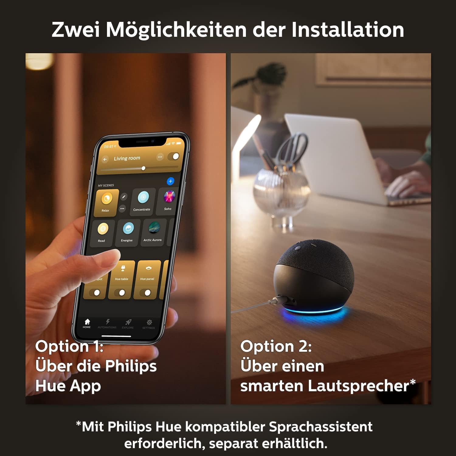 Verbinden Sie die Lampen mit der mitgelieferten Hue Bridge, um Funktionen wie kabelloses Dimmen, Routinen und Timer zu nutzen. Die Hue Bridge ist das Herz Ihres Systems. Steuern Sie Ihr Licht über die App, über Ihre Stimme oder den enthaltenen Smart Button.