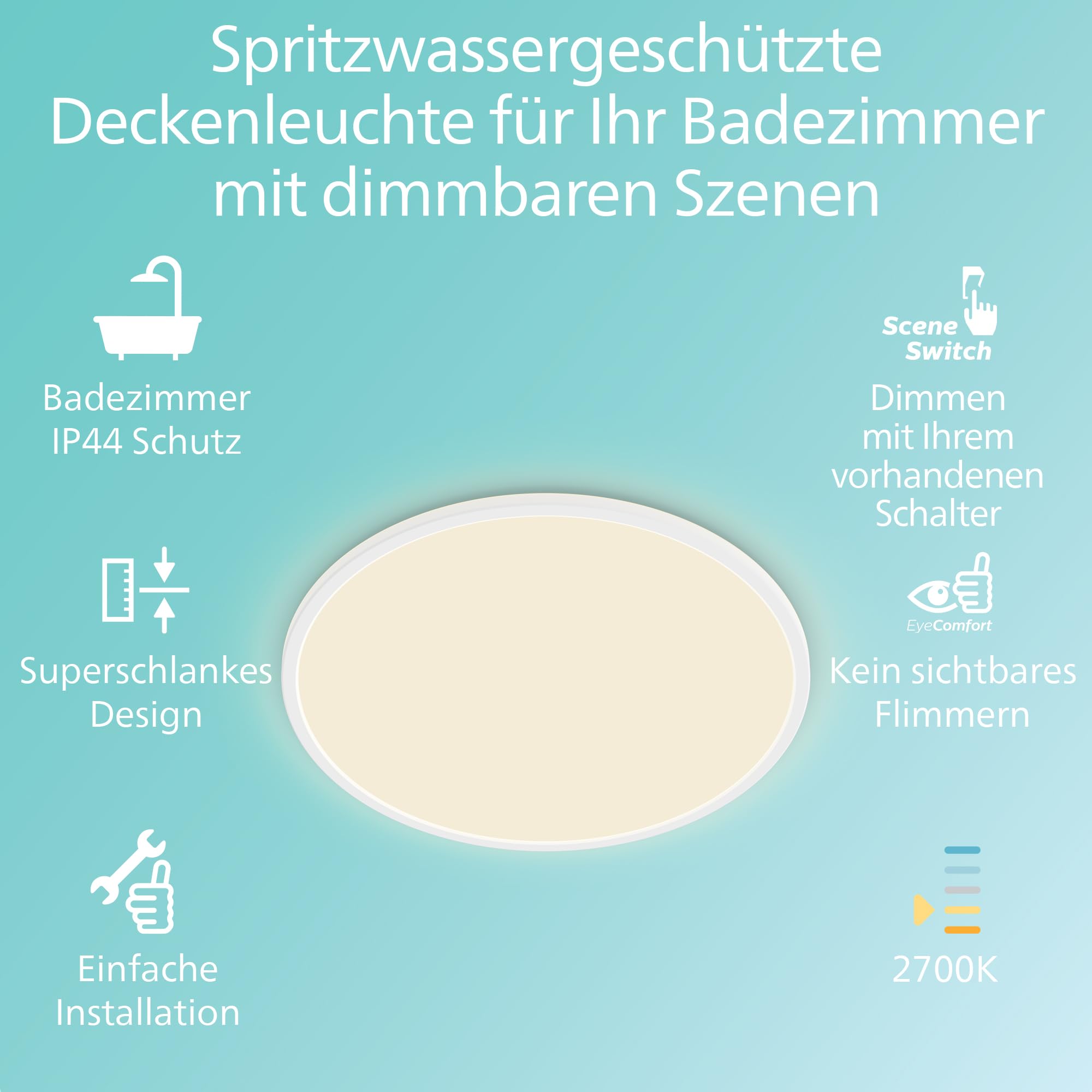 Philips LED – Ein hochwertiges & langlebiges Licht ist die richtige BeleuchtungDie weisse SceneSwitch LED Deckenleuchte erzeugt ein gleichmässiges, einheitliches Licht. Dank des zeitlosen Designs mit runder Form fügt sich die Leuchte in jeden Einrichtungsstil ein und das warmweisse LED Licht mit 2700 Kelvin Farbtemperatur schafft eine gemütliche Beleuchtung zum Verweilen in Wohn- oder Schlafzimmer. Dank Schutzart IP44 ist die Leuchte auch wunderbar als Badezimmerlampe geeignet. Die Deckenlampe kann mit dem vorhandenen Schalter in drei Helligkeitsstufen gedimmt werden. Dabei sorgt das innovative EyeComfort-Siegel von Philips für ein Licht, das schonend für die Augen ist.Die integrierte LED ist im Vergleich zu herkömmlichen Leuchtmitteln nicht nur besonders energiesparend, sondern überzeugt auch durch ihre lange Lebensdauer von bis zu 15.000 Stunden.Die richtige Beleuchtung:Philips LED Deckenleuchte SceneSwitchEyeComfortFarbe: WeissMaterial: Metall, KunststoffDimmbar: JaLicht: WarmweissFarbtemperatur: 2700 KLichtleistung: 1500 lmWattleistung: 18 WSchutzklasse: IP44Masse (L x B x H): 30 x 30 x 2,3 cmLieferumfang: 1 Deckenleuchte inkl. LED integriert