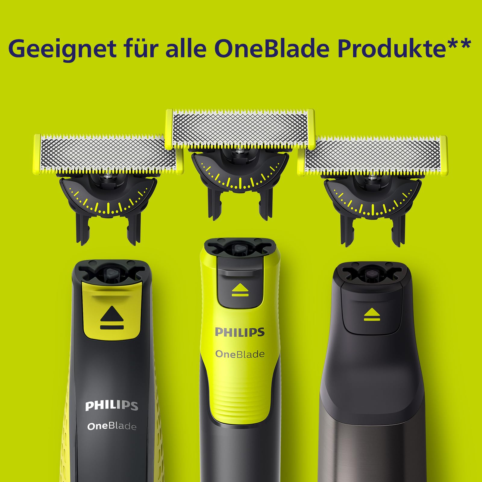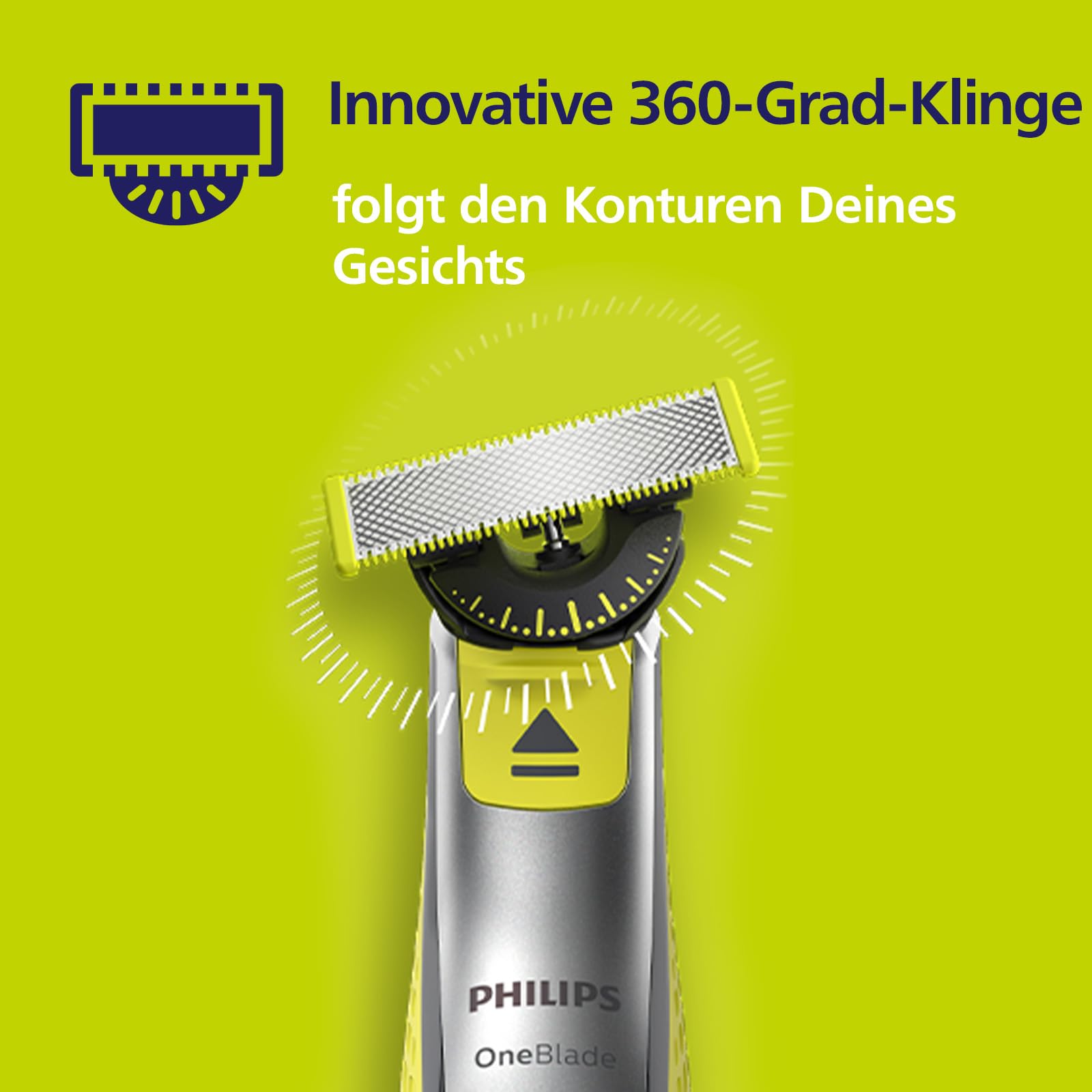 Nie wieder mehrere Schritte und Geräte. OneBlade kann alles. Die Rasiertechnologie verfügt über eine schnell bewegliche Schneideeinheit, die jede Haarlänge schneiden kann. Das Zweifach-Schutzsystem – eine Gleitbeschichtung mit abgerundeten Spitzen – macht die Rasur einfacher und angenehmer. Die innovative 360-Grad-Klinge bewegt sich in alle Richtungen und passt sich den Konturen Deines Gesichts an, sodass konstanter Hautkontakt und gleichzeitig Kontrolle zu jeder Zeit gewährleistet wird. Rasiere, trimme oder style dich einfach selbst an schwer erreichbaren Stellen mit weniger Zügen und mehr Komfort***. Jede Ersatzklinge hält bis zu 4 Monate* und ist mühelos einfach zu verwenden. Du kannst das Produkt nass oder trocken verwenden, mit oder ohne Schaum, Cremes oder Gel oder unter der Dusche. Mit Austauschanzeige: Wenn das Auswurfsymbol auf der Klinge erscheint, ist die Klingenleistung deines Trimmers für Männer möglicherweise nicht mehr optimal. Es ist Zeit, die Klinge auszuwechseln, um eine optimale Rasur zu behalten. Lieferumfang: Diese Klingenpackung enthält Klingen für 4 Monate* (1x 360-Grad-Klinge) *Für ein optimales Rasiererlebnis. Basierend auf 2 vollständigen Rasuren pro Woche. Tatsächliche Ergebnisse können abweichen **Passt auf alle OneBlade Produkte: OneBlade (QP25xx, QP26xx, QP27XX, QP28XX), OneBlade Pro (QP6504, QP653x, QP654x, QP665x) ausser QP1XXX, QI1XXX, QP652x, QP651x, QP662x, QP6505 ***Im Vergleich zur Originalklinge (QP210).