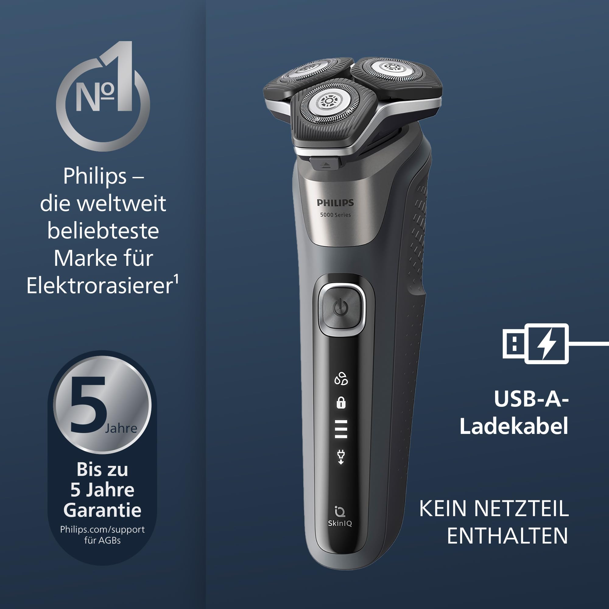 • Von der #1 Elektrorasierermarke¹ mit 5 Jahren Garantie: Der Philips Rasierer Serie 5000 mit SkinIQ-Technologie sorgt für eine angenehme und sanfte Rasur, selbst bei 3-Tage-Bärten