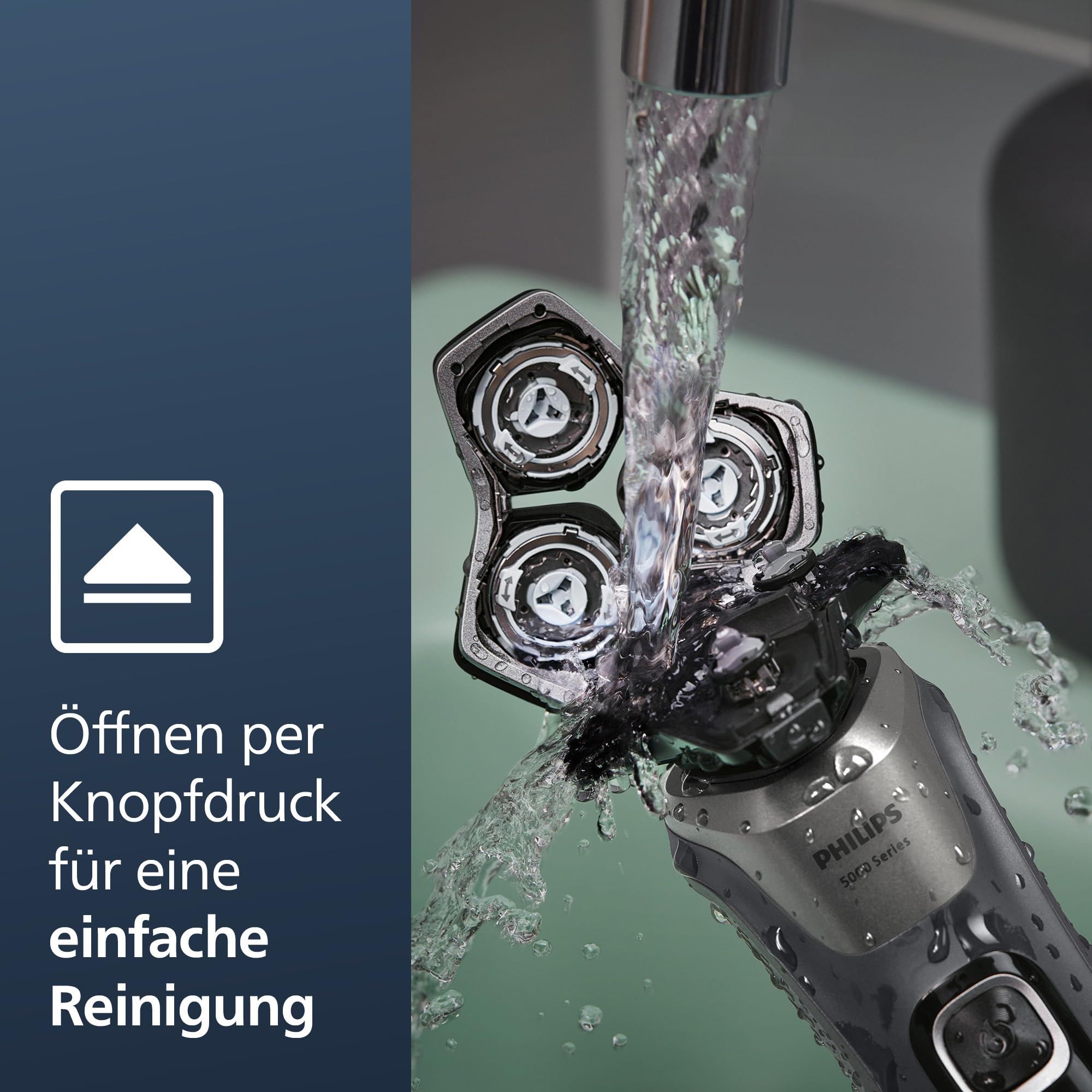 Von der weltweit führenden Marke für Elektrorasierer: Der Philips Series 5000 bietet eine leistungsstarke Rasur und schneidet jetzt noch mehr Haare bei jedem Zug*. Dieser Rasierer ist mit fortschrittlicher SkinIQ Technologie ausgestattet. Er erkennt Ihre Haardichte und passt sich entsprechend an, um Ihre Haut zu schonen. Wir bei Philips fördern Nachhaltigkeit in allen Aspekten der Produktentwicklung. Wir möchten den Abfall sowie die Anzahl der USB-Adapter, die wir verkaufen, reduzieren. Unser intuitives Display zeigt relevante Informationen an und ermöglicht es Ihnen, die optimale Leistung aus Ihrem Rasierer zu holen: Das Display verfügt über eine 3-stufige Akkustandsanzeige, Reinigungshinweise und eine Reisesicherungsanzeige. Im Vergleich zu Vorgängermodellen im Vergleich zur Beschichtung ohne Scherköpfe. Euromonitor International Limiter, Verkaufswert im Einzelhandel, in der Kategorie Körperrasierer, Daten aus dem Jahr 2022, Studie durchgeführt im Dezember 2022.