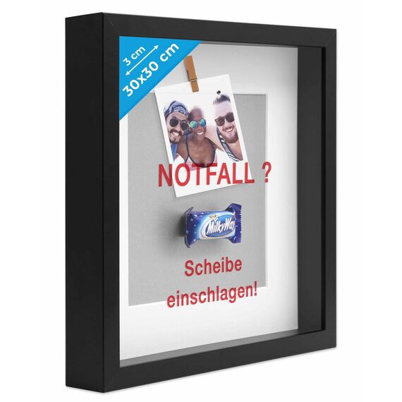 PHOTOLINI 3D Bilderrahmen zum Befüllen 30x30 Schwarz gross, 3 cm tiefer Objektrahmen mit Glas, tiefer Bilderrahmen 30x30 Holz MDF mit Passepartout, Dicker 3D Rahmen befüllbar für Gegenstände Geschenk
