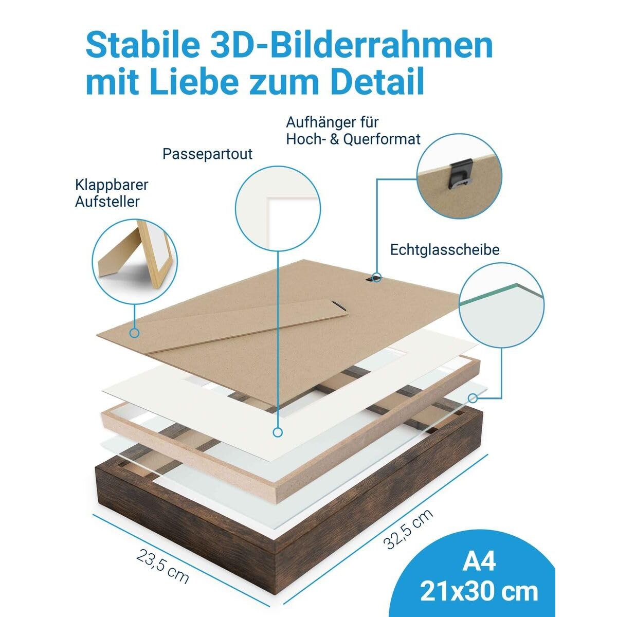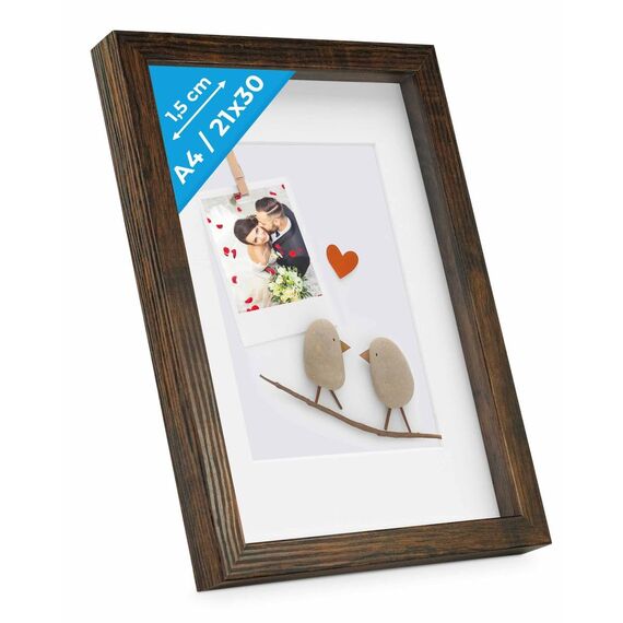 PHOTOLINI 3D Bilderrahmen zum Befüllen 21x30 A4 Eiche dunkel, 1,5 cm tiefer Objektrahmen mit Glas, tiefer Bilderrahmen A4 21x30 Holz MDF mit Passepartout, Dicker 3D Rahmen befüllbar für Gegenstände