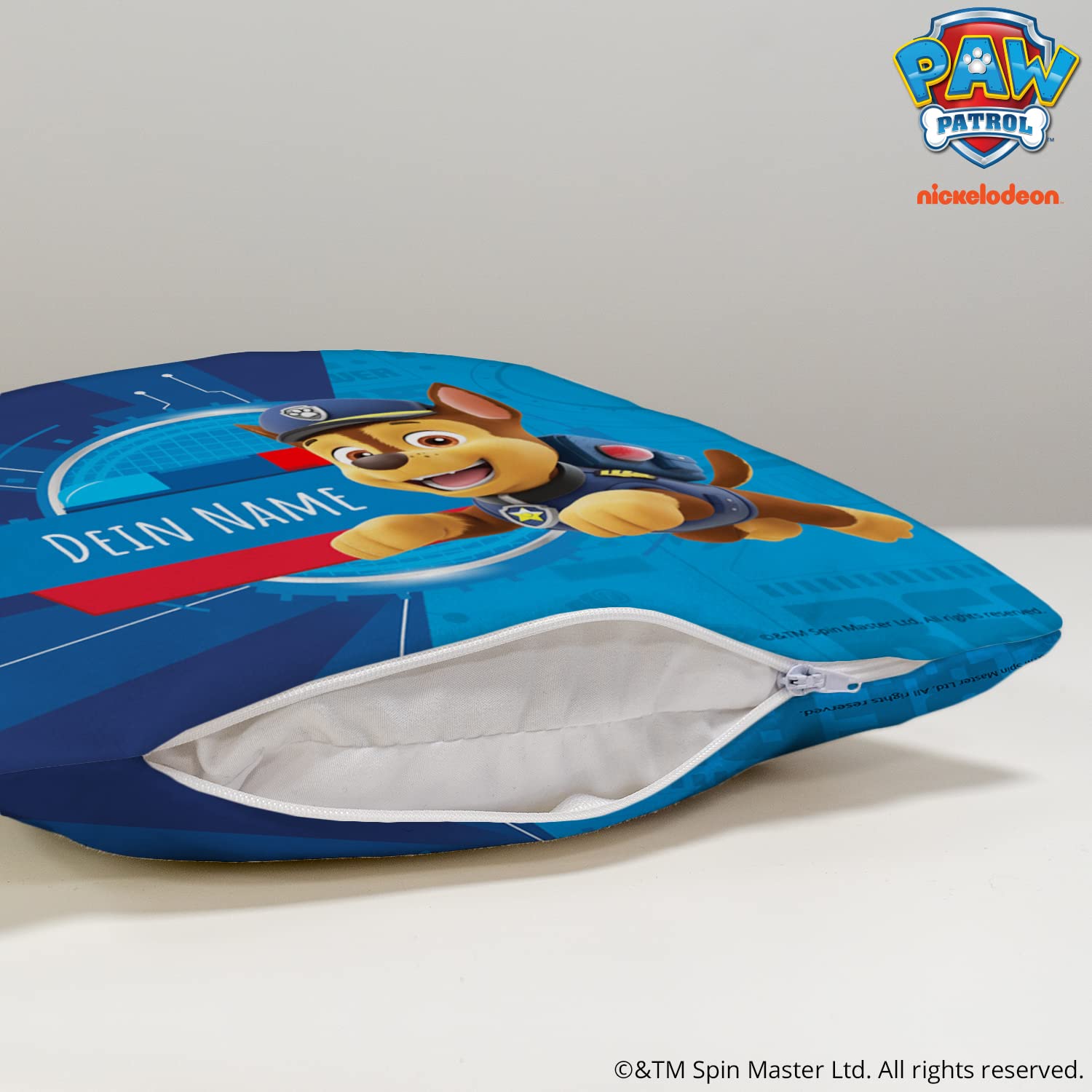 PICANOVA – PAW Patrol Chase Kissen mit Name 30x30cm – mit Füllung – Text individuell Bedruckt – Zierkissen Dekokissen – Schlaf- und Wohnzimmertauglich