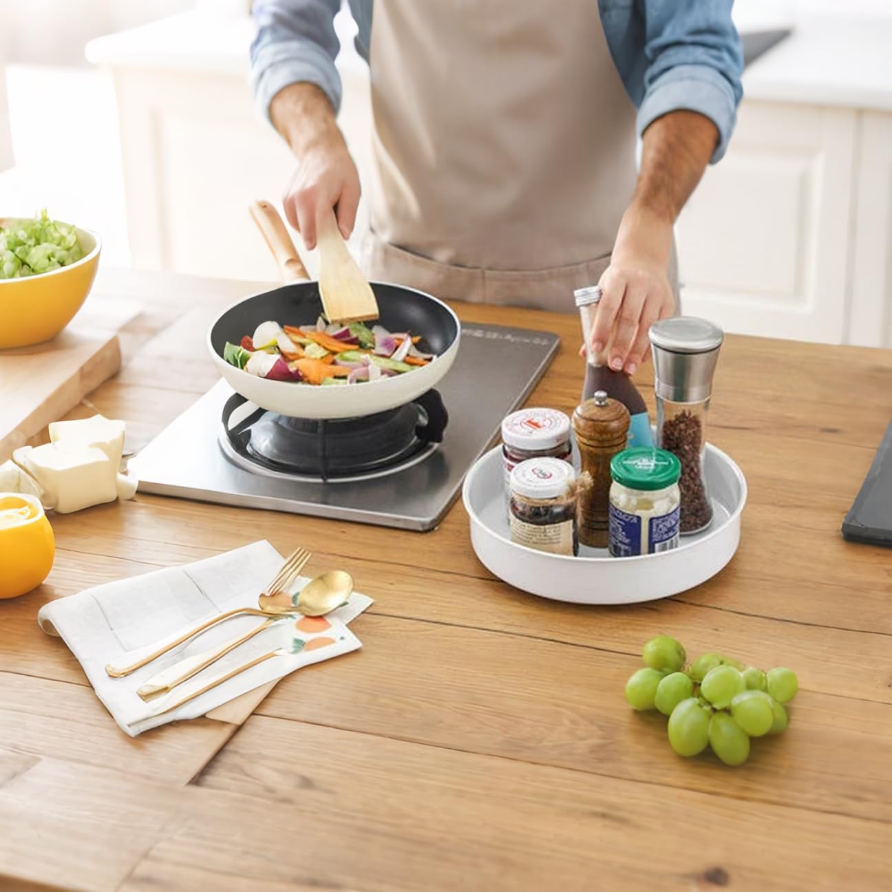Intelligente Verbindung: Dieses Küchengewürzregal kann um 360 Grad gedreht werden. Diese drehbare Basis ist nicht nur in der Küche, sondern auch in anderen Räumen des Hauses, wie Waschküche oder Badezimmer, zu finden. Langlebiges Material: Das Gehäuse der Drehplatte besteht aus 304 Edelstahl, einem wasserdichten und rostfreien Material. Die Kugellager an der Basis bestehen ebenfalls aus Edelstahl, sodass sie Rost verhindern können. Gut organisiert. Der Schrankorganizer kann als Gewürzregal verwendet werden, um das Problem zu vieler unordentlicher Gewürzrührer zu lösen. Ein praktischer Drehteller ist die ideale Aufbewahrungslösung für die Speisekammer auf der Arbeitsplatte oder im Kühlschrank in Ihrer Küche. Platzsparend: Dieses praktische Küchenregal schafft zusätzlichen Platz an schwer erreichbaren oder normalerweise ungenutzten Orten wie Eckmöbeln oder hohen Regalen.