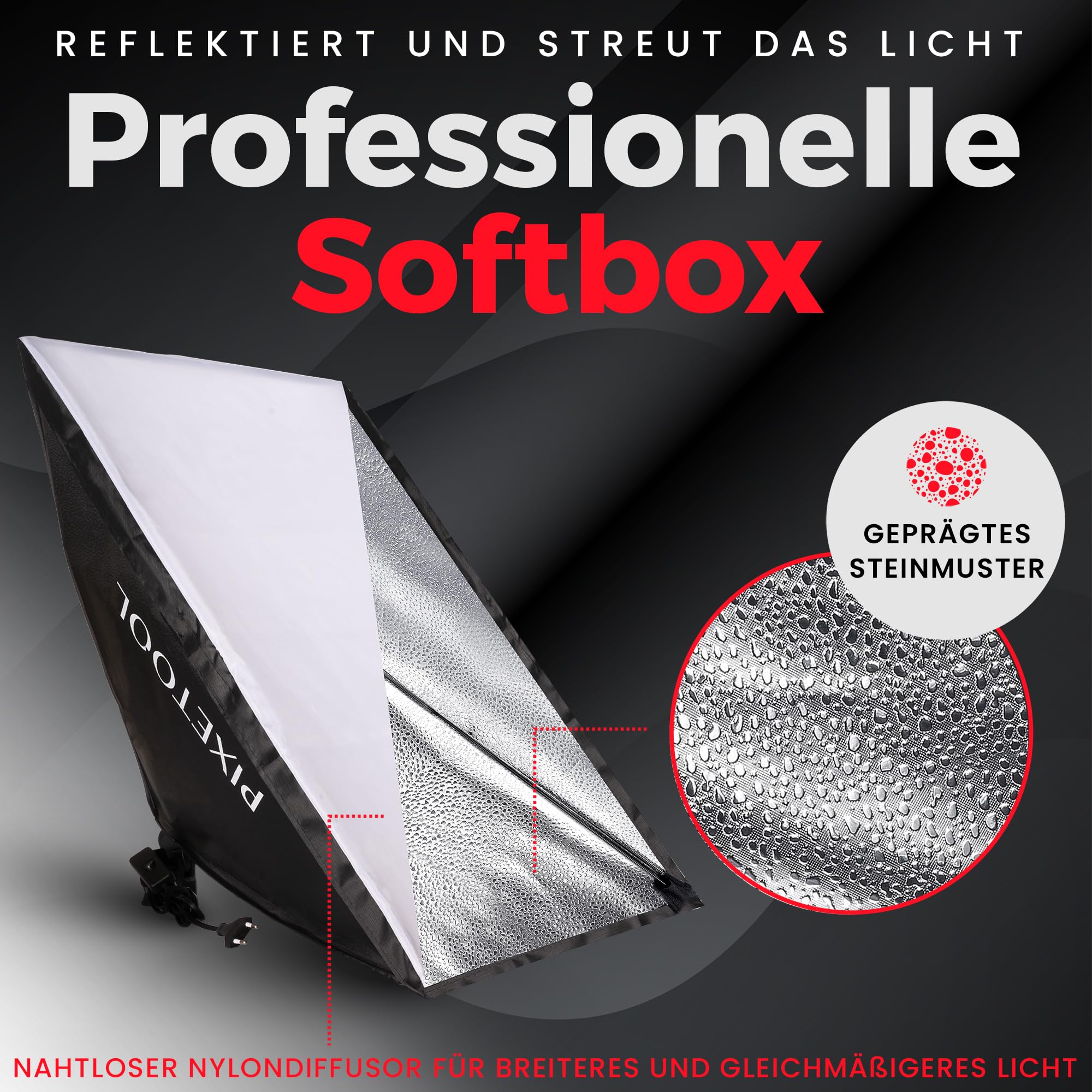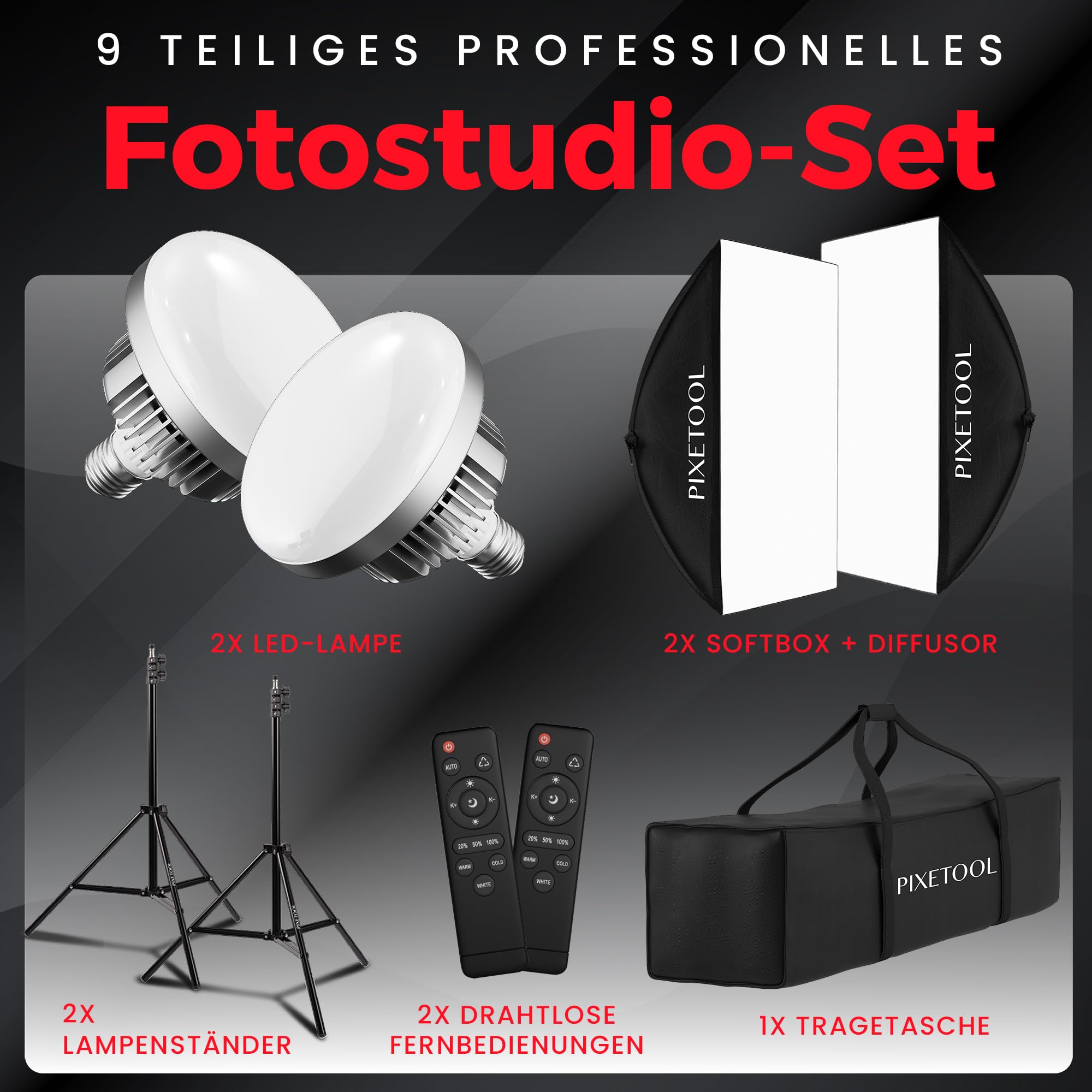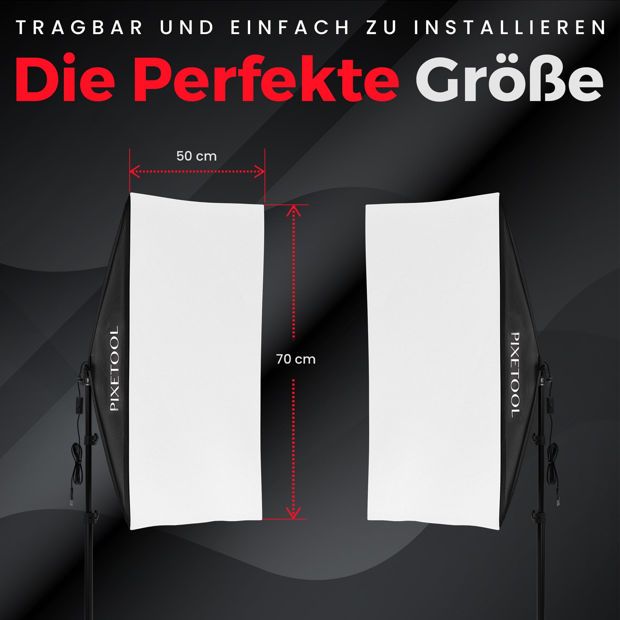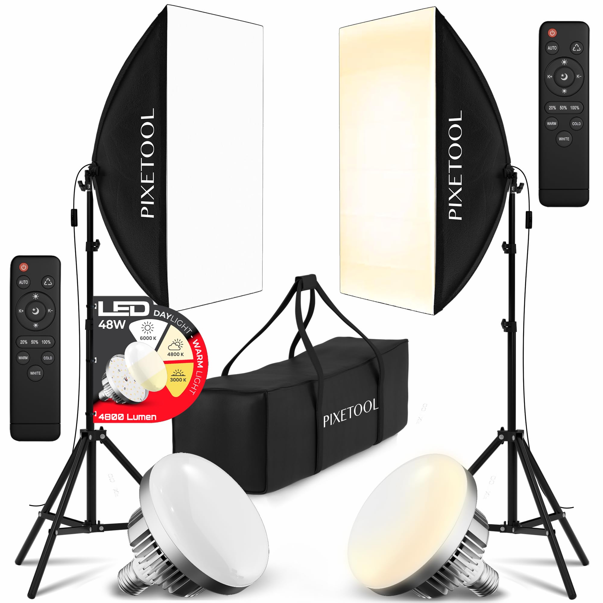 PIXETOOL Fotostudio Set – 2 Softbox 50x70 cm, 2 LED Lampen 4800 Lumen 3000-6000K Licht – Softboxen - Fotolicht Videolicht Fotolampe – Light Streaming Video Fotografie Studiolicht