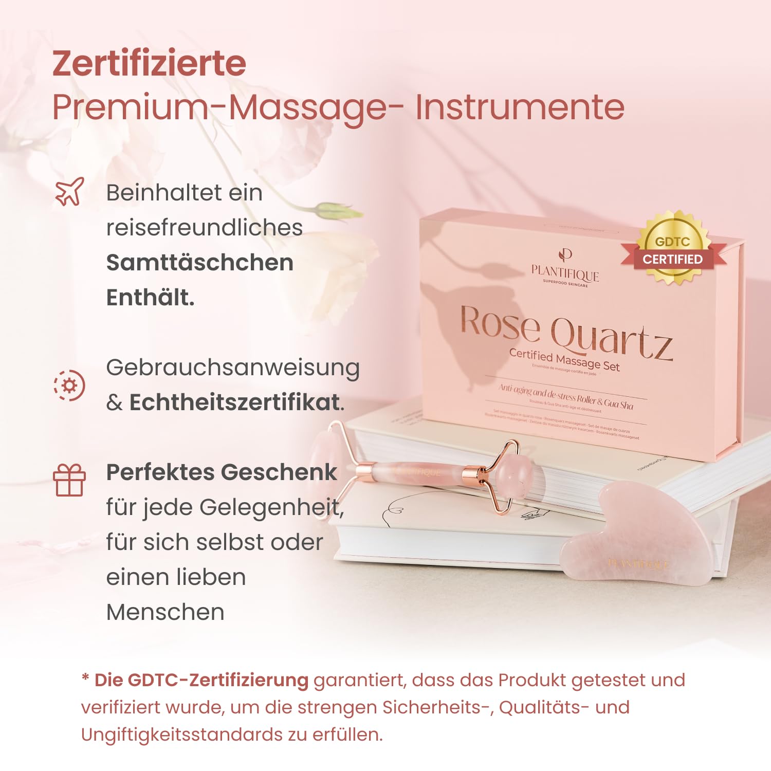 PLANTIFIQUE Rosenquarz Gesichtsroller & Gua Sha Set – Natürlicher Face Roller und Guasha für Gesichtsmassage, Schwellungsreduktion und Hautstraffung