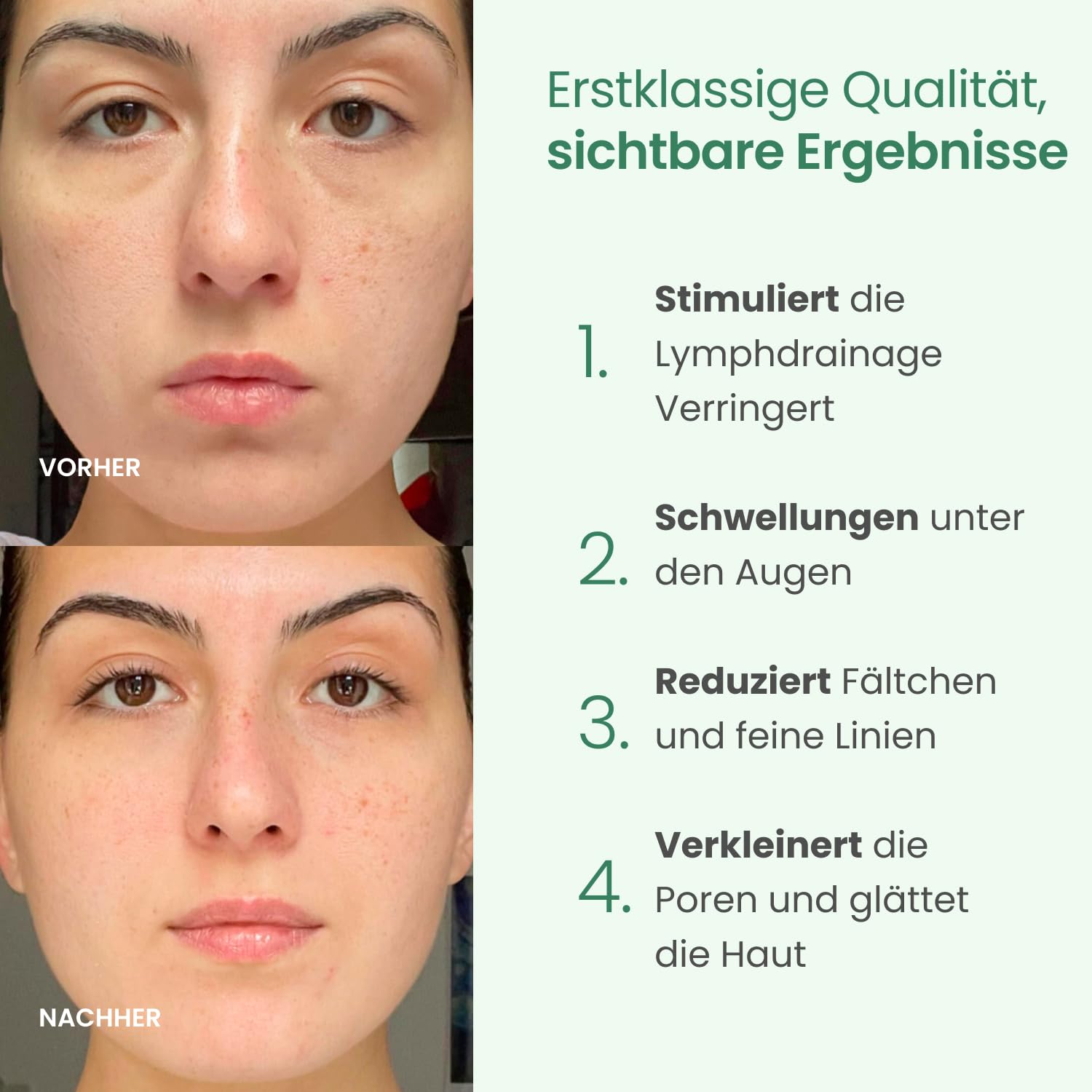 Die Anwendung des Guasha-Steins und der Gesichtsmassageroller hilft, die Haut zu entgiften, feine Linien und Falten optisch zu reduzieren und die natürliche Elastizität zu fördern. Durch sanftes Rollen oder Streichen über Gesicht und Hals kann die Haut beruhigt werden, während die Massage für ein angenehmes Wohlbefinden sorgt. Das Set ist einfach zu verwenden und lässt sich mühelos in Ihre tägliche Pflegeroutine integrieren.