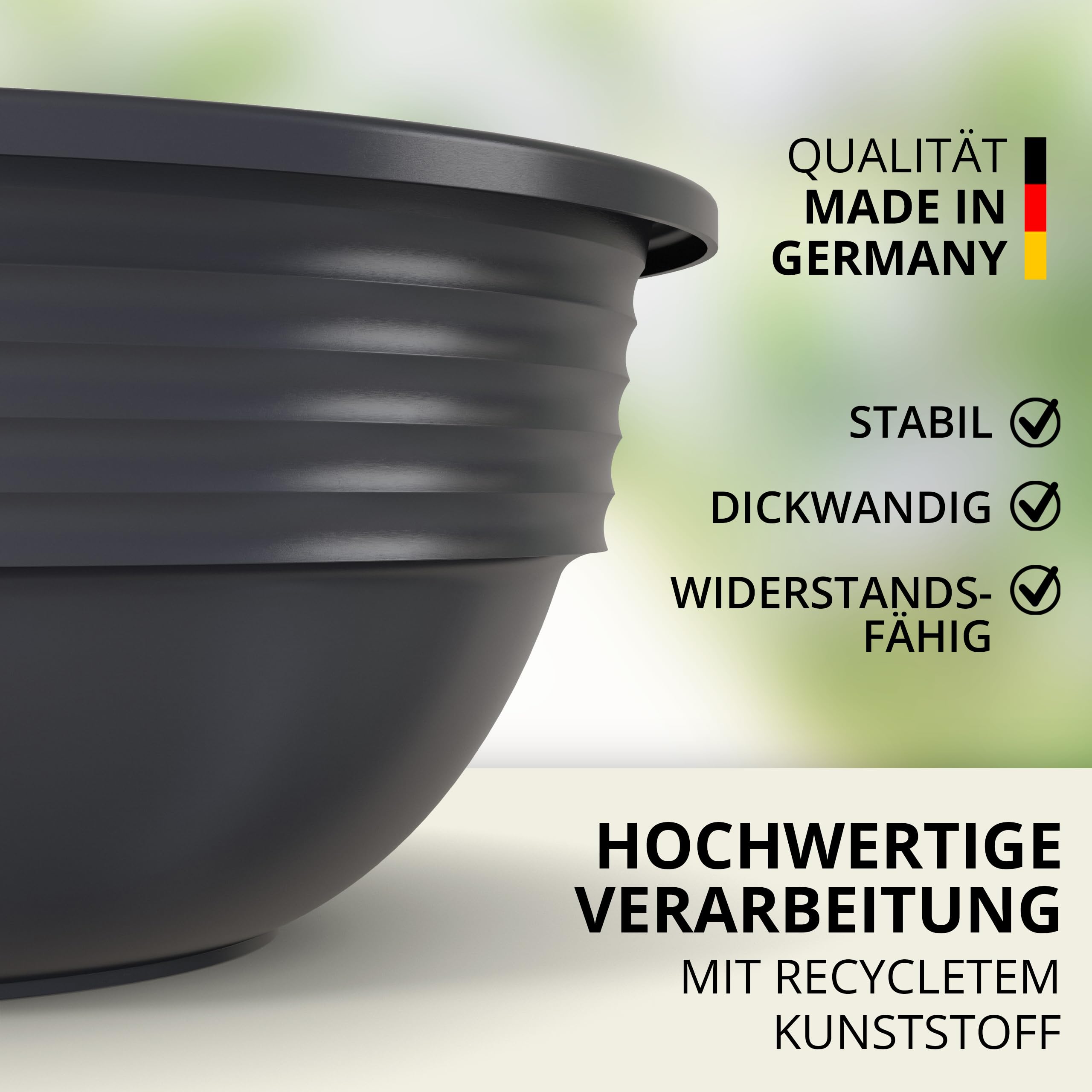 Die langlebige Kunststoffqualität stellt sicher, dass diese Schalen jedem Wetter standhalten. Ganz gleich, ob strahlender Sonnenschein oder erfrischender Regen. Flexibel und leichtgewichtig ermöglichen sie es Ihnen, Ihre grünen Oasen nach Lust und Laune zu gestalten.