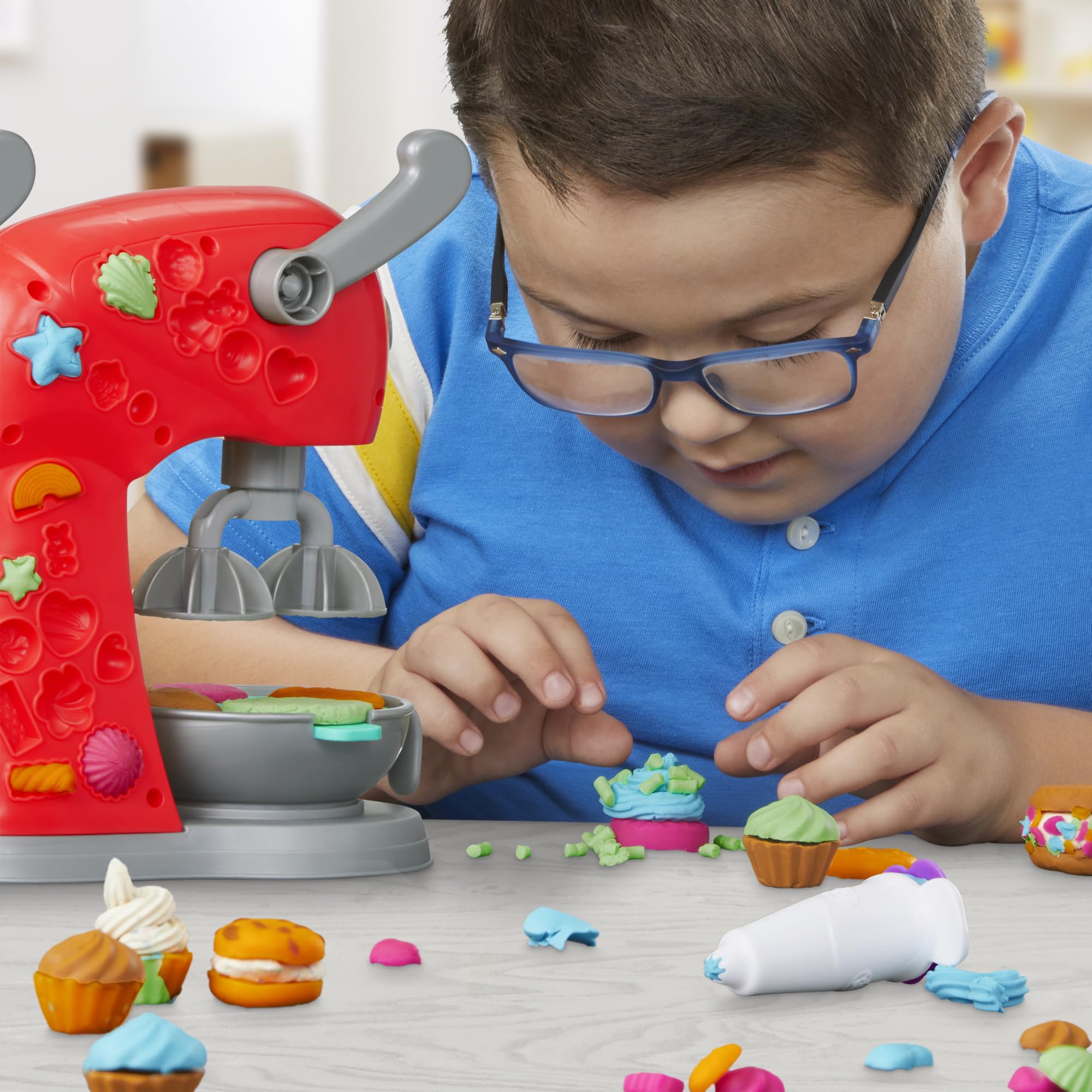 Mit der Play-Doh Kitchen Creations Super Küchenmaschine können kleine Bäckerinnen und Bäcker ihrer Fantasie freien Lauf lassen und kreative Knet-Kunstwerke erschaffen. Ob bunte Kuchen, fantasievolle Cupcakes oder witzige Plätzchen – mit diesem liebevoll gestalteten Küchenspielzeug entstehen immer wieder neue Leckereien aus Knete. Die Küchenmaschine bietet viele Funktionen, die für abwechslungsreichen Spielspass sorgen: Kinder können einen der zwei verschiedenen Aufsätze auswählen, diesen in die Schüssel einsetzen und dann den Hebel betätigen, um verschiedenste Formen und Figuren aus Knete zu stempeln. Mit der enthaltenen Knetspritze entstehen tolle Verzierungen wie Sahnehäubchen, Glasuren oder Toppings. Und wer gerne noch ein bisschen mehr Deko möchte, kann mit den kleinen Löchern im Teigschaber Streusel zaubern. Zusätzlich gibt es an der Küchenmaschine zahlreiche Förmchen, mit denen Bonbons, kleine Figuren und andere süsse Details gestaltet werden können – so wird jedes Knet-Kunstwerk ein echtes Highlight. Dieses umfangreiche Play-Doh Set enthält 284 g Knete in verschiedenen Farben und fördert spielerisch die Kreativität sowie die Feinmotorik von Kindern ab 3 Jahren. Dank der vielen Accessoires und einfachen Handhabung bleibt das Spielzeug lange spannend und bietet immer neue Anreize für fantasievolles Spielen.