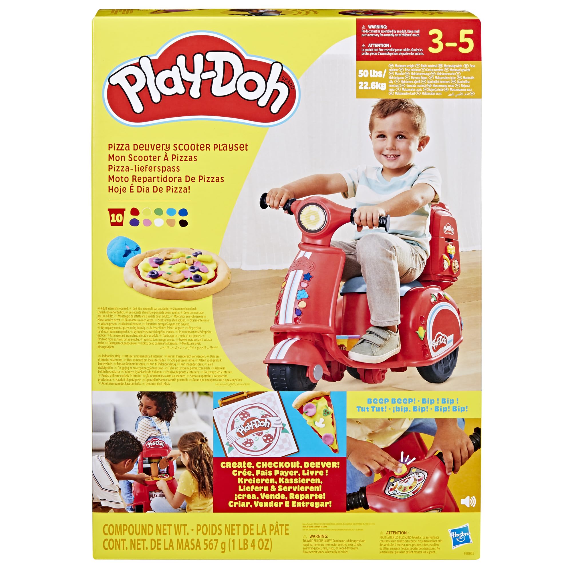 Play-Doh Pizza-Lieferspass, Scooter und Spielküche, 10 Dosen Knetmasse zum Pizza Backen, Bastel-Set inklusive vieler Accessoires und Werkzeuge, kreative für Kinder ab 3 Jahren