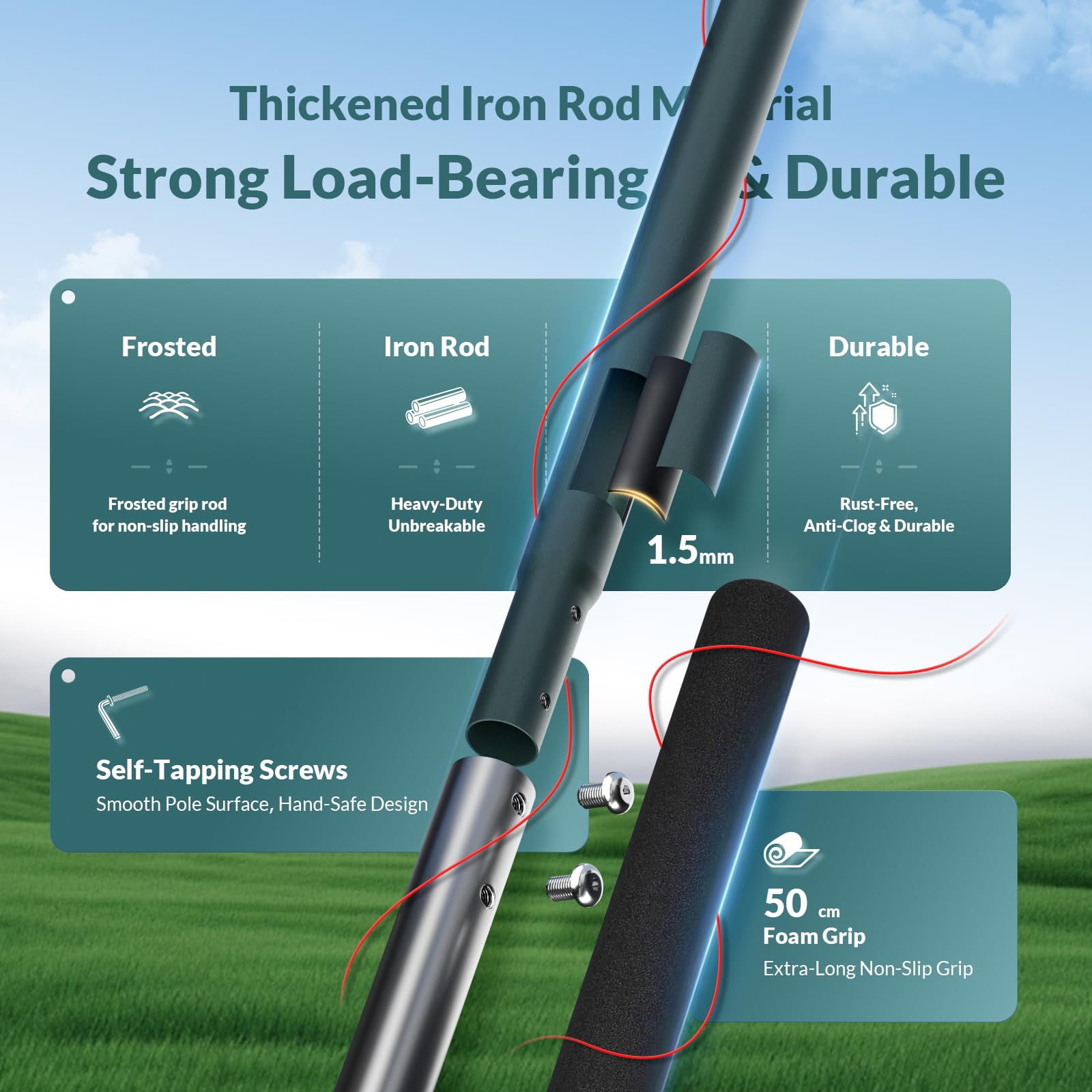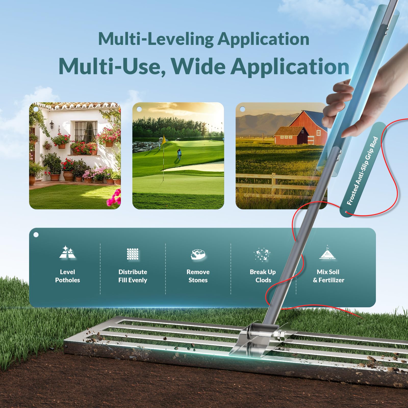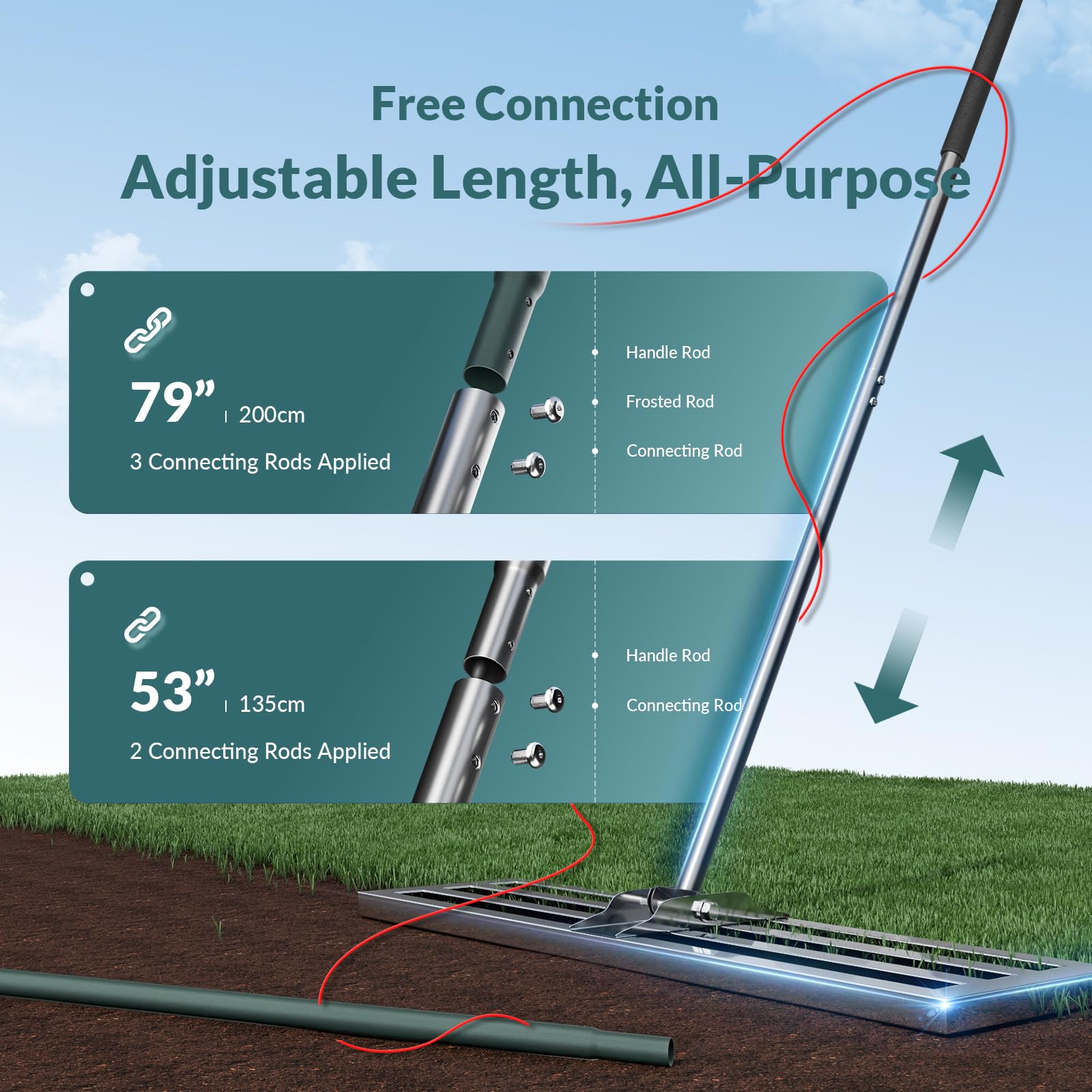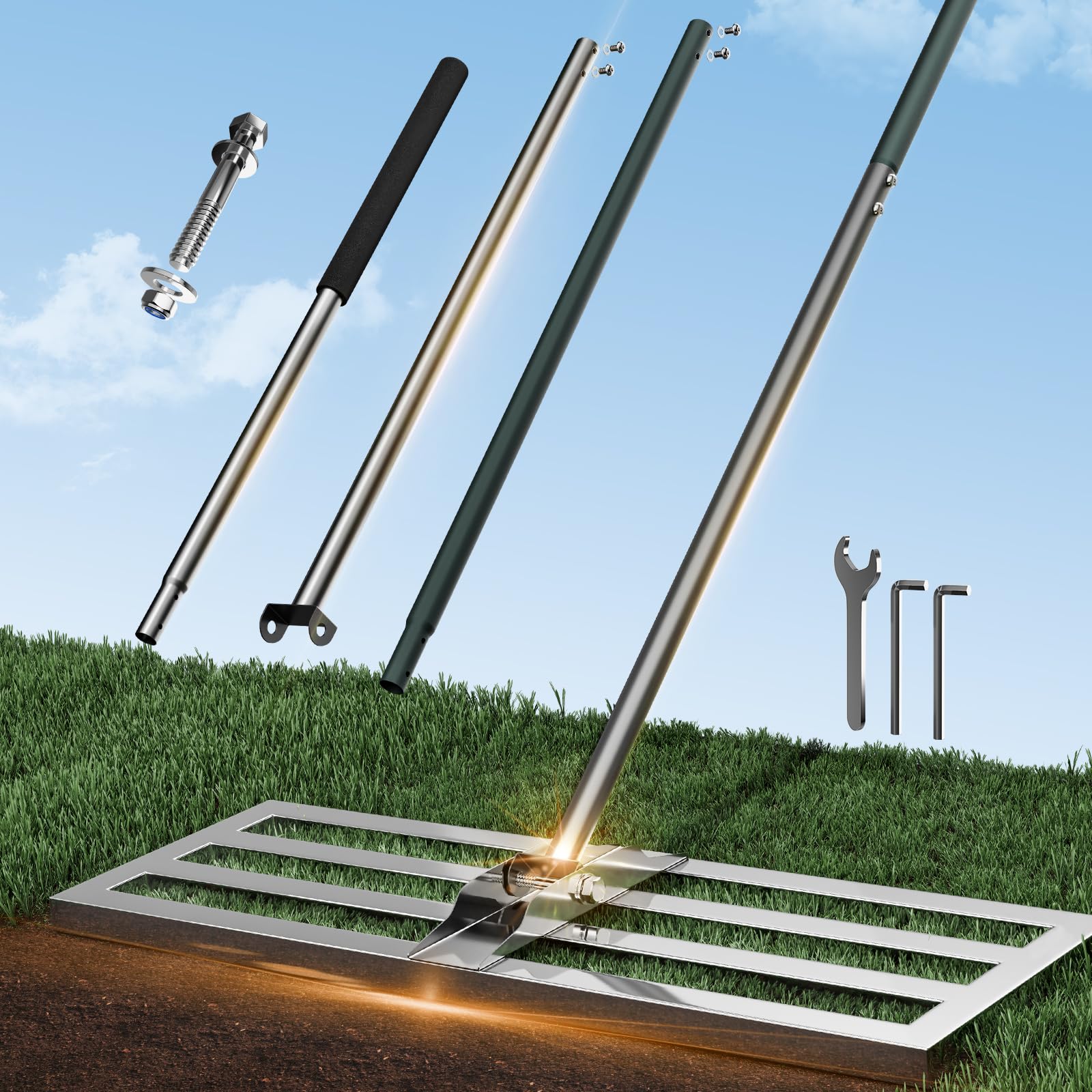 Produktmerkmale: Aus Edelstahl, um Rost zu verhindern. Grifflänge kann reduziert werden. Einfach zu montieren und abnehmbarer Griff. Geeignet für jeden Rasentyp, renovieren Sie Ihren Rasen leicht. Funktionale Eigenschaften: Lassen Sie das Bodennivellierwerkzeug einen grossen Unterschied. Streuen Sie Oberboden oder glatte Erde ungefähr im Bereich des Interessierens. Zerteilen und nivellieren Sie den Oberboden, entfernen Sie Steine und Stöcke, während Sie den Boden auf den Boden drücken. Das Gras OHNE Gras ausreissen