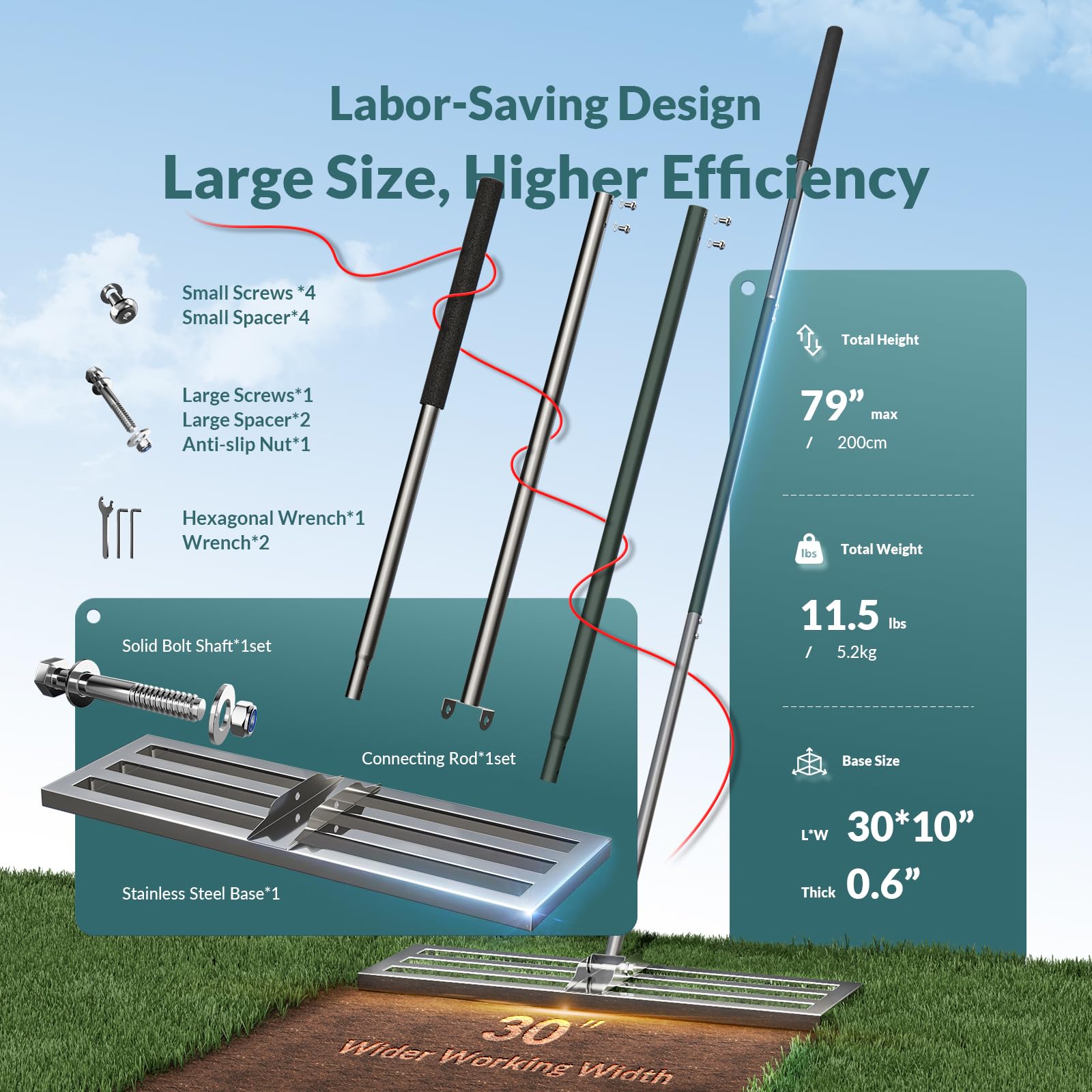 PLBBJH 75*25cm Rasen-Nivellierrechen – Rechen mit vollständig geschlossener Oberseite, strapazierfähiger Rasenausgleicher, kippt nicht so leicht, dicke Stange, Schaumstoffgriff, mattierter Feinkörnung