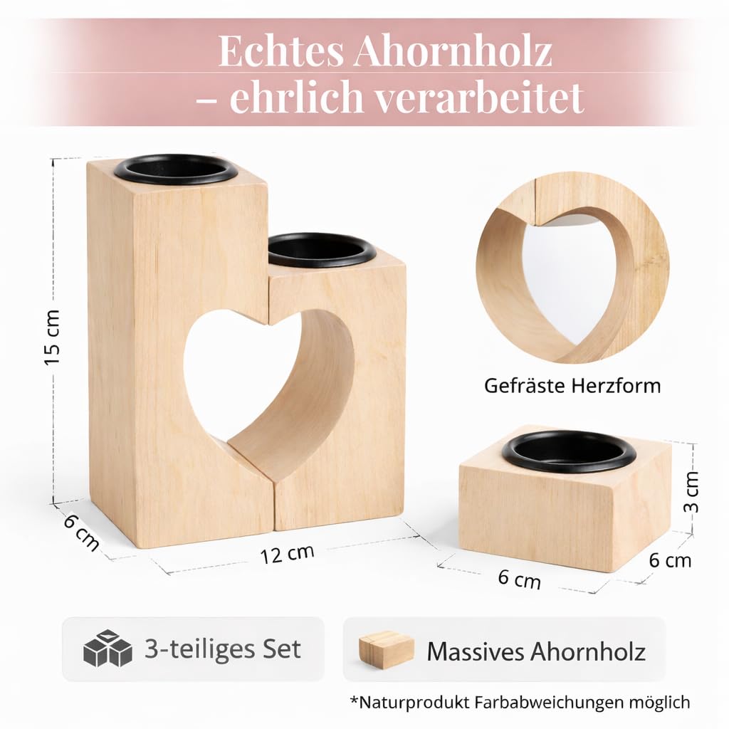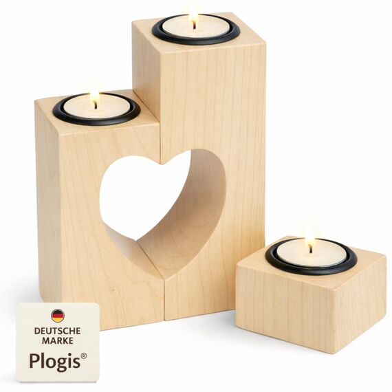 Plogis Herz Teelichthalter aus Holz -Set aus 3 Dekorativen Kerzenständern | Herz Deko & Romantische Kerzen | Geschenk für Freundin, Hochzeit, Familie Muttertagsgeschenk | 15cm Gross aus Ahornholz