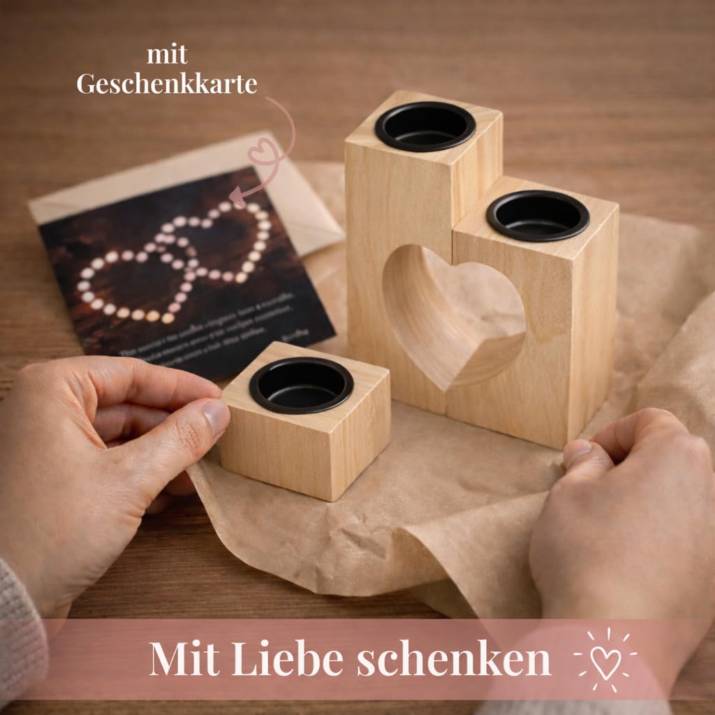 Jedes Stück ein UnikatJeder Kerzenständer wird liebevoll per Hand gefertigt, zusammen mit der natürlichen Maserung des Holzes erhalten Sie ein echtes Unikat mit authentischen Look.Nutzung im Innen- und geschützten AussenraumDie Deko Teelichthalter sind nicht nur für den Innenraum, also das Wohnzimmer, Esszimmer oder Badezimmer geeignet, sondern auch für eine überdachte Terrasse oder einen Wintergarten. Dort zaubern sie gerade in den Abendstunden ein schönes, warmes Licht für eine gemütliche Atmosphäre und werden zum Hingucker!Die Halter aus Holz sollten jedoch vor Feuchtigkeit geschützt werden, da das Material sonst Schaden nehmen kann.Details zum Teelichthalter SetLieferumfang: Set enthält 3 Halter, 3 Teelichter, eine GeschenkkarteGrösse: 15cm x 10cm x 5cm Material: Ahornholz mit metall EinsätzenVerarbeitung: Handgemacht, natürlich, einzigartig Verpackung: Karton + Geschenkkarte