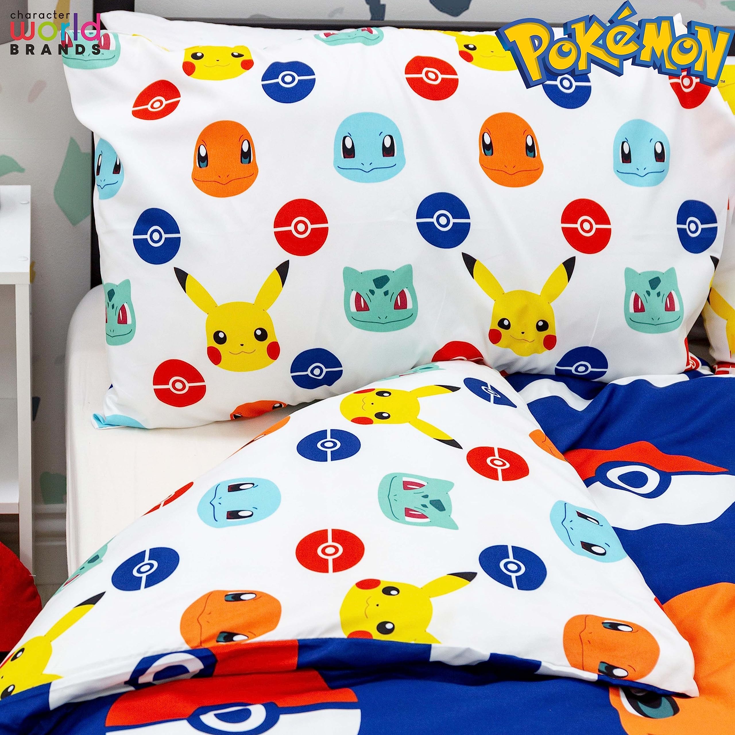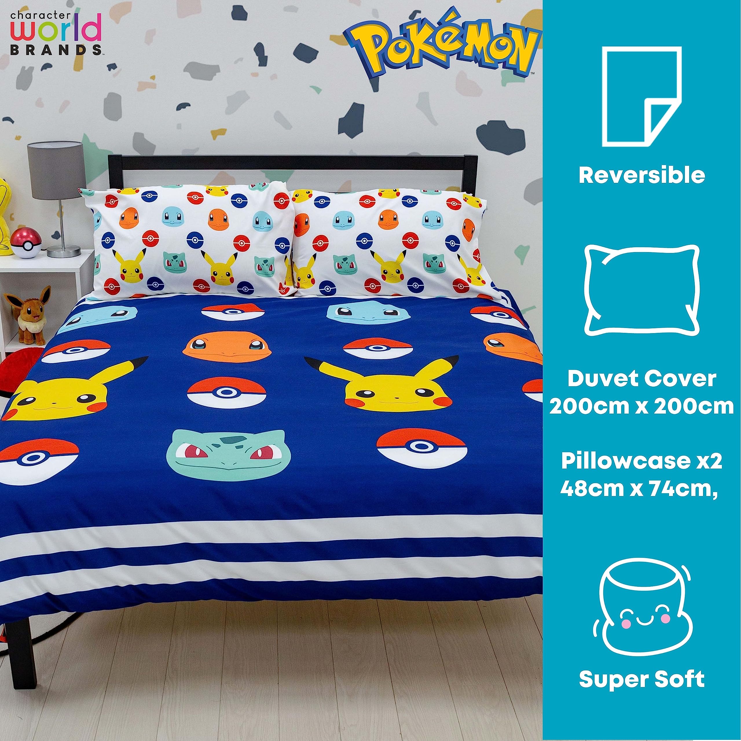Pokemon Offiziell Lizenziertes Bettbezug-Set für Doppelbetten | Pikachu-Abzeichen-Design, wendbare 2-seitige Bettwäsche mit passenden Kissenbezügen | Character World Brands Doppelbett-Set