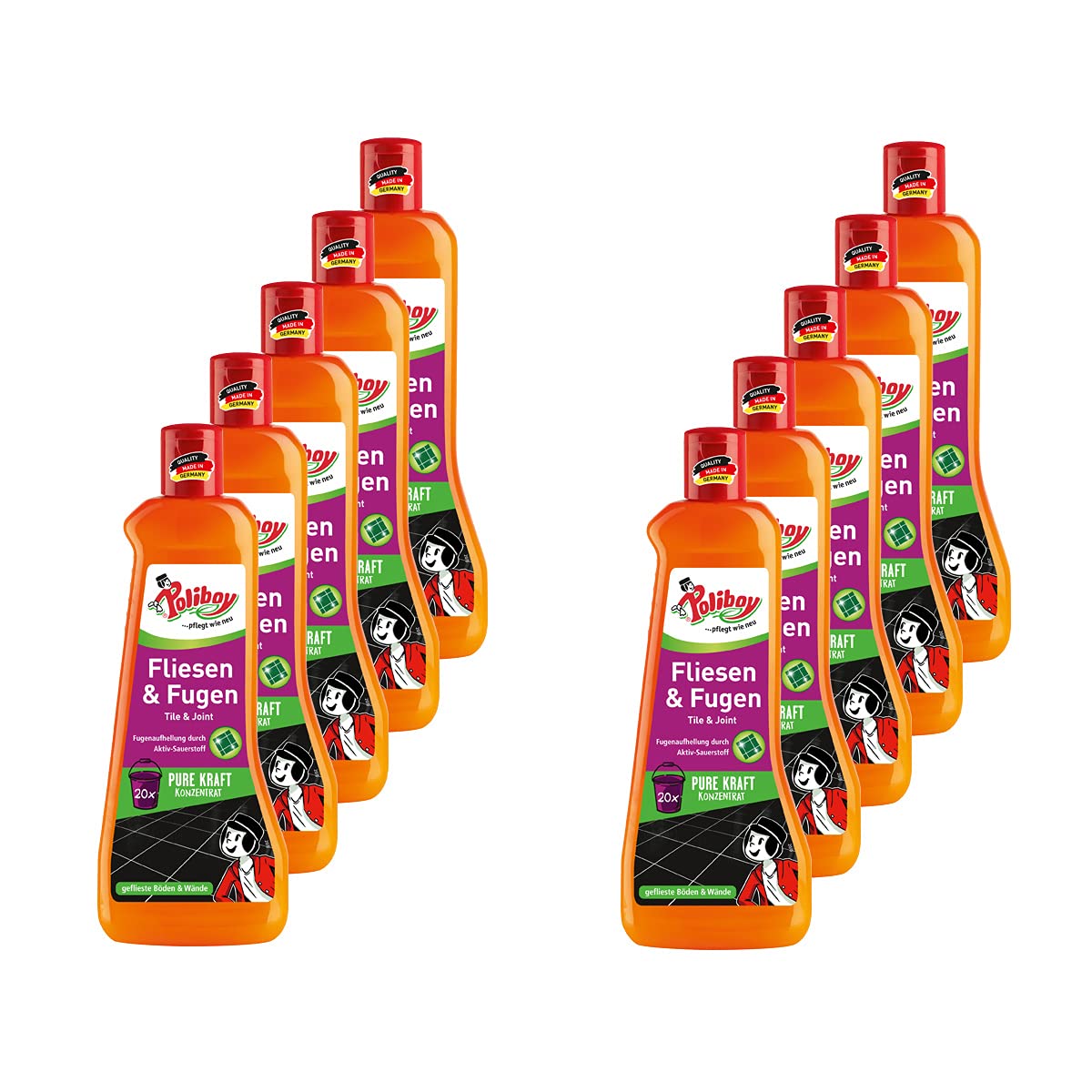 POLIBOY Fliesen & Fugen Reiniger - Bodenreiniger mit Oxy-Power für Fliesen - Wischkonzentrat für innen und aussen - 10x 500 ml - Made in Germany