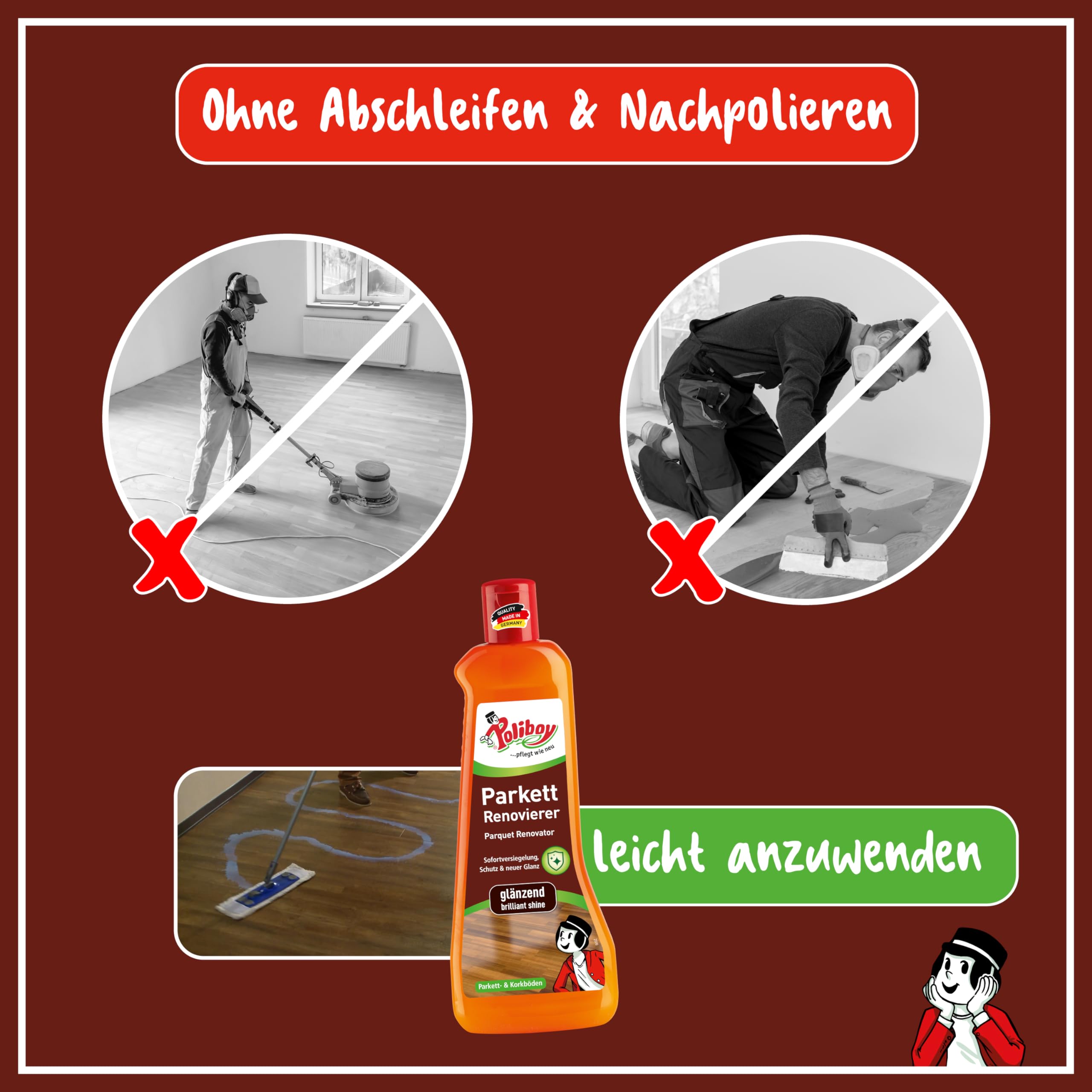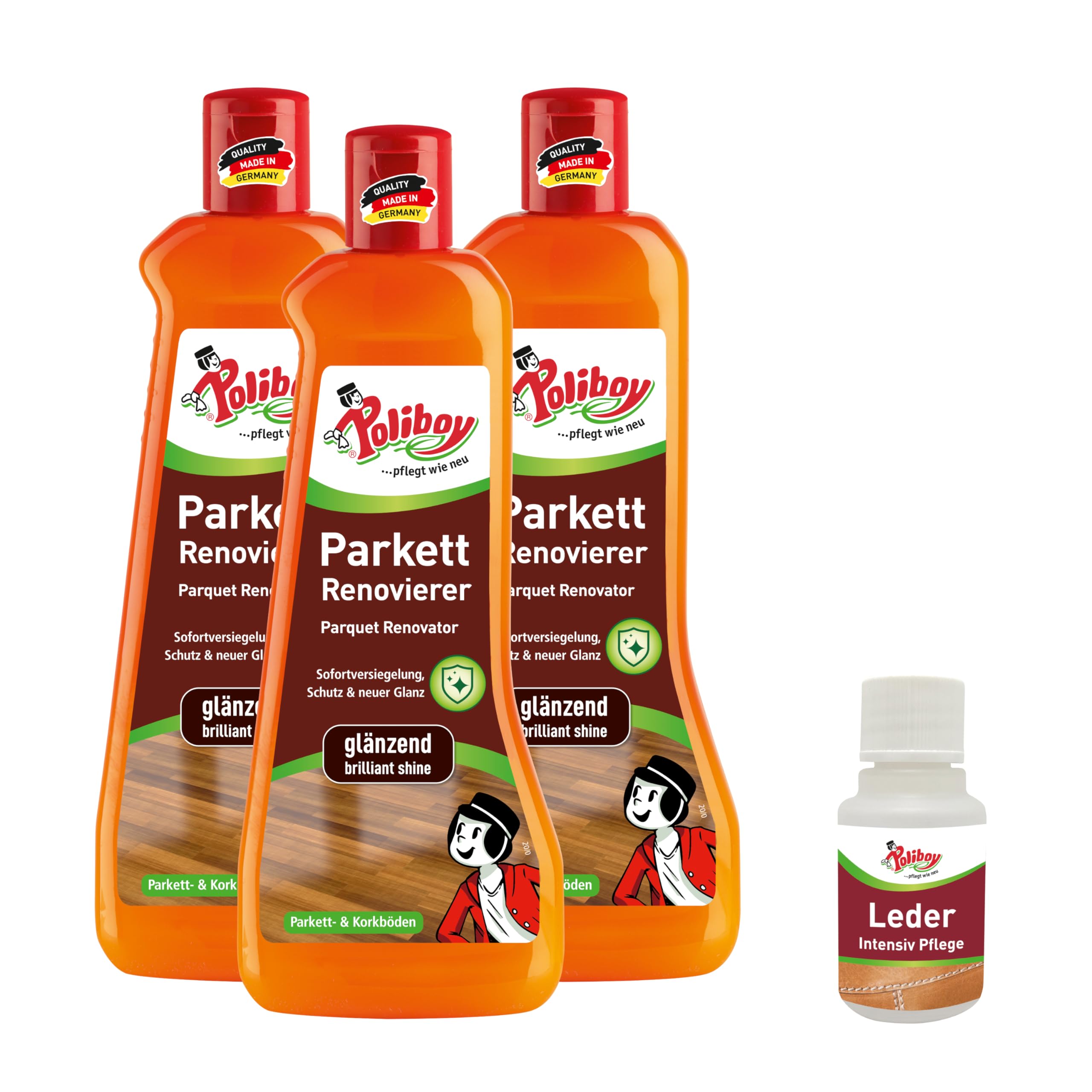 POLIBOY Renovierer glänzend – Parkettaufbereiter für versiegelte Holzböden – Parkettversieglung durch Schutzschicht – Ohne Abschleifen - 3 x 500 ml - Mit Produktprobe - Made in Germany