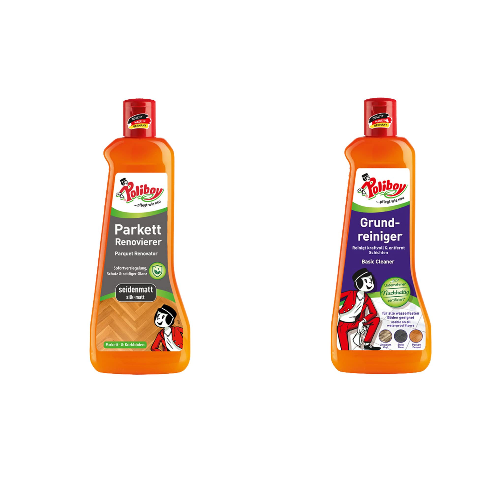 Poliboy Vinyl Renovator + Grundreiniger – Perfektes Set zur Pflege von Vinylböden – 2 x 500 ml (1000 ml) – Made in Germany. Set besteht aus 1 x 500 ml Vinyl Renovator und 1 x 500 ml Grundreiniger – perfekte Ergänzung, um alte, strapazierte Böden aufzufrischen Vinyl Vinyl-Renovierer: alte Möbel, beanspruchtes Vinyl, Vinylböden, Küchenböden, ohne den Einsatz von Werkzeugen oder Maschinen. Neue Schönheit für beanspruchte, alte, gebrauchte, verblasste Vinyl- und Küchenböden, deckt kleine Kratzer und Flecken ab und stellt die alte Farbe wieder her. Ideal für Auszug, Umzug, Altbausanierung, Neugestaltung. Oberflächenreiniger: Einsetzbar auf allen wasserfesten Böden wie Stein, Linoleum, PVC, versiegeltem Parkett und Laminat. Der Reiniger ist nicht für die Anwendung auf unversiegeltem Holz geeignet. Anwendung: Boden vorab reinigen und abwischen. Schütteln Sie die Produkte gut. Wurden zuvor schichtbildende Pflegeprodukte verwendet, entfernen Sie diese mit dem schichtlösenden Kraftreiniger Poliboy Grundreiniger. Tragen Sie den Vinyl-Renovierer direkt unverdünnt auf den sauberen Boden auf. Nicht einwirken lassen, sondern sofort mit einem feuchten Wischbezug gleichmässig verteilen. Gehen Sie abschnittsweise vor und erzeugen Sie einen gleichmässigen Flüssigkeitsfilm. Anschliessend gut trocknen lassen. Ein Qualitätsprodukt von Poliboy: der Klassiker für die Reinigung von Holzoberflächen mit hohen Ansprüchen – millionenfach bewährt und seit Jahrzehnten in Deutschland hergestellt und weltweit im Einsatz: Poliboy – pflegt wie neu!