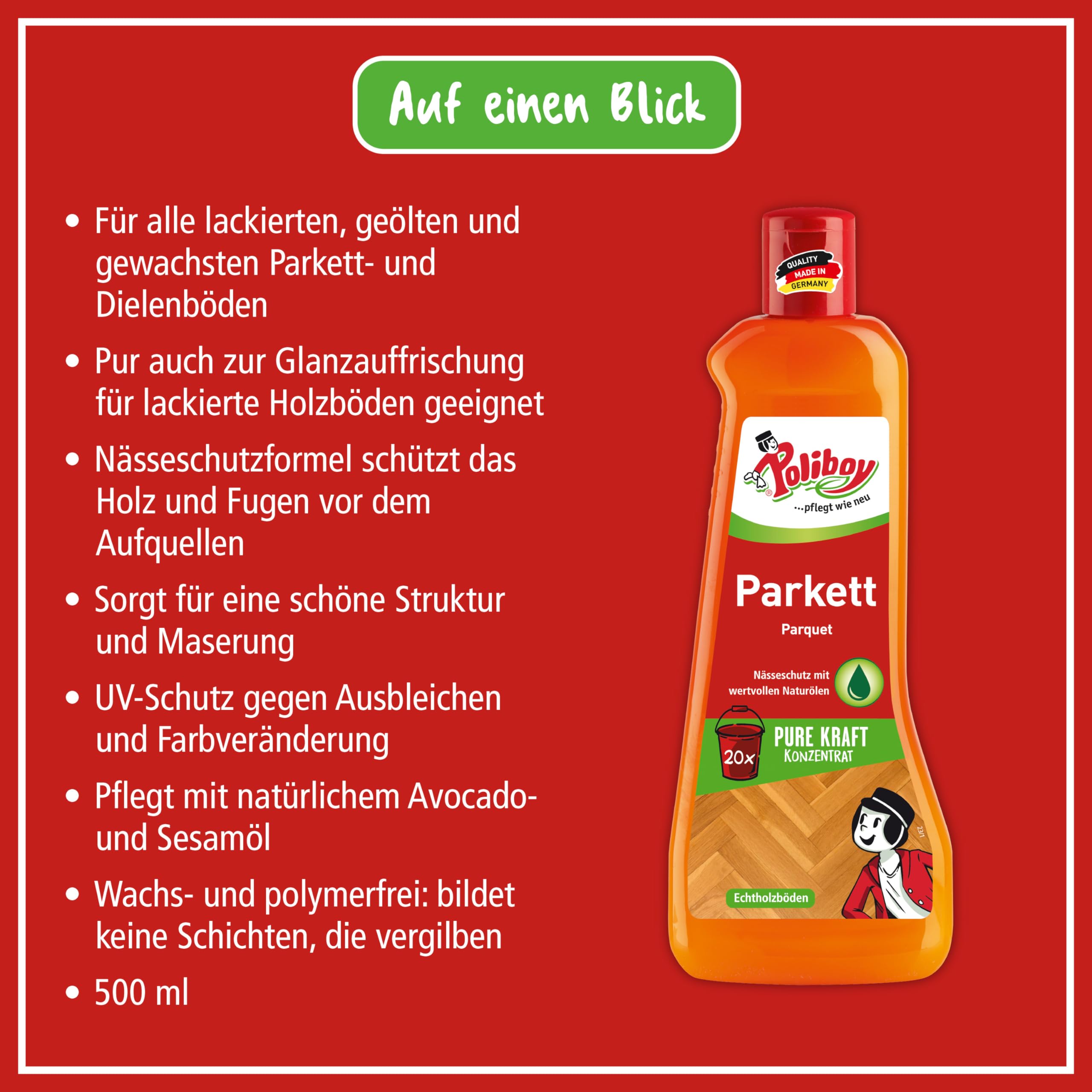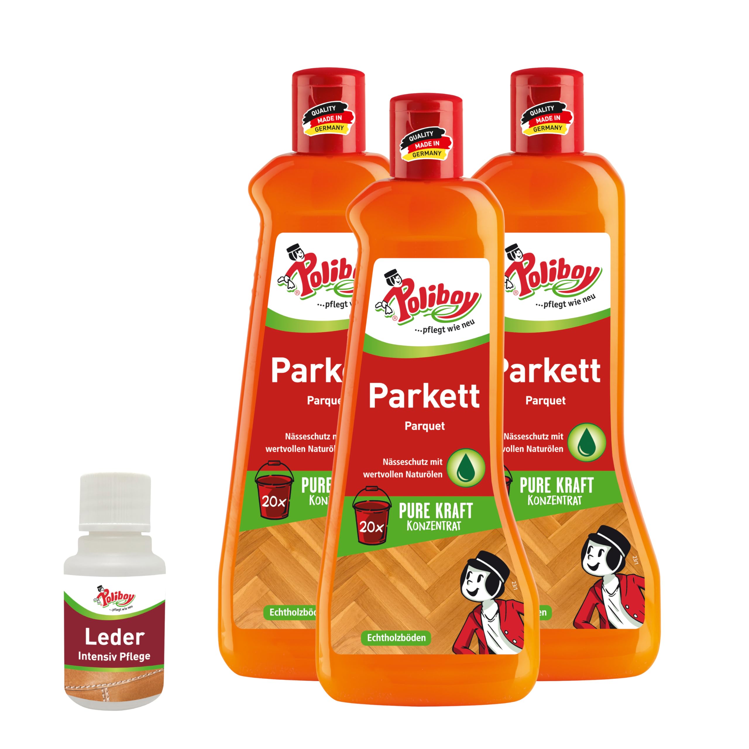 POLIBOY Parkett Pflege - Pflegendes Reinigungsmittel für Holzböden - Reinigungskonzentrat mit Avocadoöl - 3x 500 ml - Mit Produktprobe - Made in Germany
