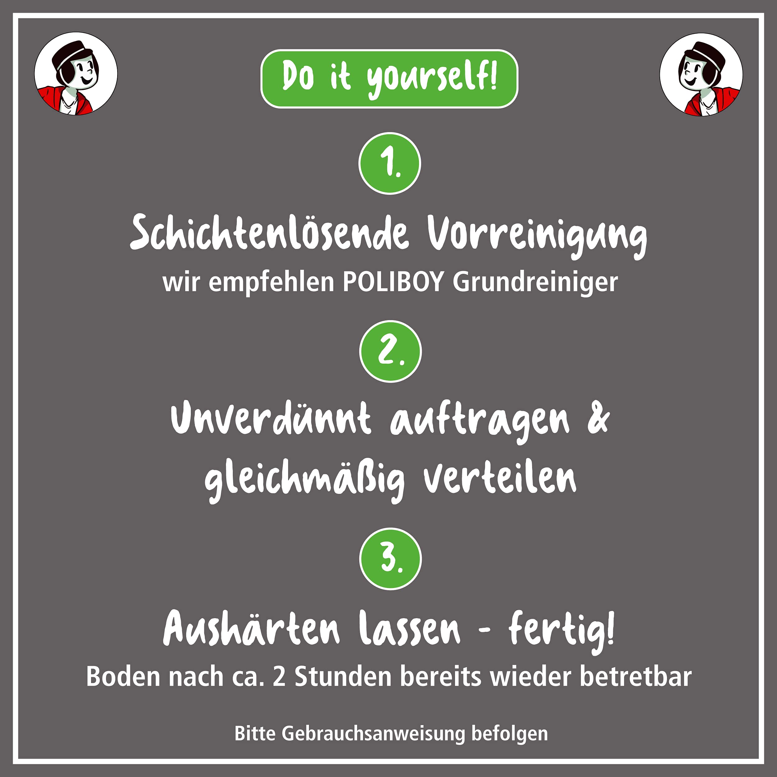 Der POLIBOY Parkett-Renovierer seidenmatt ist eine Produktneuheit für Holz- und Korkböden. Das Produkt greift den Baumarktgedanken „do it yourself “ auf und liefert eine neuartige Lösung für die Ausbesserung von strapazierten Parkettböden: Sofort - Versiegelung ohne Abschleifen, einfach und bequem für jedermann. Beanspruchtes Parkett weist nach einiger Zeit Gebrauchsspuren auf. Die Oberfläche wird stumpf und matt, kleine Kratzer werden sichtbar und die Aufquellgefahr nimmt zu.Der POLIBOY Parkett Renovierer seidenmatt frischt strapaziertes Parkett auf und sorgt für neuen lang anhaltenden Seidenglanz und Schutz - ohne Abschleifen. Der Parkett Renovierer seidenmatt kombiniert die Eigenschaften des Aufbesserns / Renovierens mit denen eines Pflegeproduktes. Die Haltbarkeit der aufgebrachten Schutzschicht beträgt 6 Monate und länger, je nach Gebrauch und Bodenbeschaffenheit. Der POLIBOY Parkett Renovierer seidenmatt ist einfach in der Anwendung und bringt schnell ein überzeugendes Ergebnis. Einfach auf den gereinigten Boden auftragen, gleichmässig verteilen und abtrocknen lassen.