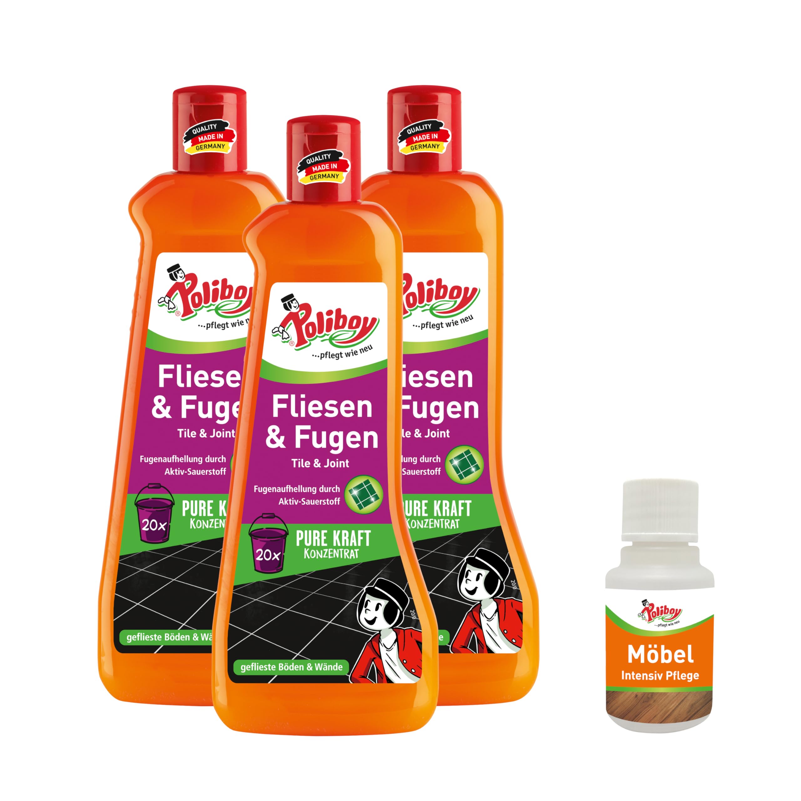 POLIBOY Fliesen & Fugen Reiniger - Bodenreiniger mit Oxy-Power für Fliesen - Wischkonzentrat für innen und aussen- 3x 500ml - Mit Produktprobe - Made in Germany