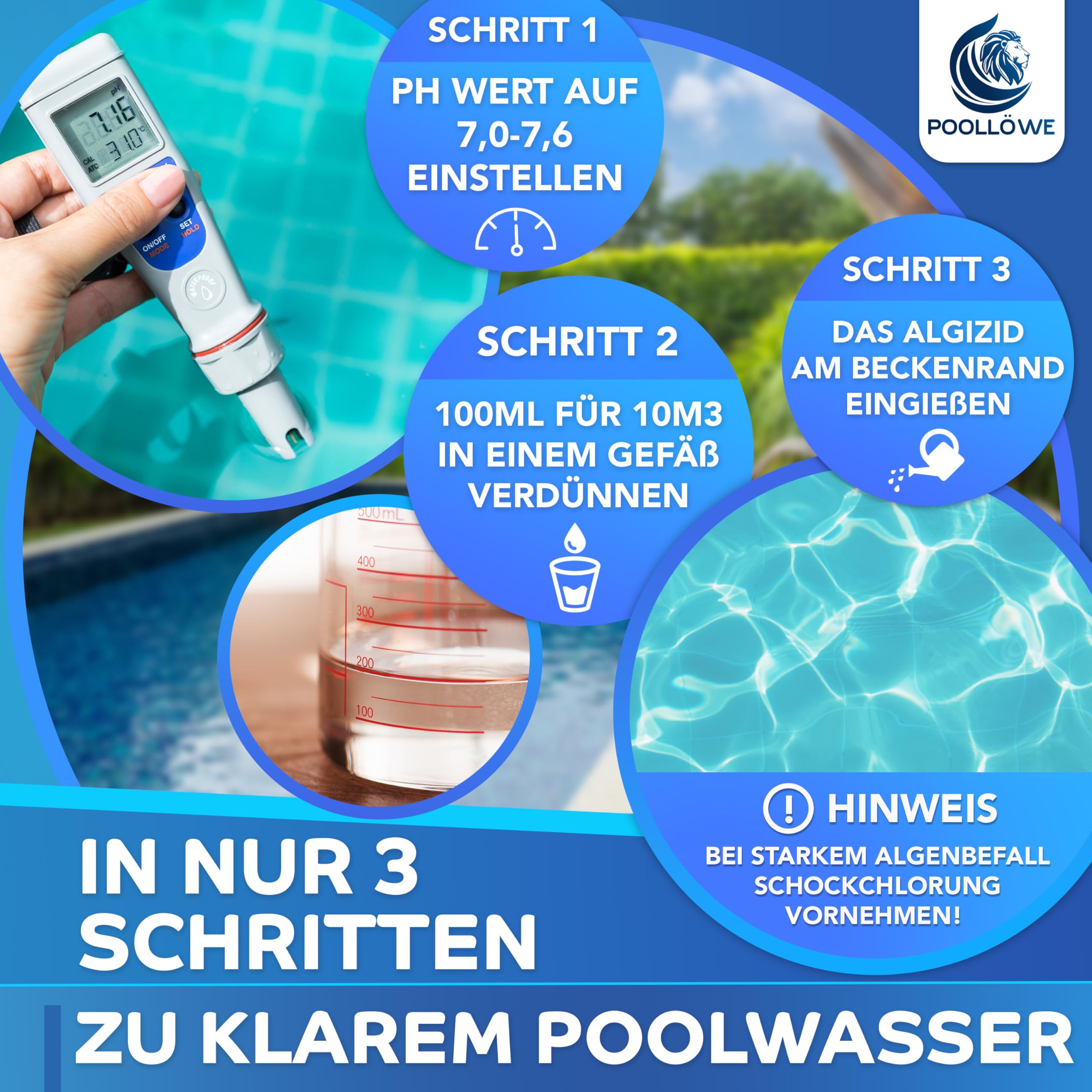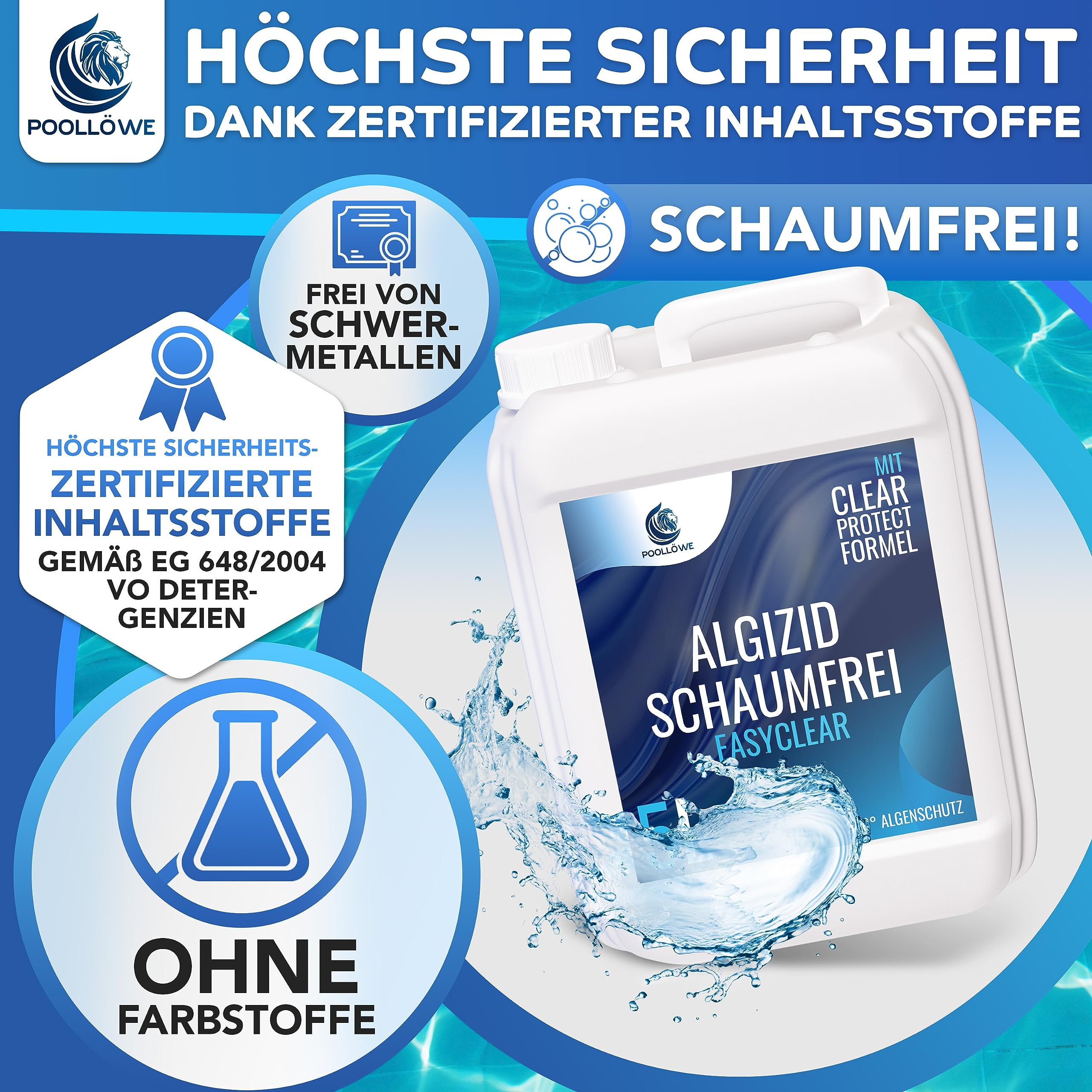 PoolLöwe® Algenvernichter Pool mit Klareffekt 2.0 und [360° Algenschutz] | Algizid für Pool flüssig 5L | Maximaler Algenschutz für Schwimmbad & Whirlpool | Algenfrei Algenmittel Algezid Poolklar
